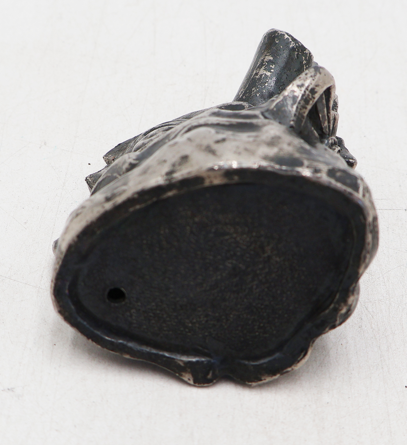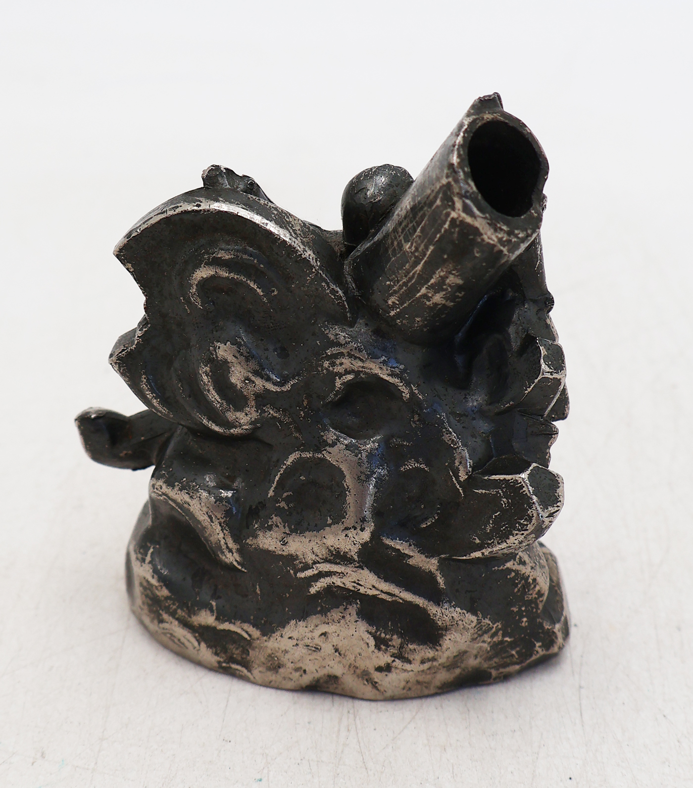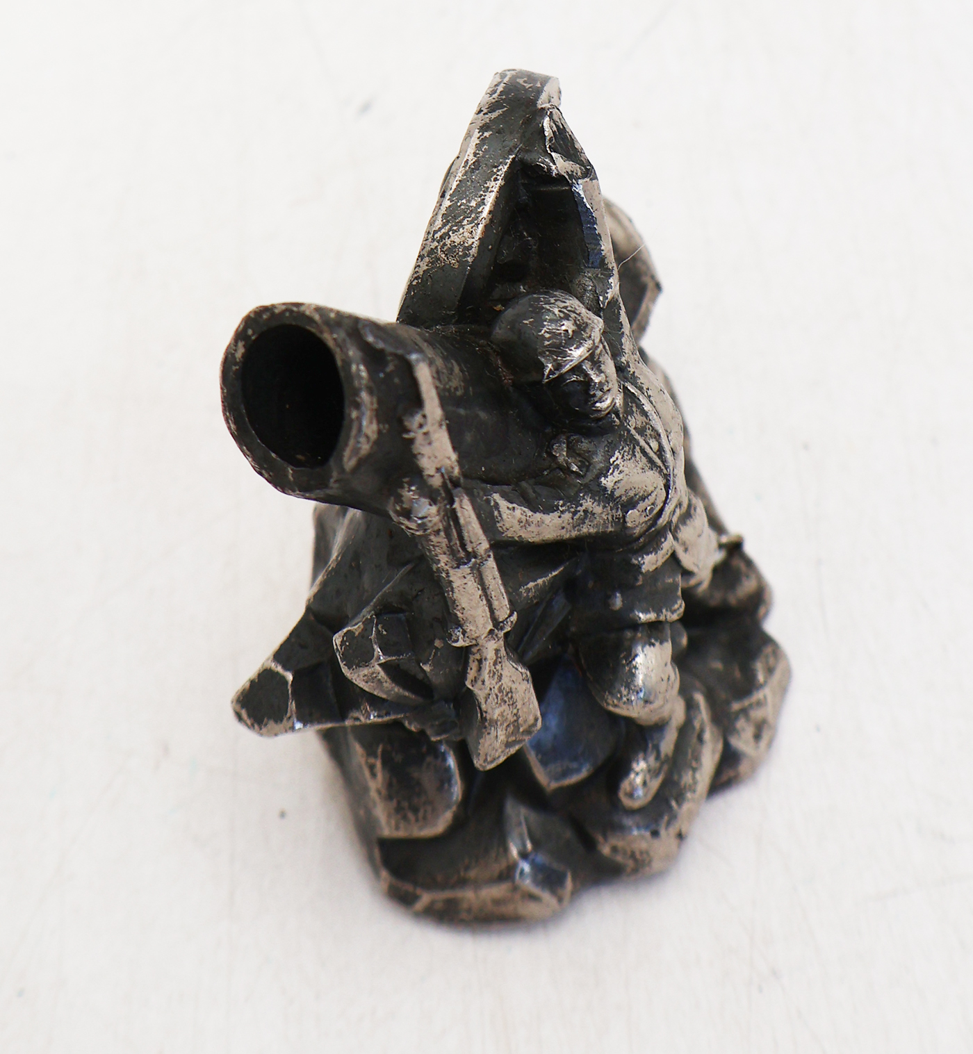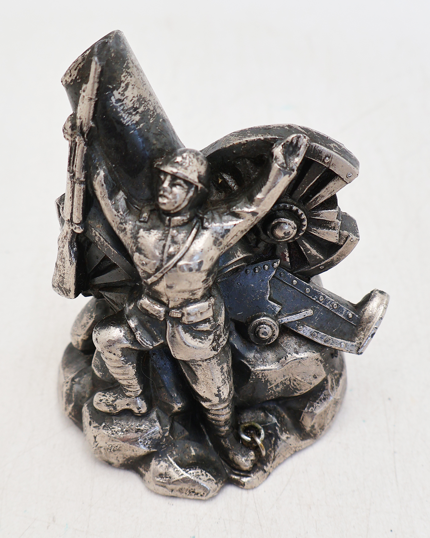 WWII Imperial Japanese Army Patriotic Pen Holder. About 2 1/2 inches wide and 3 1/2 inches tall. Pewter like finish. Shows a scene of a soldier waving his arms in front of a smashed artillery piece. The barrel of the artillery piece is where the pen is held. Piece is clean and in good condition.