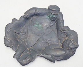 Russo-Japanese War Anti-Russian Ash Tray. Stamped metal body. Shows Japanese soldier in hand to hand combat with a Russian soldier. Some minor wear from age. No dents or damage. Roughly 5 inches across. This piece is way cooler then it shows in photos.