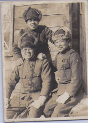 WWII Japanese Army Soldiers In China Photo. About two by three inches. Black and white. Shows three soldiers in China Front uniforms sitting in front of a building. Across two of them it looks like names were written. Has characters on the reverse.