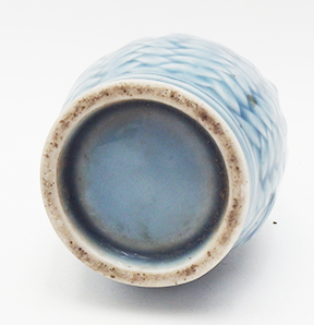 Japanese Army Discharge Sake Bottle. Porcelain body with a blue glazed finish. Has a flower image. Shows minor use around rim and base. Great shape.