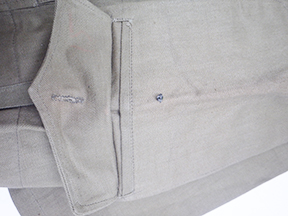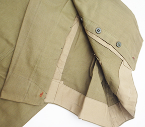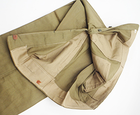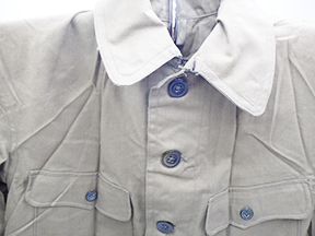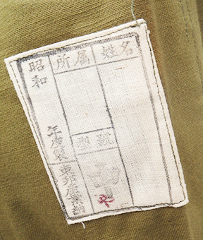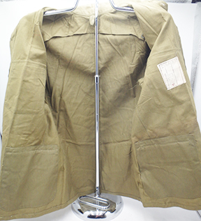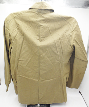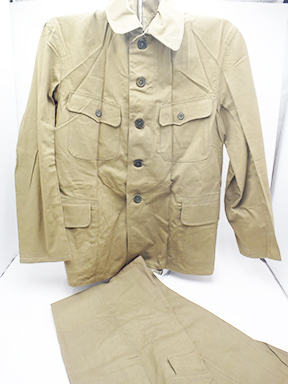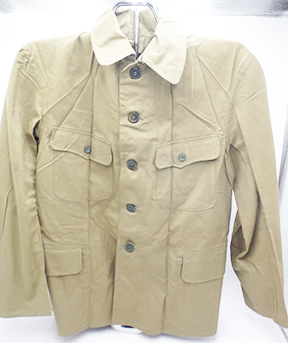 WWII Japanese Arsenal Workers Uniform Set. Green cotton shirt and jackets. Both are wrinkled form storage. Uniform set looks hardly, if ever, worn. Button on the trouser back flap is missing. Minor rust stains. Small size.