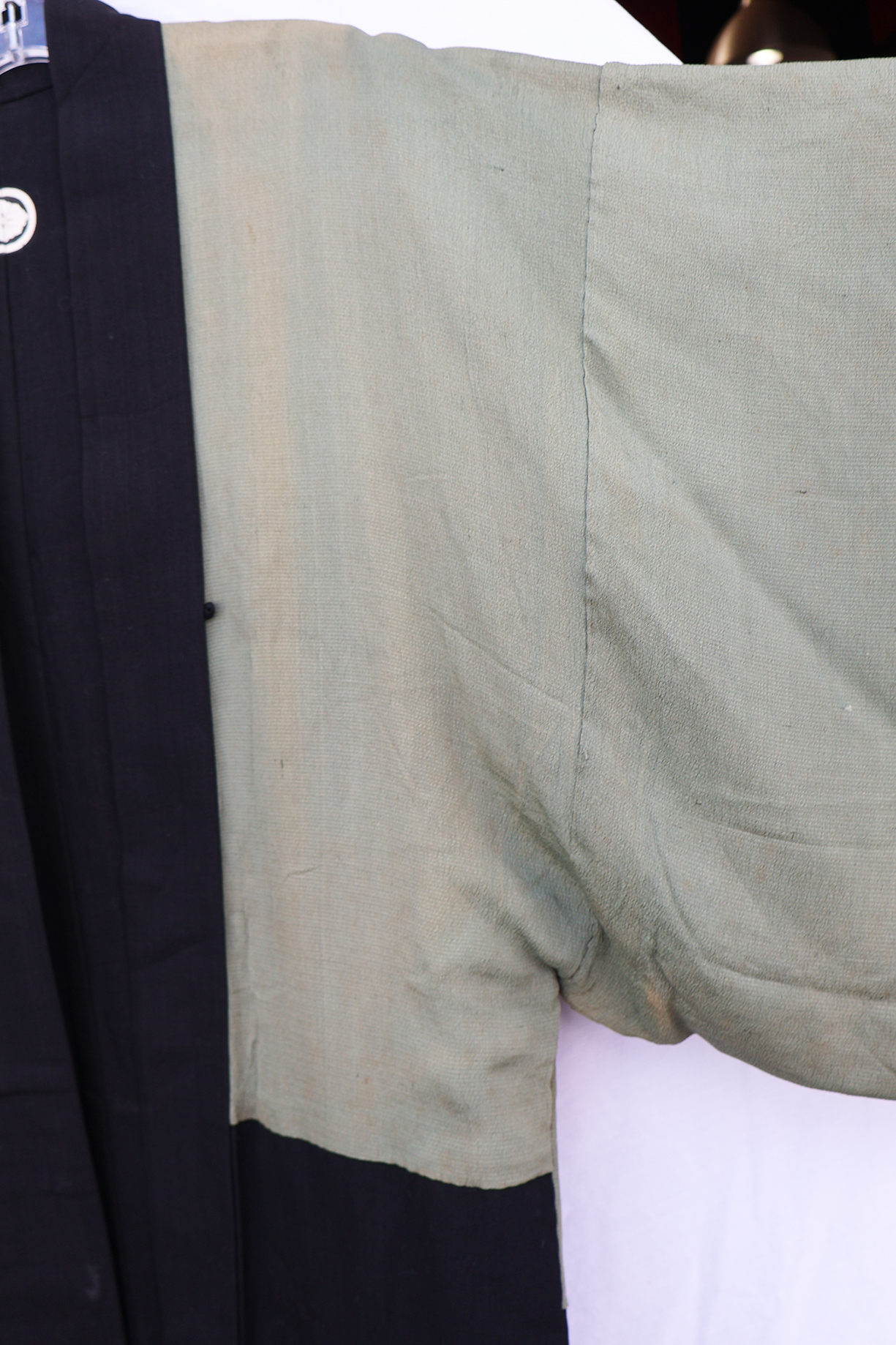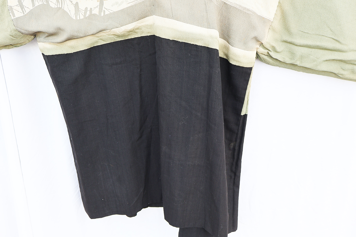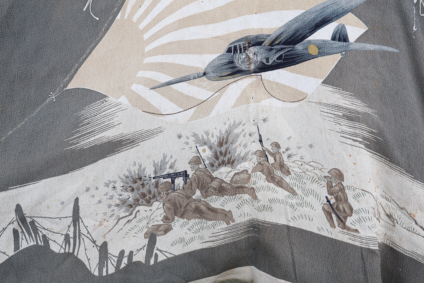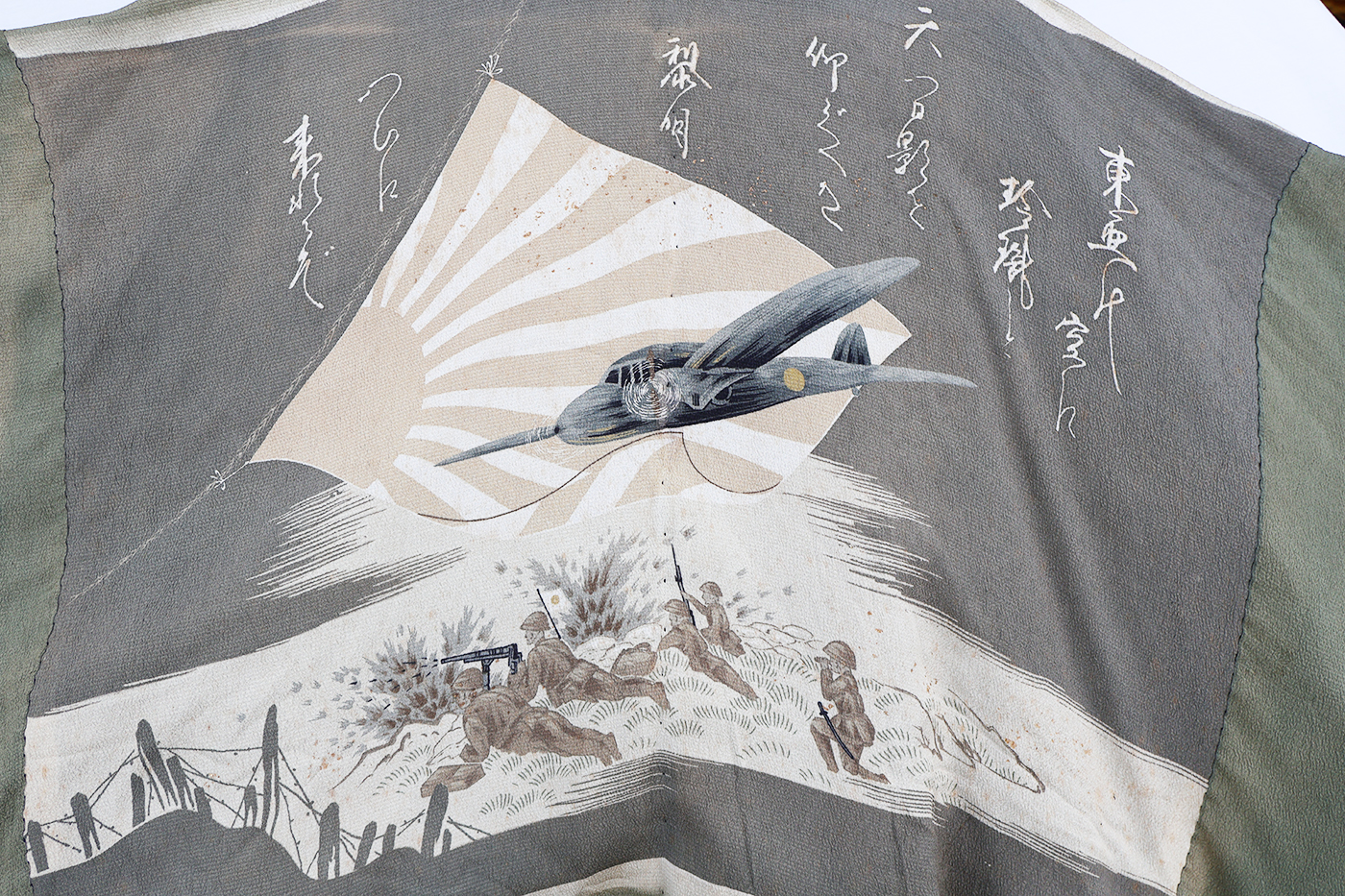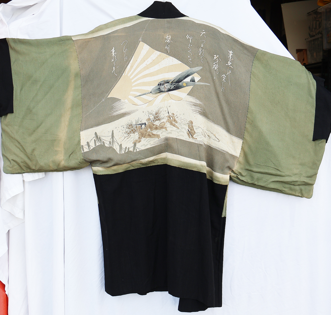 Early WWII Japan Homefront Aviation War Theme Kimono. Adult size, measuring roughly 18 inches at the chest. Silk body is in good condition with some fading from age. The image on the back is of a MG team and aircraft flying in front of the Rising Sun. Image is in great shape. Interior is in very good condition.