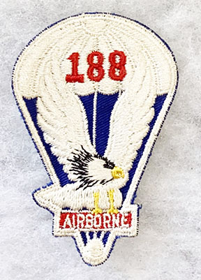 1950's 188th Airborne Regimental Combat Team Patch. Four inches tall. Fully machine embroidered on twill with a tight cheesecloth like backing. Unused.
