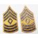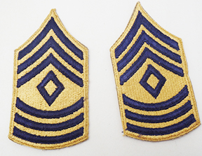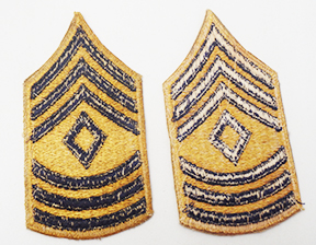 Korean War era 1948 Pattern First Sergeant Combat Arms Rank Chevrons. Yellow and blue cotton construction. Chevrons are in very good condition and appear unused.