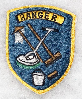 Korean War - Late 50's Floor Buffer Ranger Patch. Three inches tall. Shows crossed floor buffer, a mop and a broom with a water pail. Thick Japanese machine embroidered. Unused. Great novelty piece.