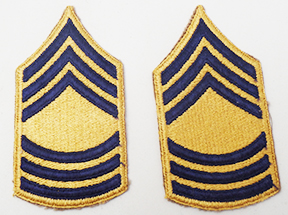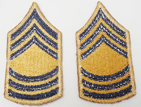 Korean War era 1948 Pattern Master Sergeant Combat Arms Rank Chevrons. Yellow and blue cotton construction. Chevrons are in very good condition and appear unused.