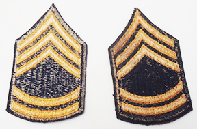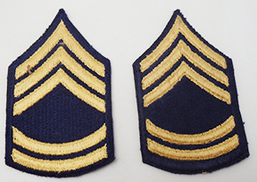 Korean War era 1948 Pattern Sergeant First Class Support Arms Rank Chevrons. Dark blue cotton construction. Chevrons are in very good condition and appear unused.