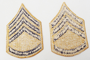 Korean War era 1948 Pattern Staff Sergeant Combat Arms Rank Chevrons. Yellow and blue cotton construction. Chevrons are in very good condition and appear unused.