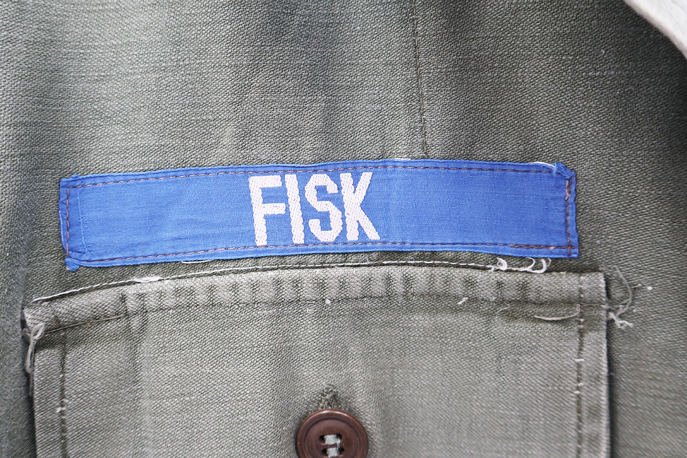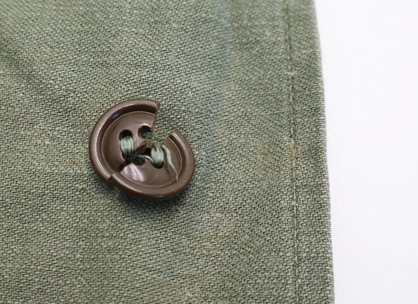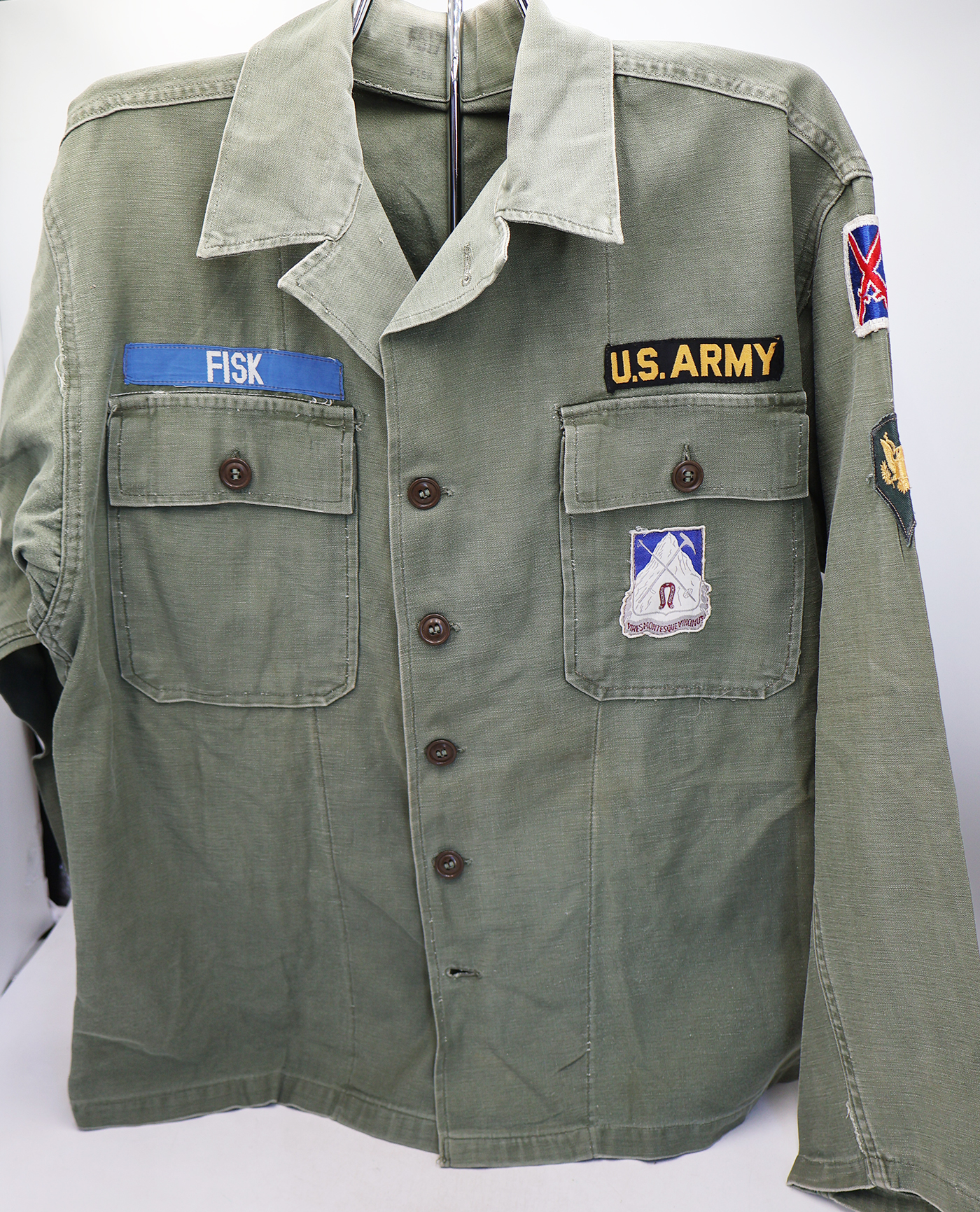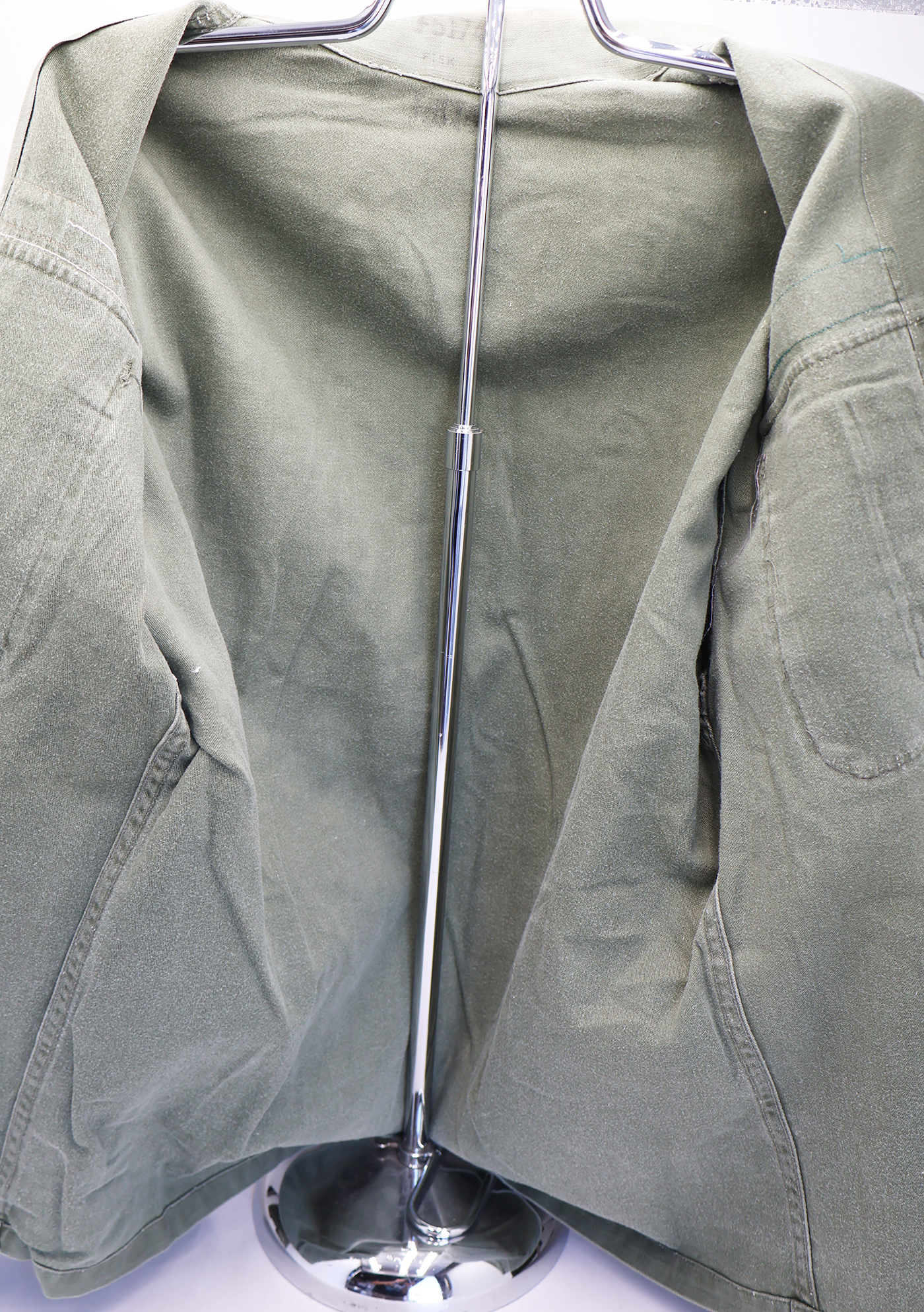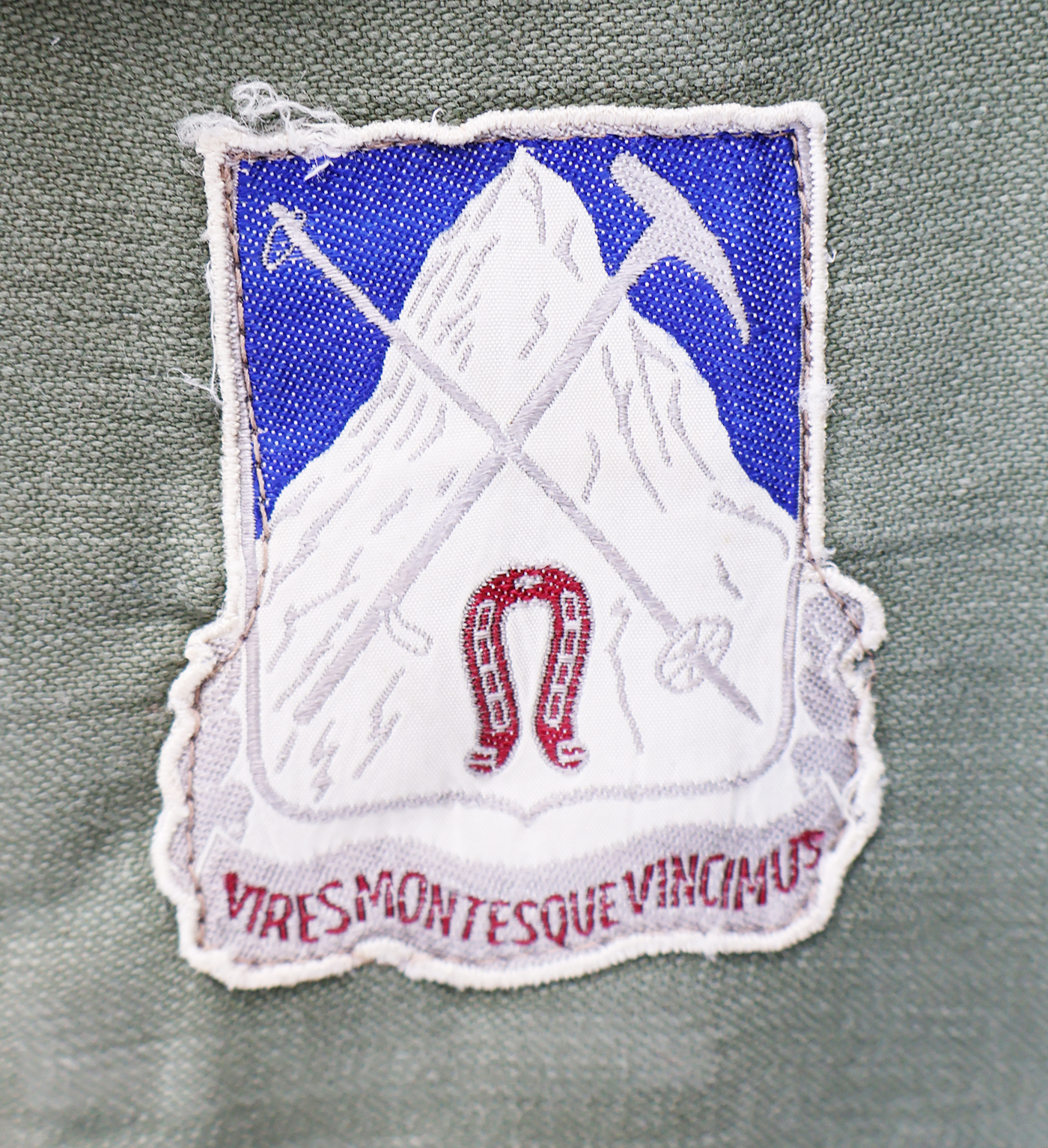 1950's era US Army 10th Mountain Division 87th Infantry Regiment Fatigue Shirt. Standard issue OG-107 shirt. On the left chest is a German made, 87th Infantry Regiment pocket patch. Name and US Army tapes appear to be German made as well. 10th Mountain patch is US made. Has been used but still in good shape. Bottom chest button is broken. Shirt measures shoulder to shoulder 18 inches, front chest size 20 inches, sleeve length 22 inches and top of the neck to the base of the jacket is 30 inches.