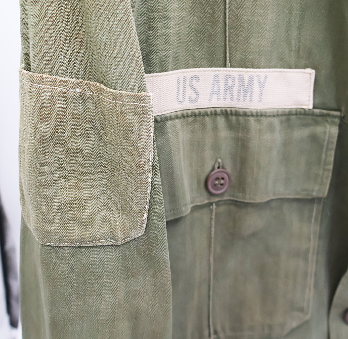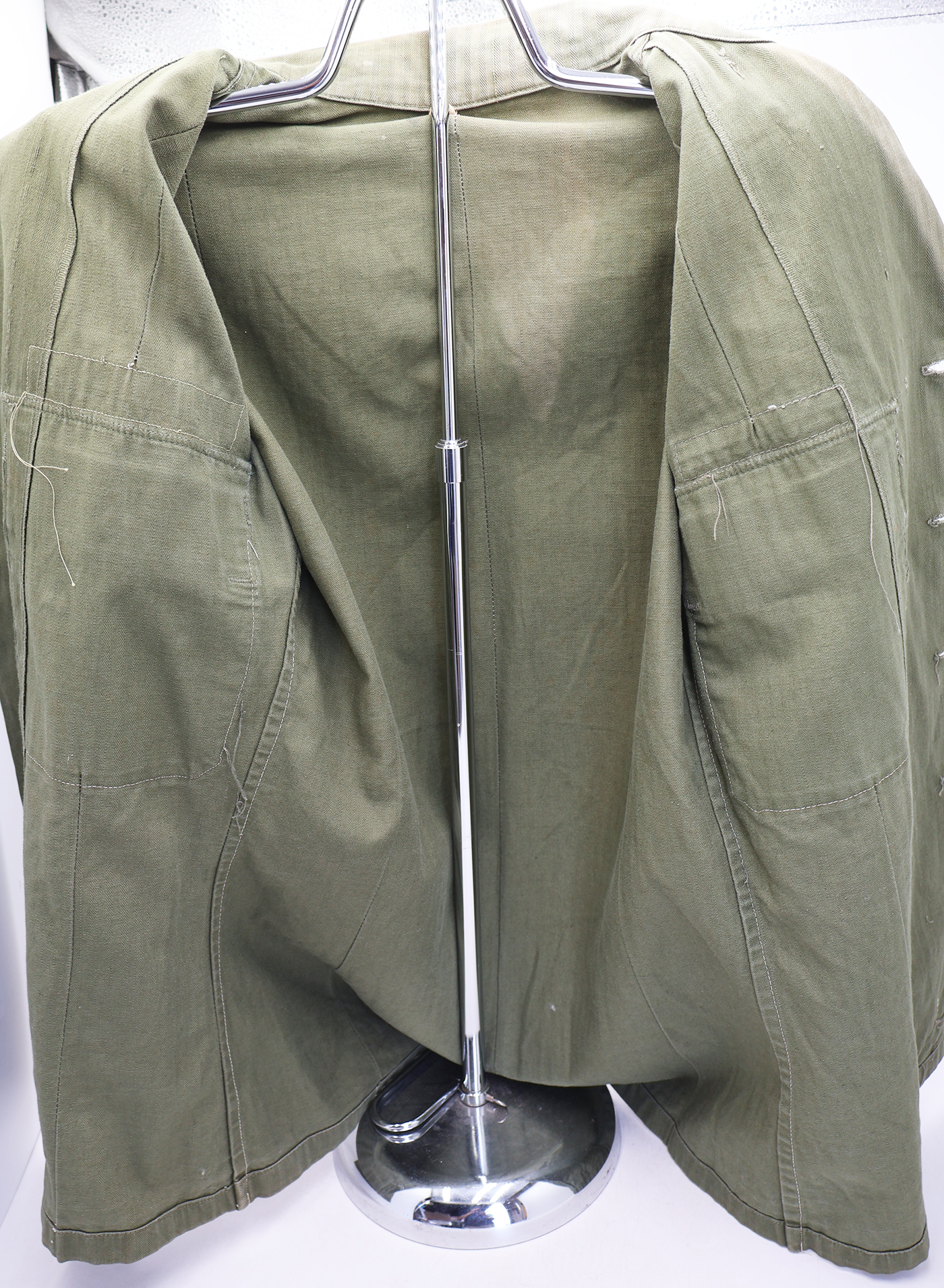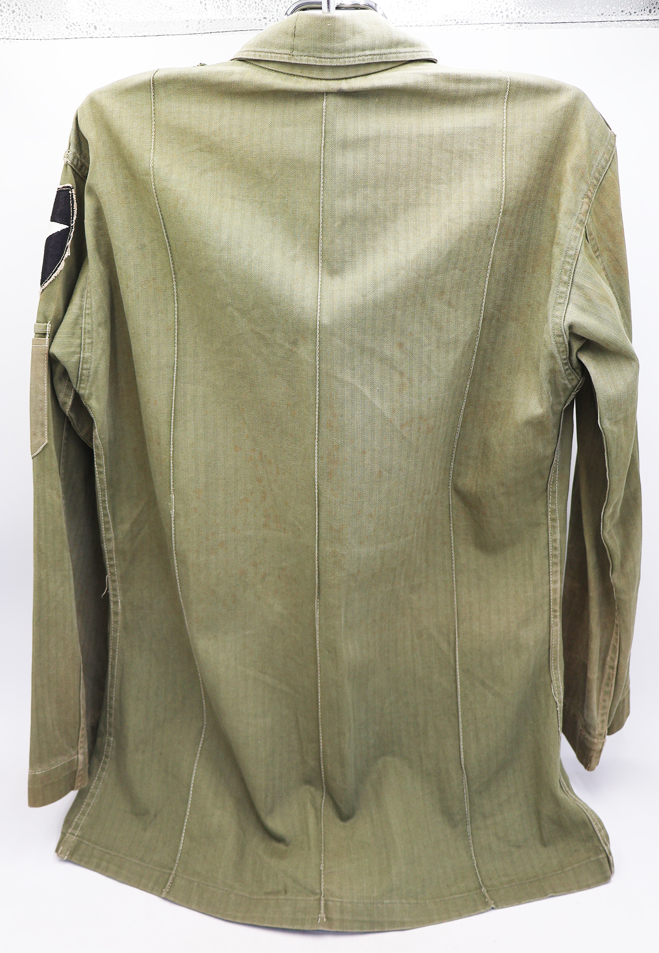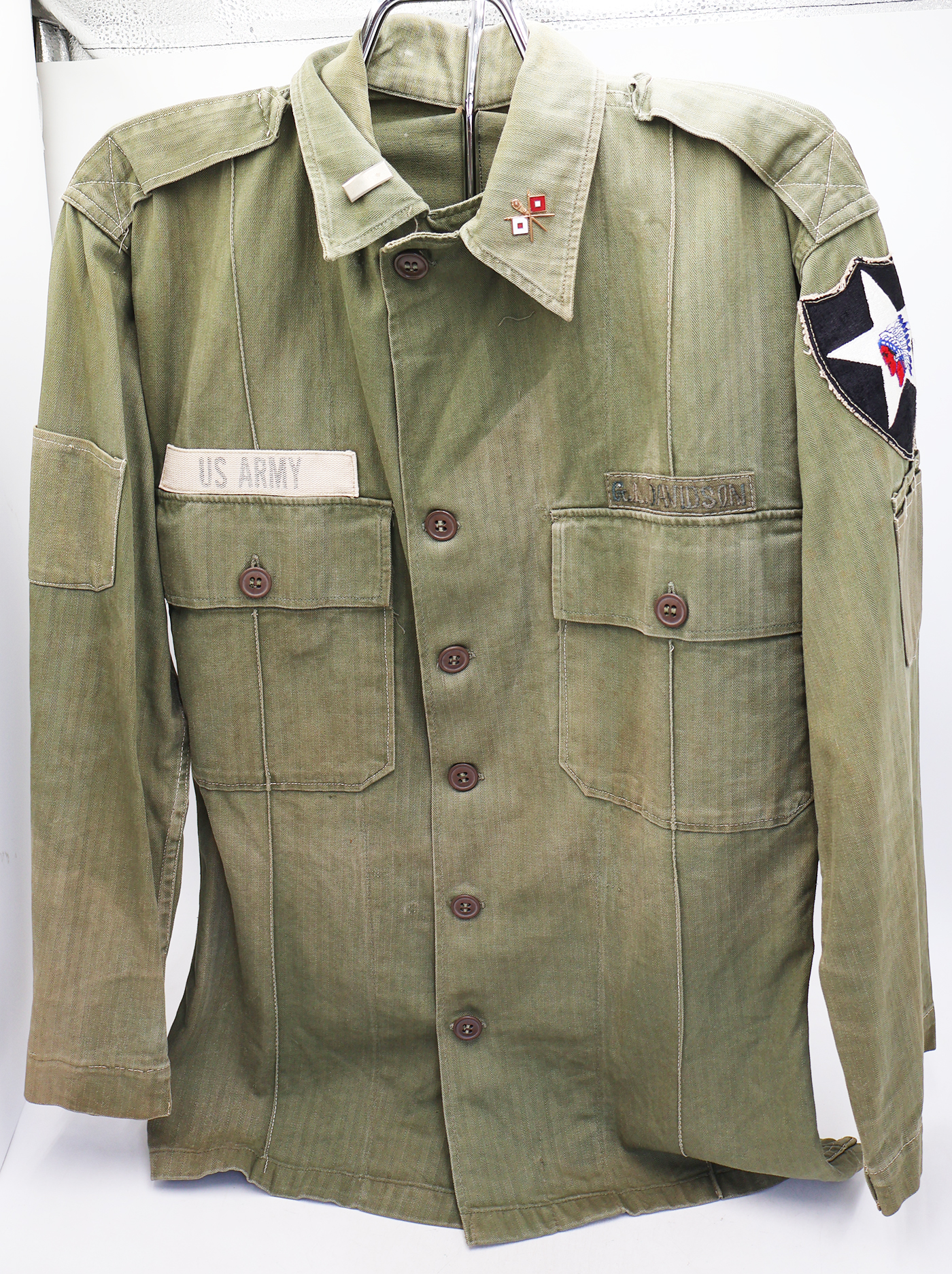 1950's era US Army 2nd Infantry Division Officers HBT Shirt. On the left chest is a Korean made, nametape. On the right chest is a Korean made, US Army Tape. The rest of the insignia is US made. Signal Corps Officer insignia on the collar. Some staining on the shirt. Tailor made epaulettes and scalloped pockets. on the backside of the shirt. Has been used but still in good shape. Plastic buttons are in good shape. Shirt measures shoulder to shoulder 18 inches, front chest size 20 inches, sleeve length 21 inches and top of the neck to the base of the jacket is 31 inches.