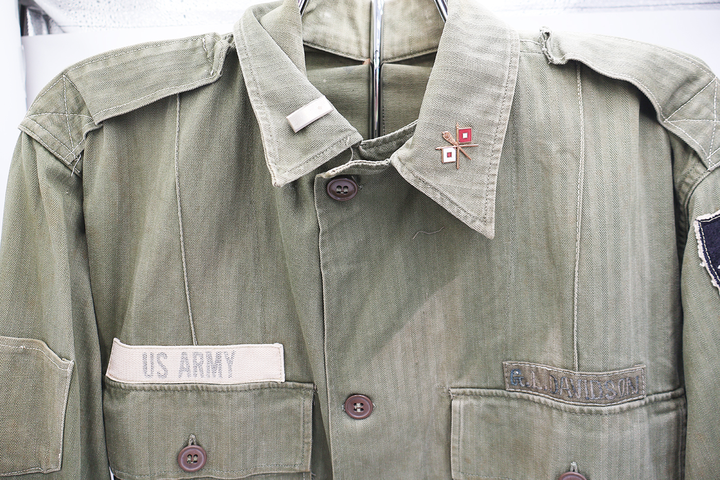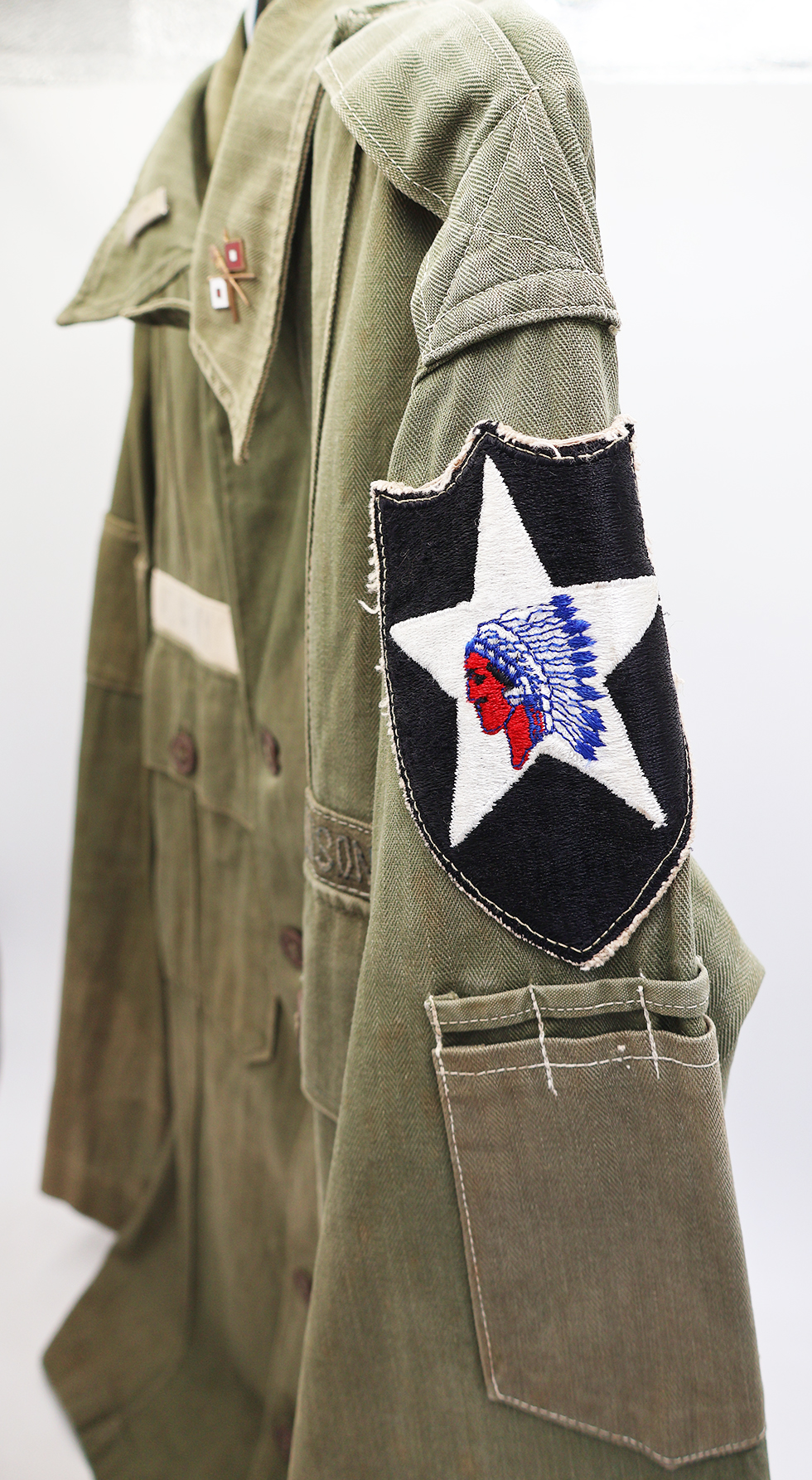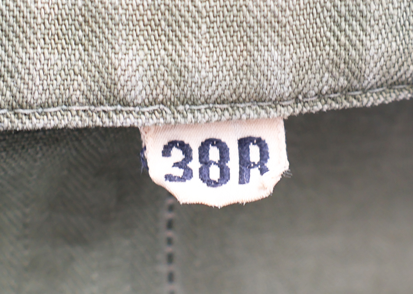 1950's era US Army 2nd Infantry Division Officers HBT Shirt. On the left chest is a Korean made, nametape. On the right chest is a Korean made, US Army Tape. The rest of the insignia is US made. Signal Corps Officer insignia on the collar. Some staining on the shirt. Tailor made epaulettes and scalloped pockets. on the backside of the shirt. Has been used but still in good shape. Plastic buttons are in good shape. Shirt measures shoulder to shoulder 18 inches, front chest size 20 inches, sleeve length 21 inches and top of the neck to the base of the jacket is 31 inches.