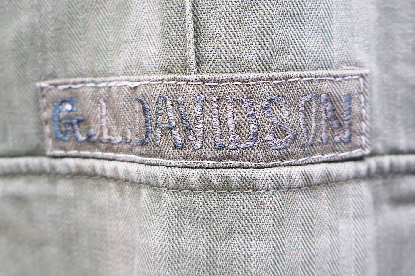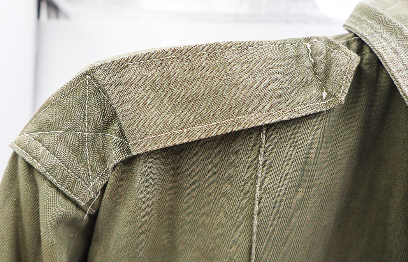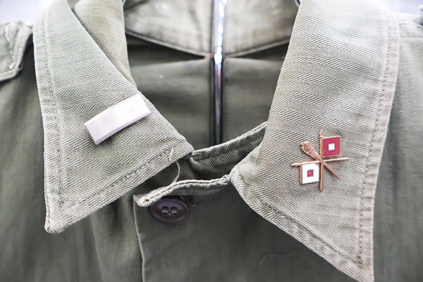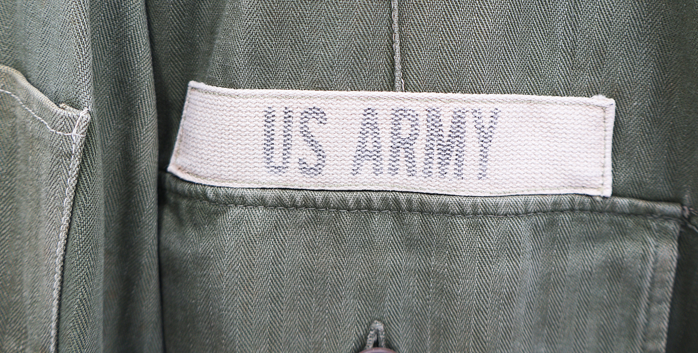 1950's era US Army 2nd Infantry Division Officers HBT Shirt. On the left chest is a Korean made, nametape. On the right chest is a Korean made, US Army Tape. The rest of the insignia is US made. Signal Corps Officer insignia on the collar. Some staining on the shirt. Tailor made epaulettes and scalloped pockets. on the backside of the shirt. Has been used but still in good shape. Plastic buttons are in good shape. Shirt measures shoulder to shoulder 18 inches, front chest size 20 inches, sleeve length 21 inches and top of the neck to the base of the jacket is 31 inches.