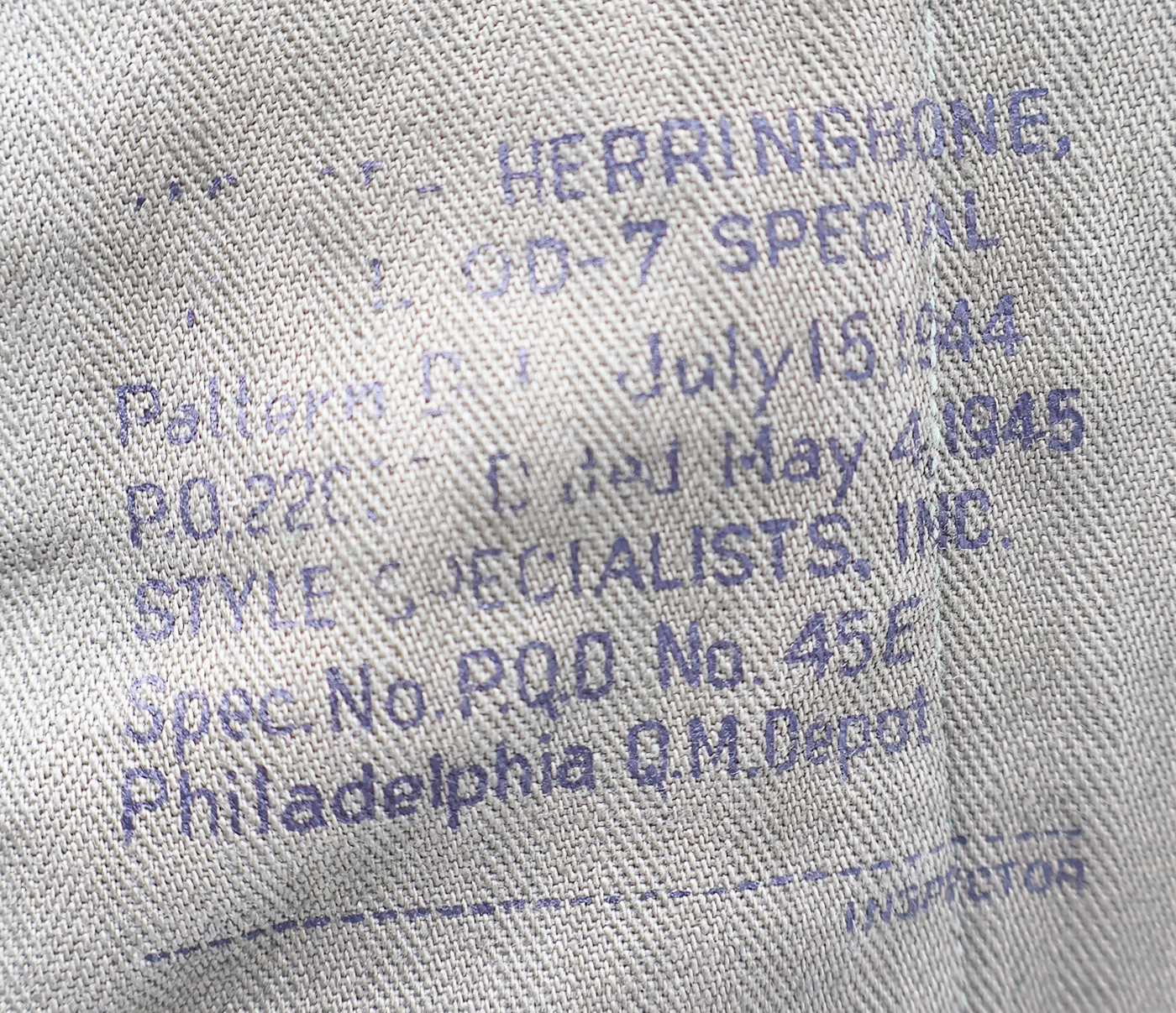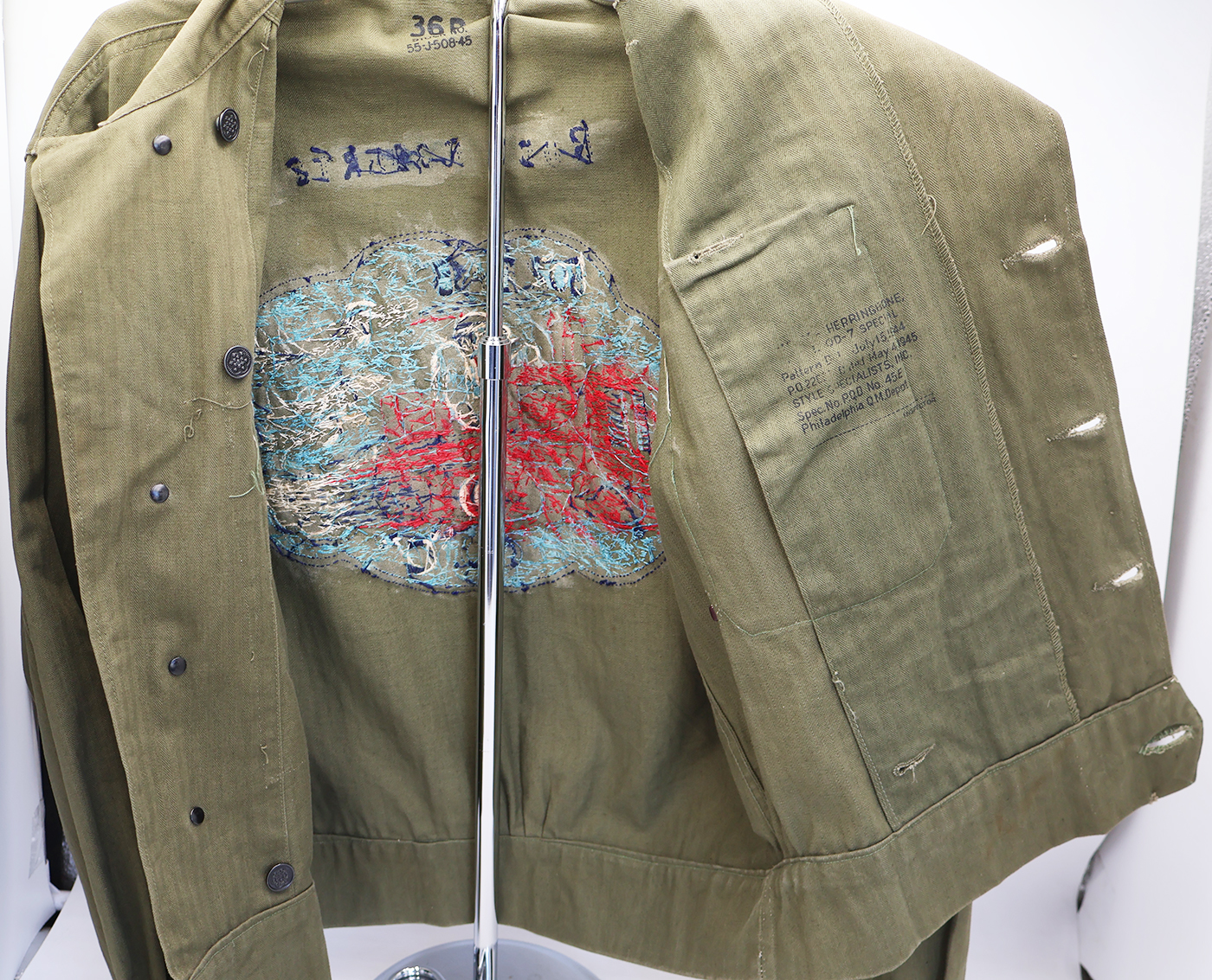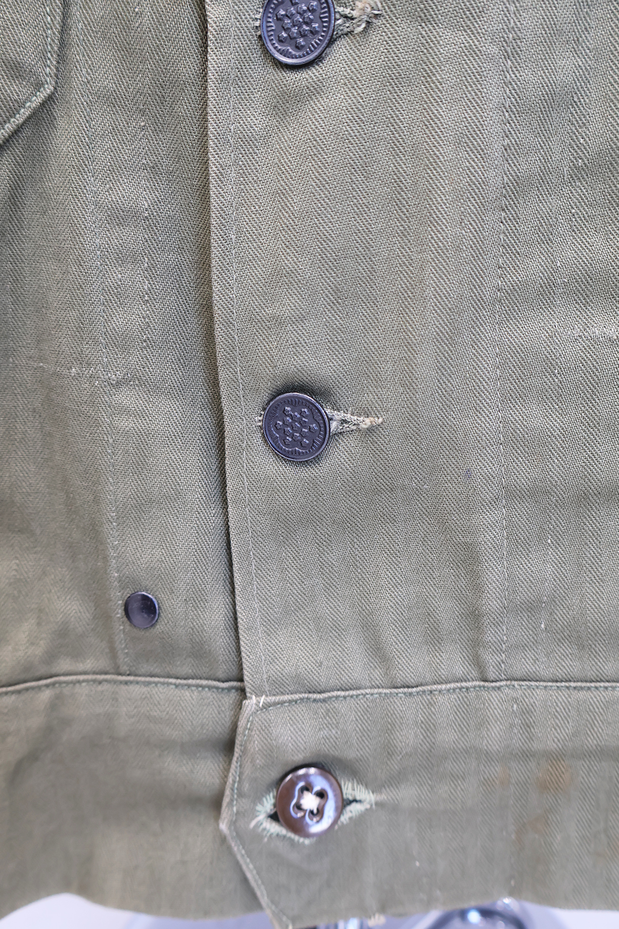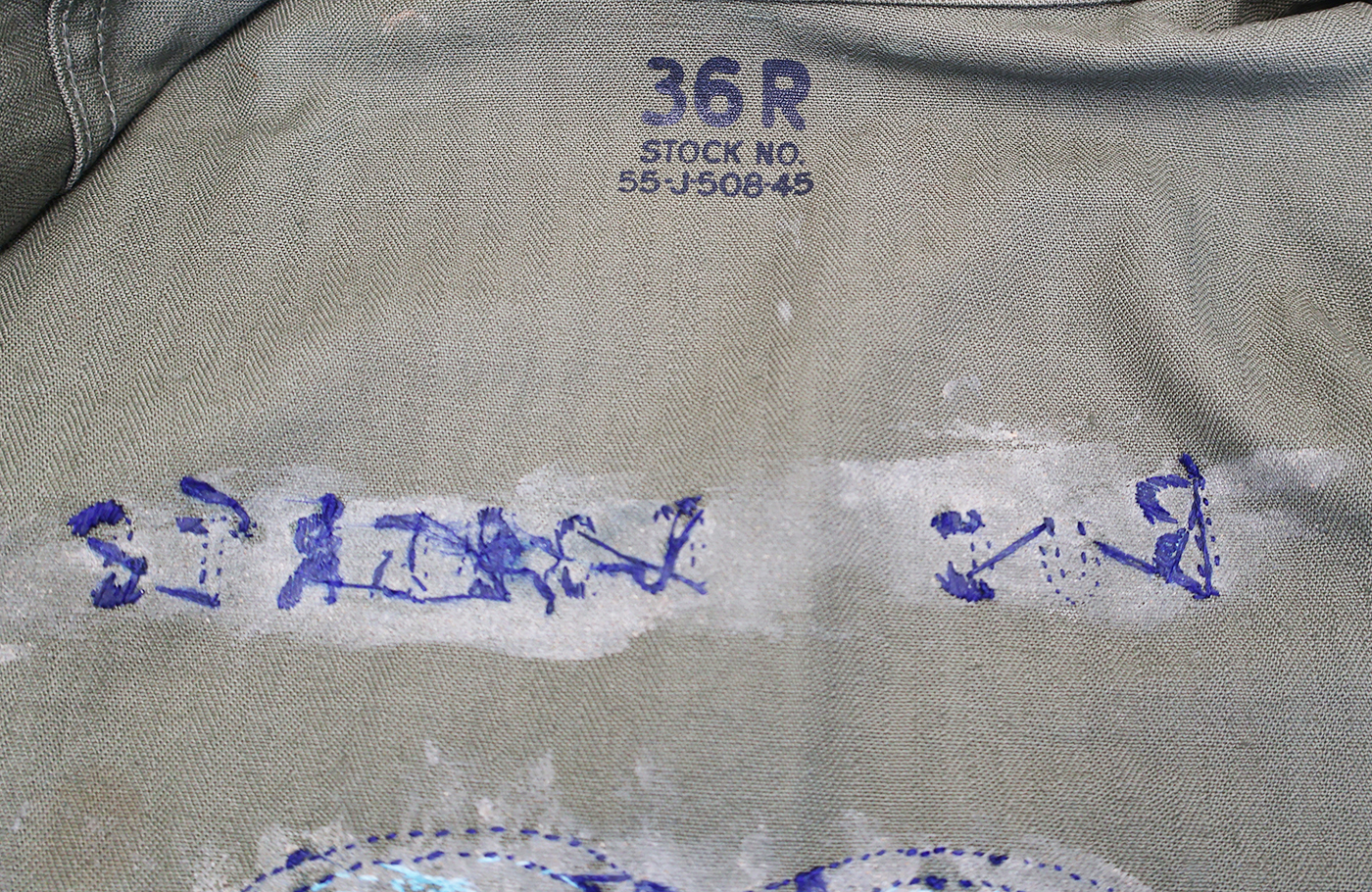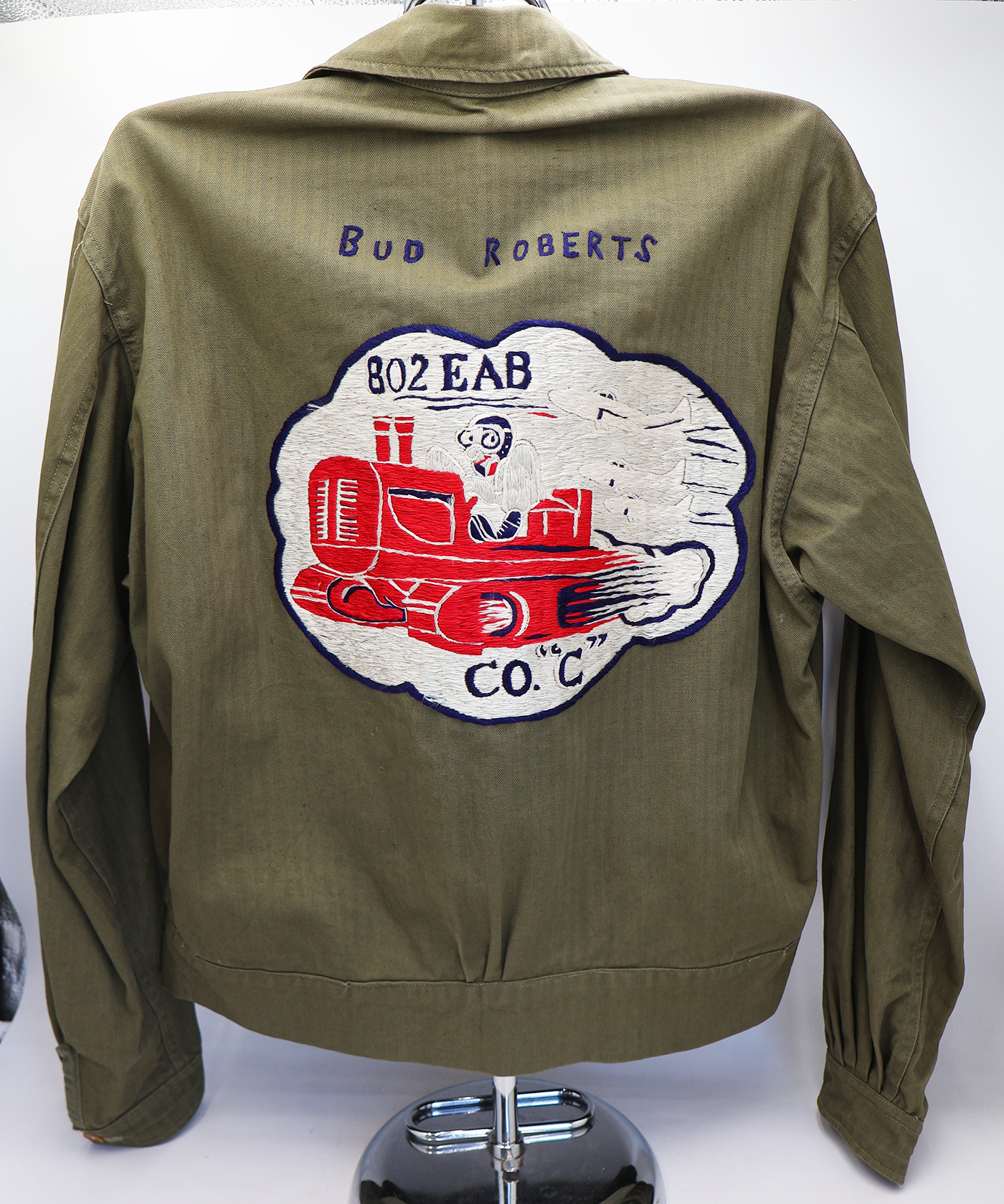 802nd Engineer Aviation Battalion Embroidered HBT Shirt. On the back is a very large Japanese or Korean silk Embroidered image of a bulldozer and with jets that blend into the white background. Shirt also has the name of the individual who had the shirt made. The shirt is overall in good condition with no notable stains or wear. Late WWII model HBT shirt that has been heavily modified. Large chest pockets have been replaced with 1950's style smaller pockets. Dramatically cut down at the waist. Labelled a 36R. Shirt measures shoulder to shoulder 18 inches, front chest size 19 inches, sleeve length 23 inches and top of the neck to the base of the jacket is 23 inches.
