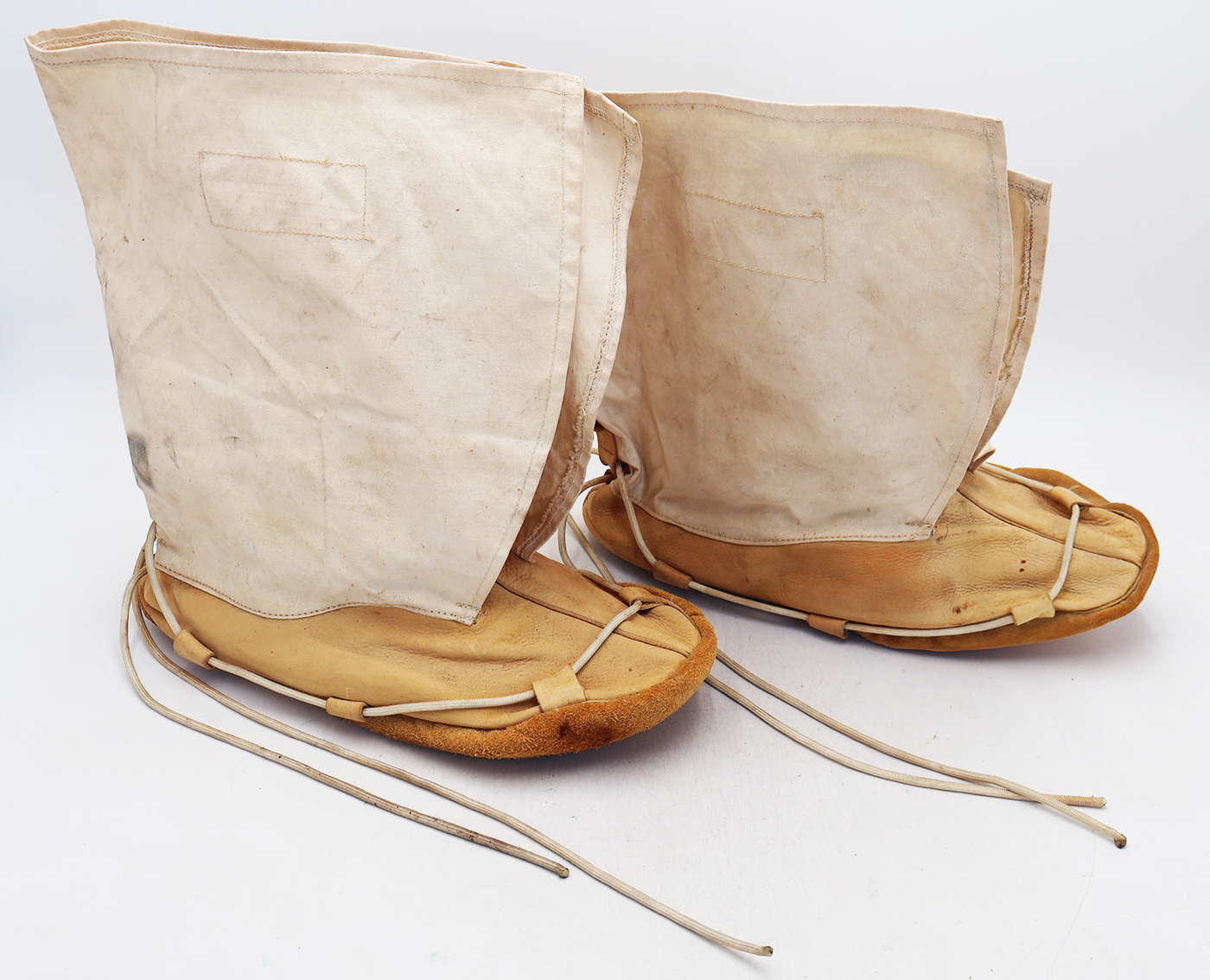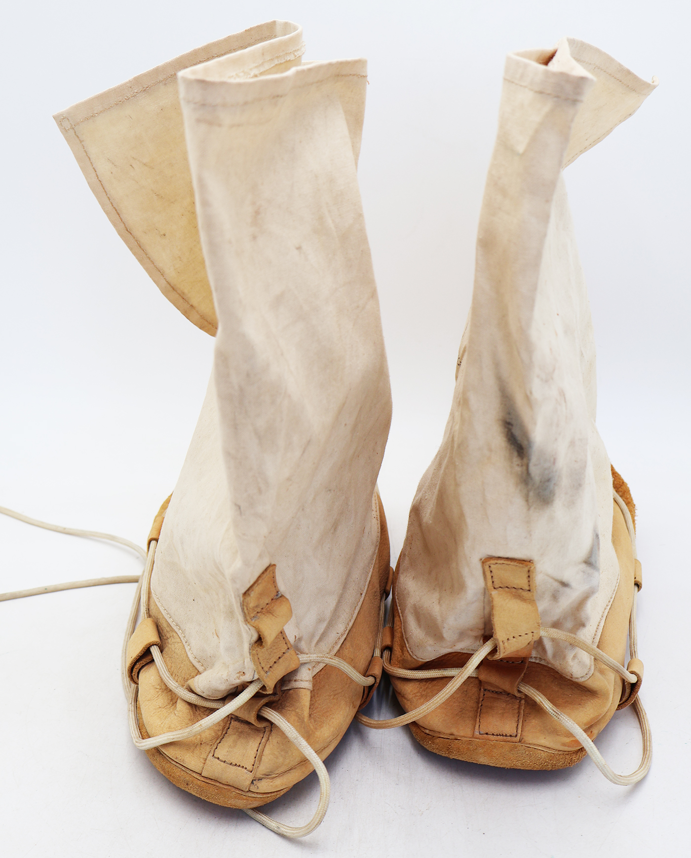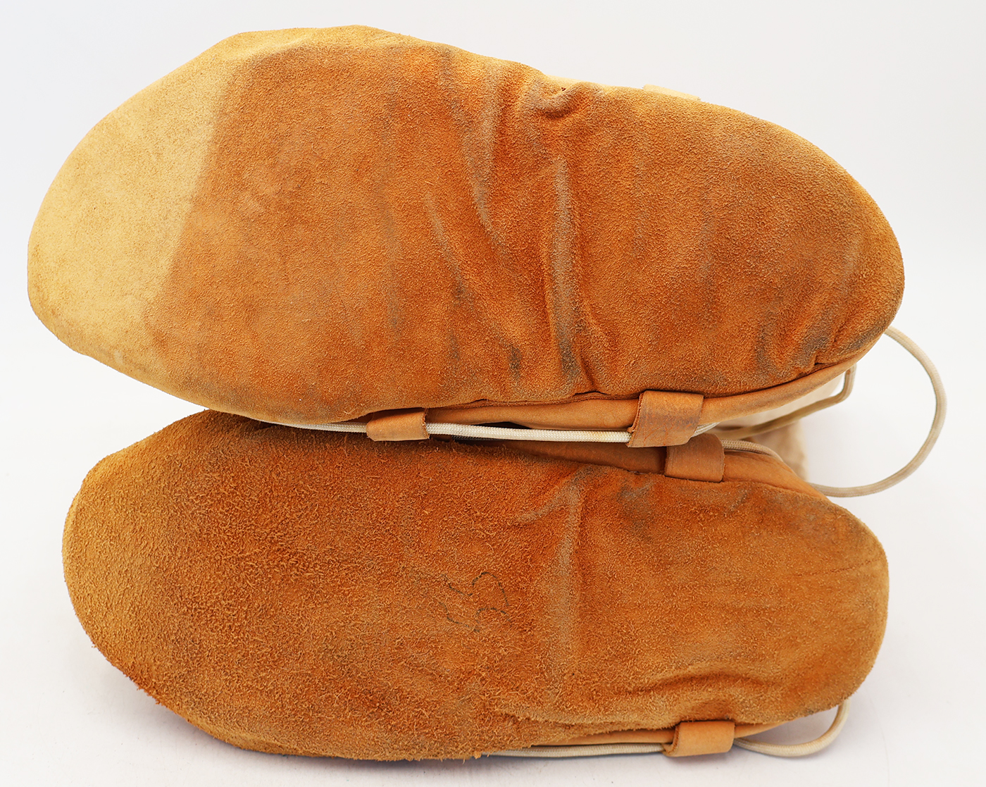 1950's or 60's Air Force Survival Moccasin's. Leather soles with white, canvas body. Part of the survival kit. Moccasin's appear to be unused and have no notable wear or damage. Minor staining from age.