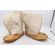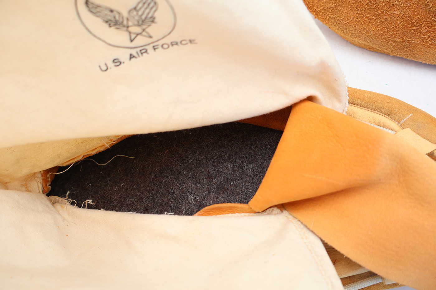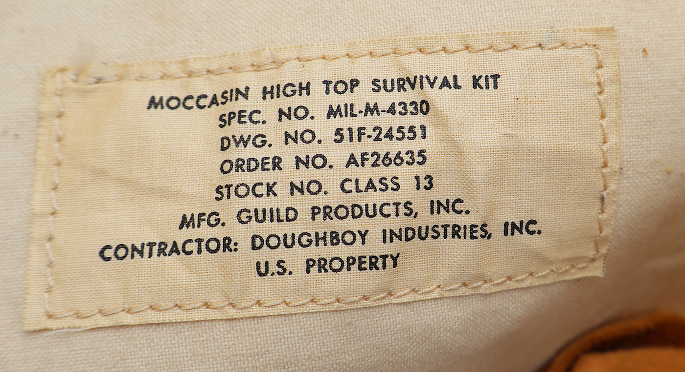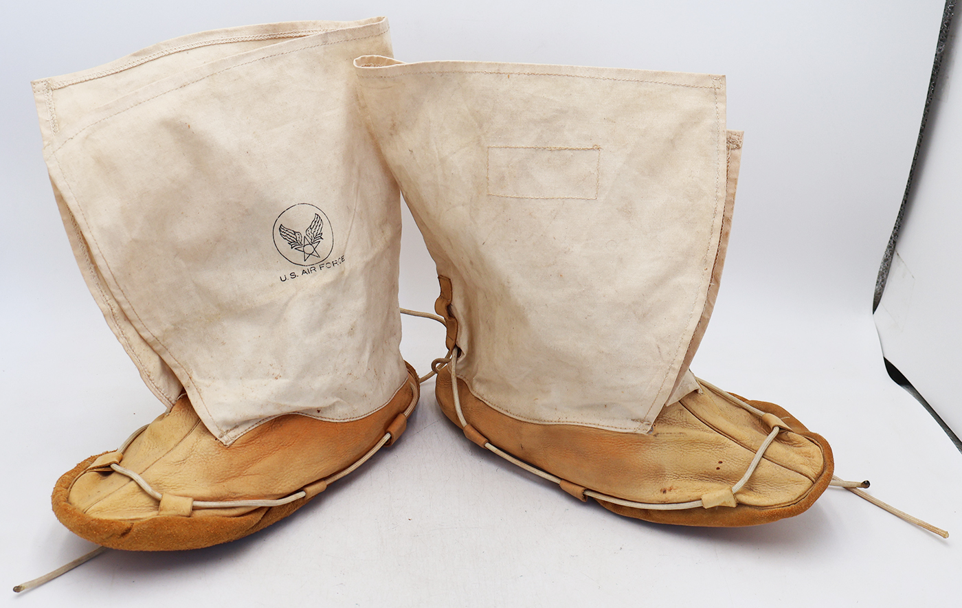 1950's or 60's Air Force Survival Moccasin's. Leather soles with white, canvas body. Part of the survival kit. Moccasin's appear to be unused and have no notable wear or damage. Minor staining from age.