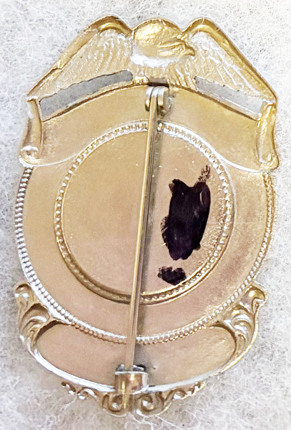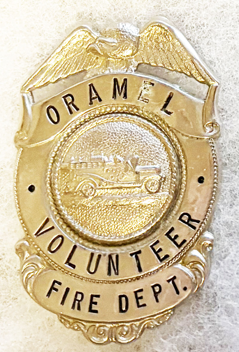 Oramel New York Volunteer Fire Department Badge. About two and a half inches tall. No hallmark. Pin back with an open hook type catch.