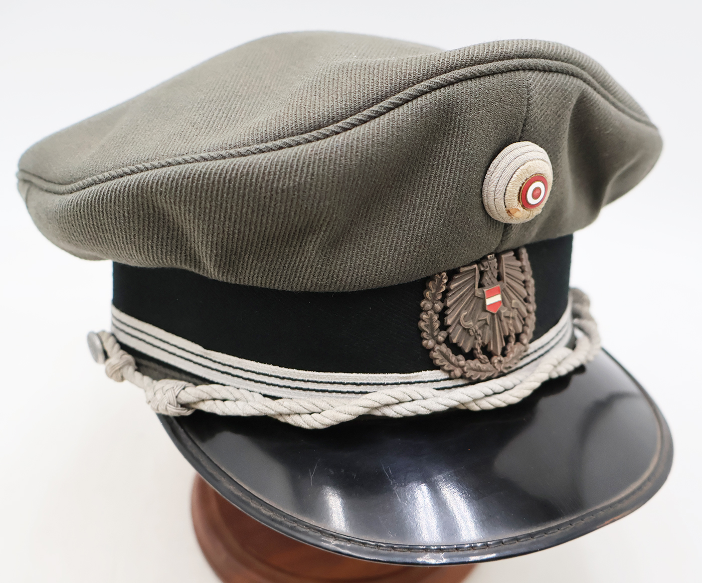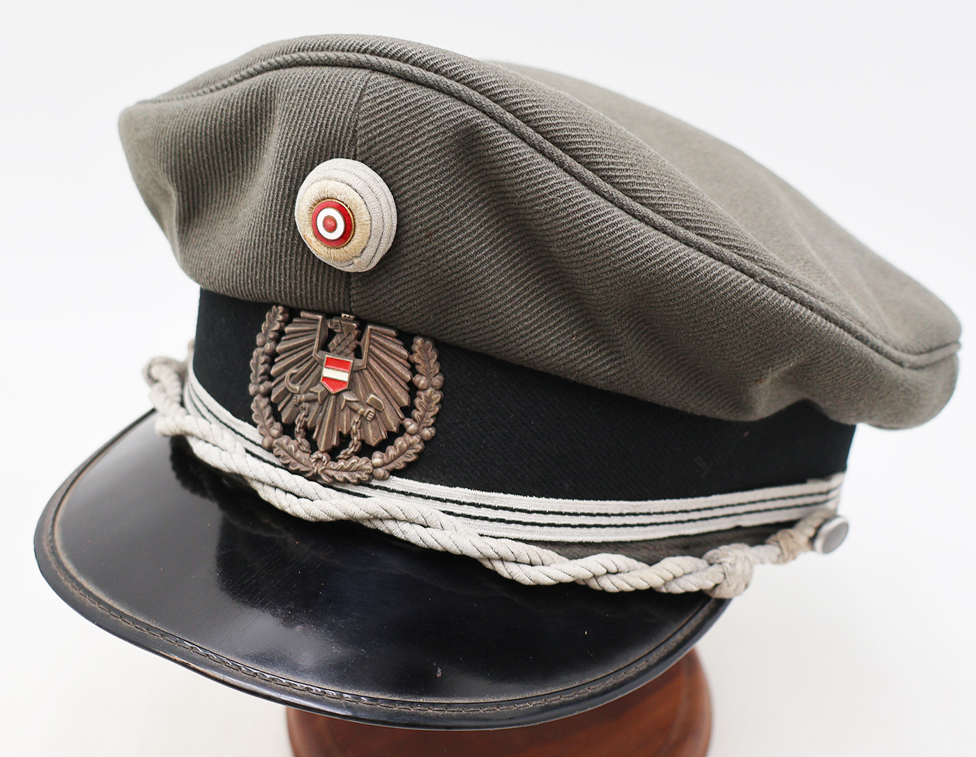 Cold War era Austrian Army Officers Visor Cap. Small size. Displays an Austrian Army Eagle Badge on the front. The cap is In great shape with only minor storage wear.