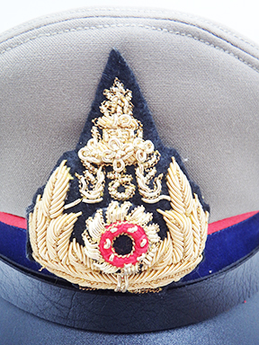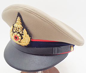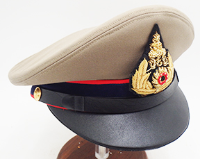 Thai Army Officer Visor Cap. Cap is clean and the interior looks unissued. Size 6 1/2. The interior is in good condition with some wear. Bullion is intact and super clean. The leather bill is in great shape.