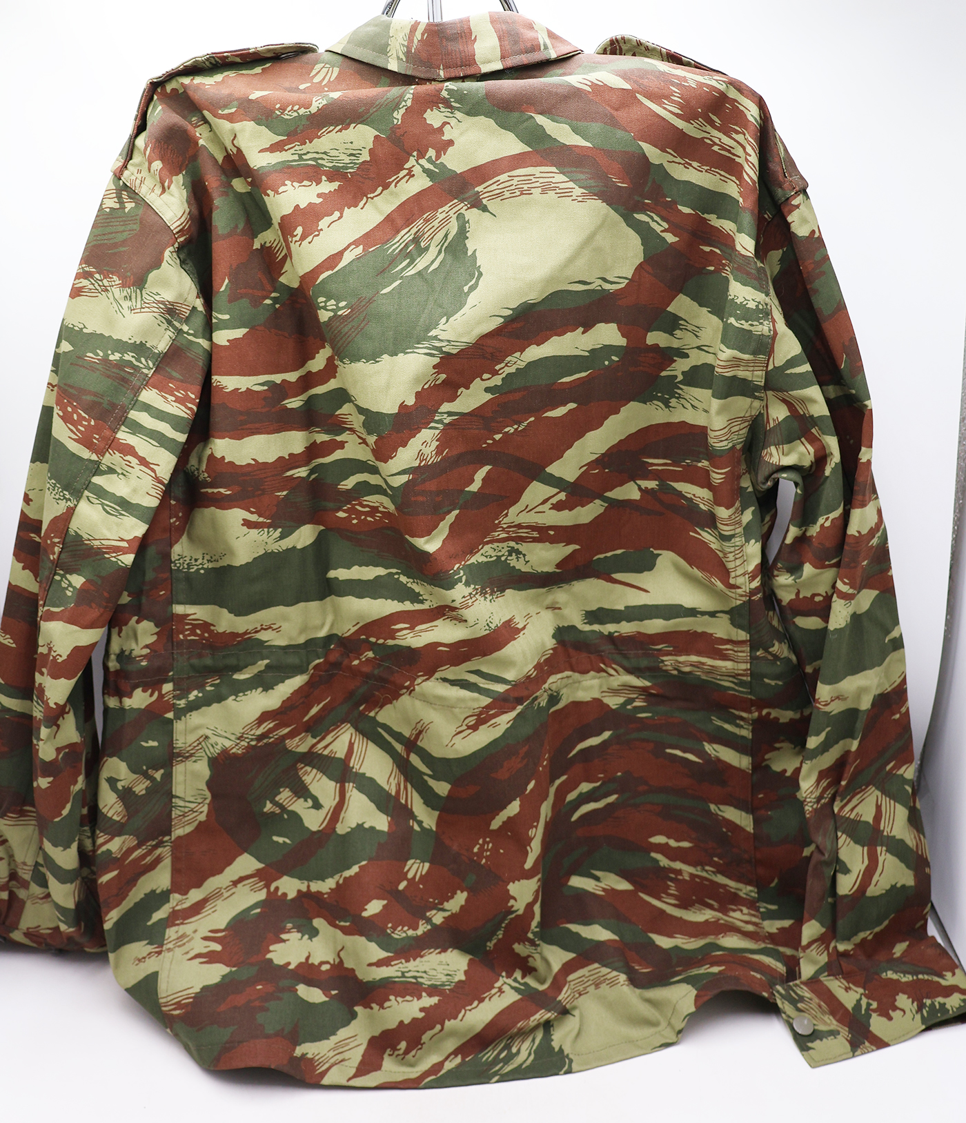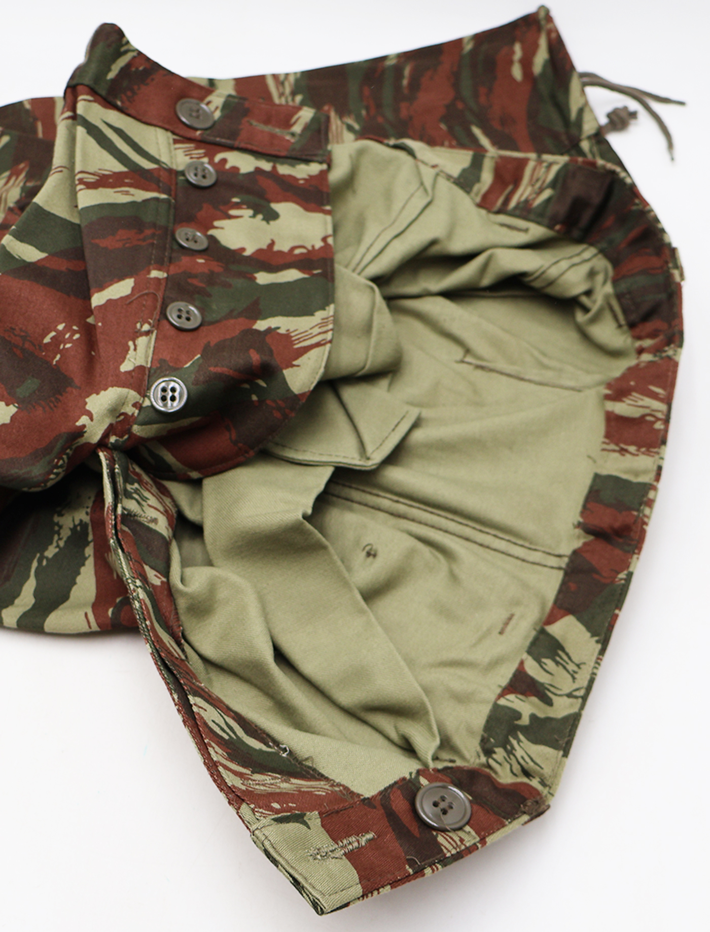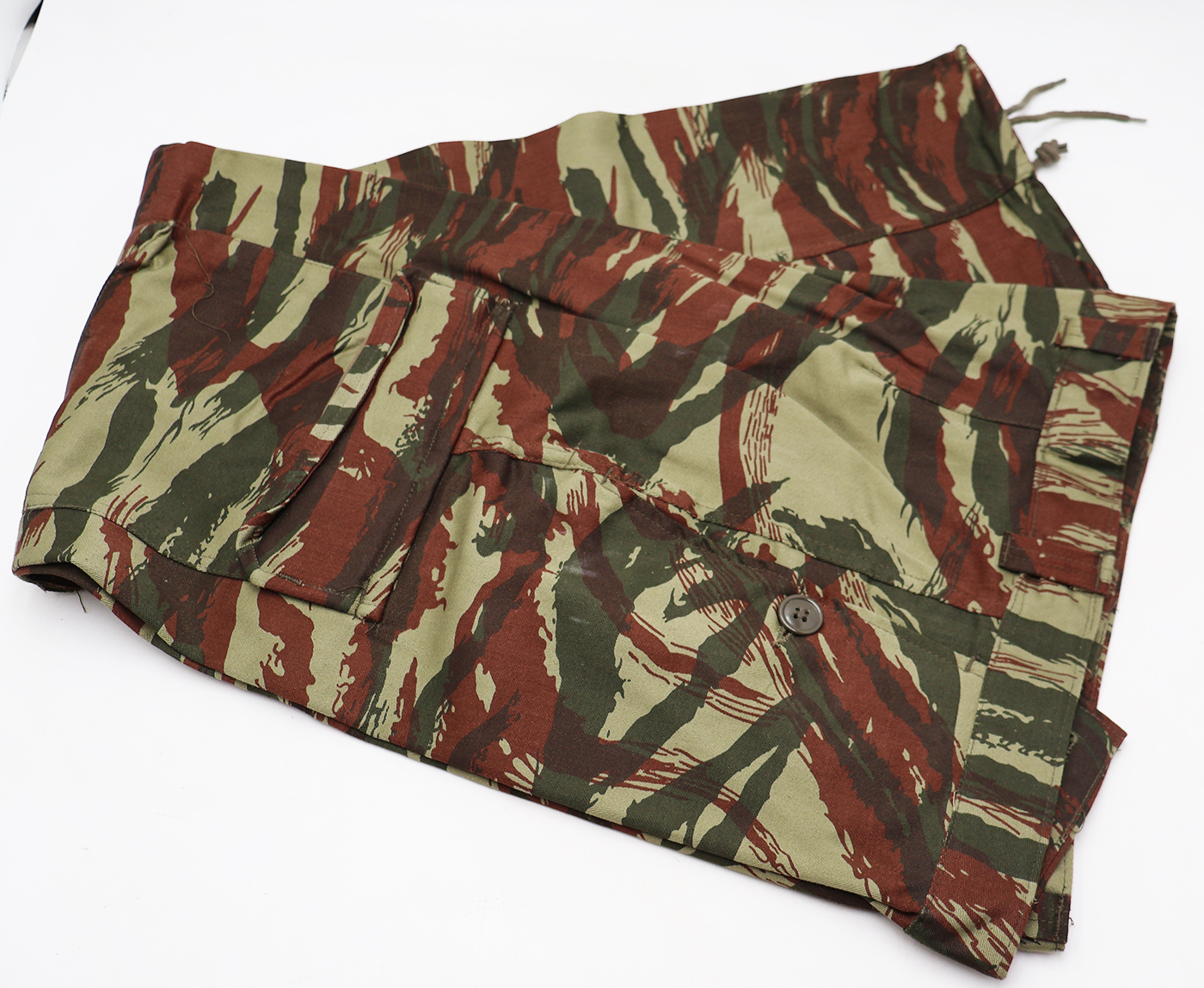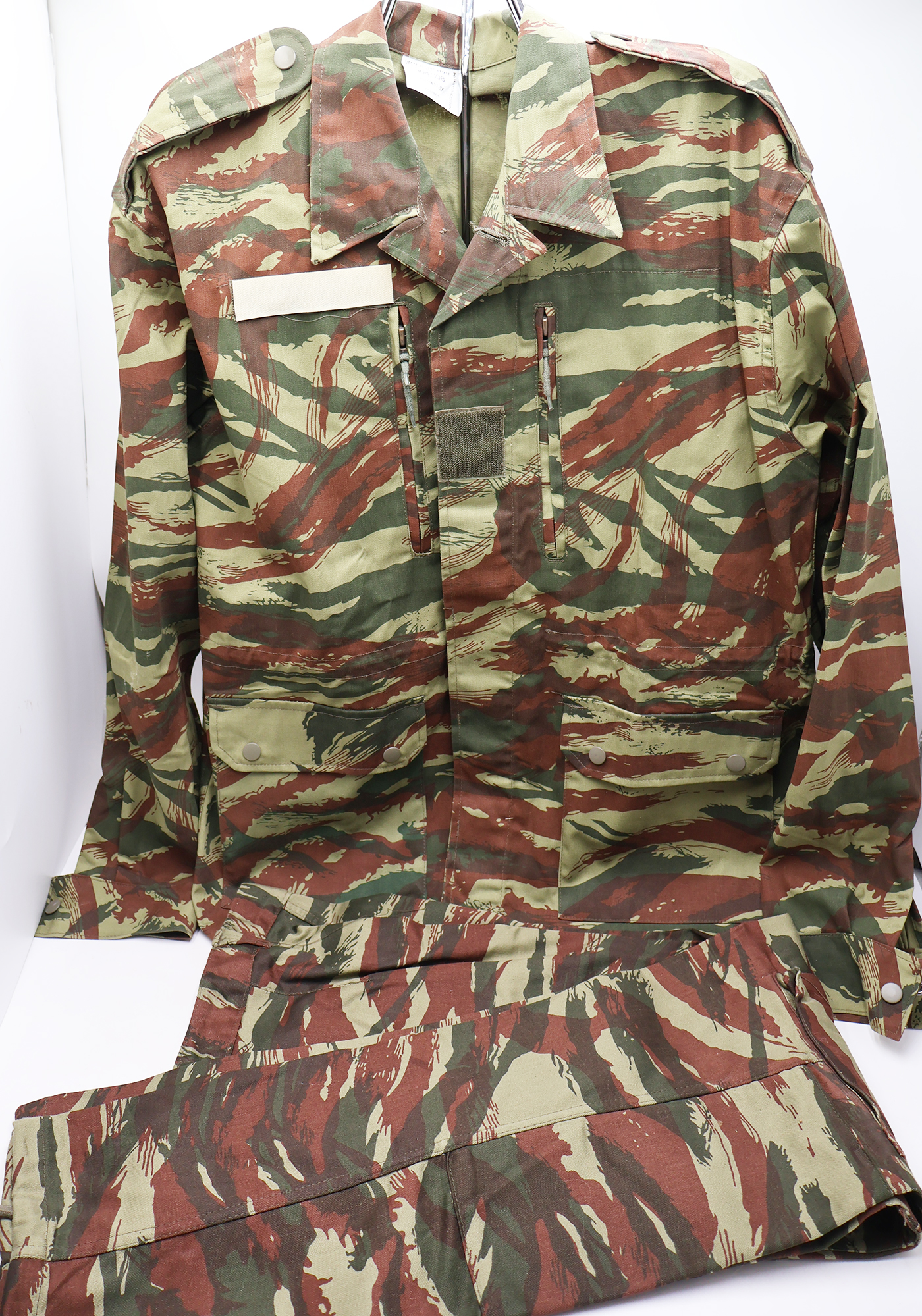 1980's French Lizard Camouflage Jacket and Trousers. Cotton material. Has been issued with some wear from usage. Overall, in good condition. Has French tags. Jacket measures shoulder to shoulder 20 inches, front chest size 22 inches, sleeve length from shoulder to cuff is 26 inches and top of the neck to the base of the shirt is 31 inches. Trousers measure 36 inches at the waist and 30 inches at the inseam.