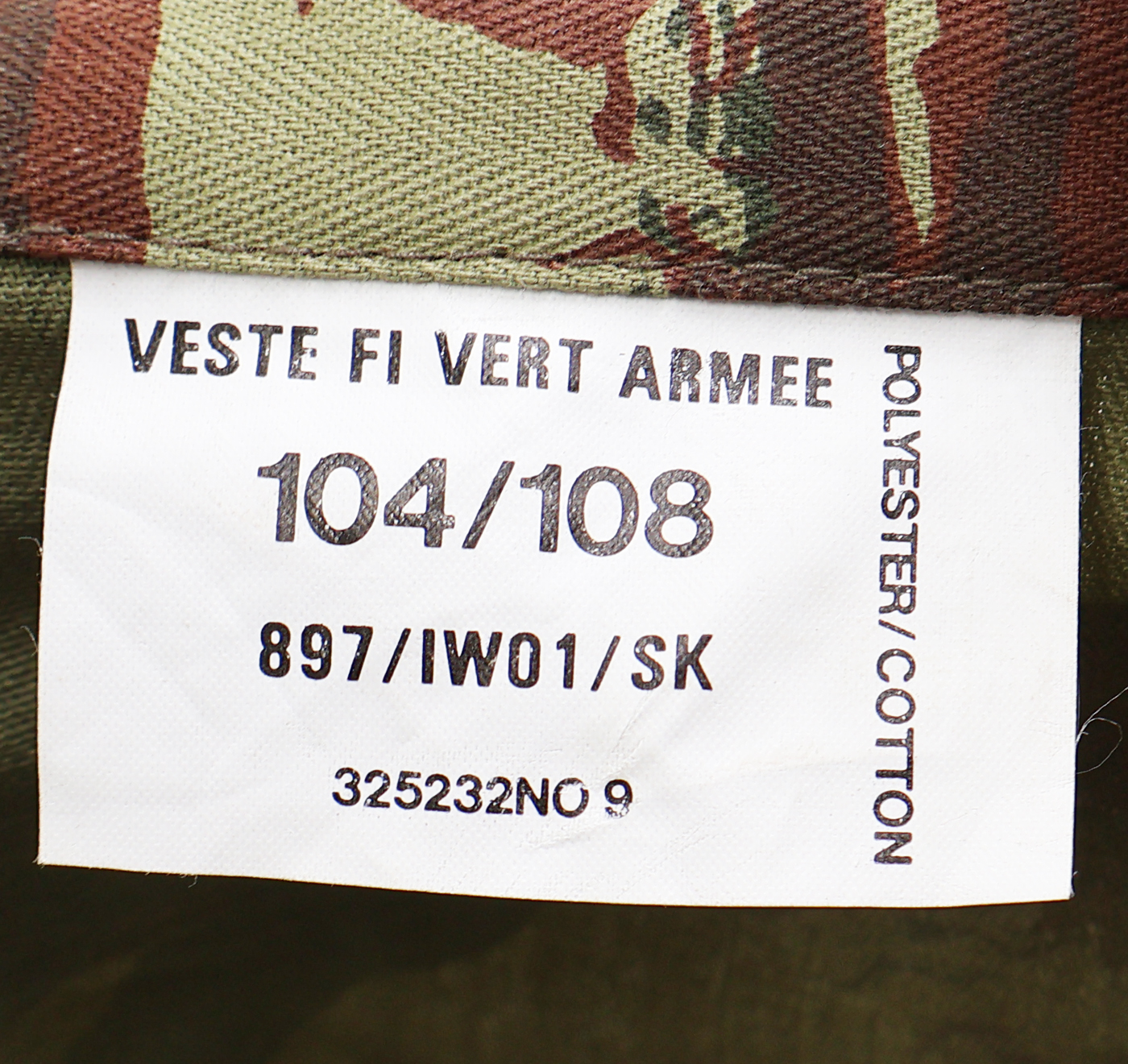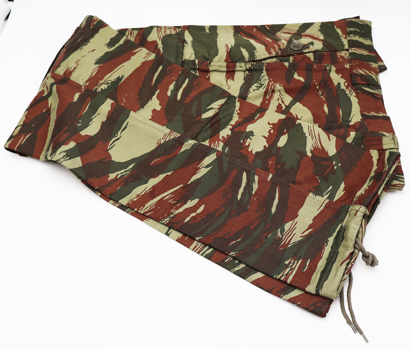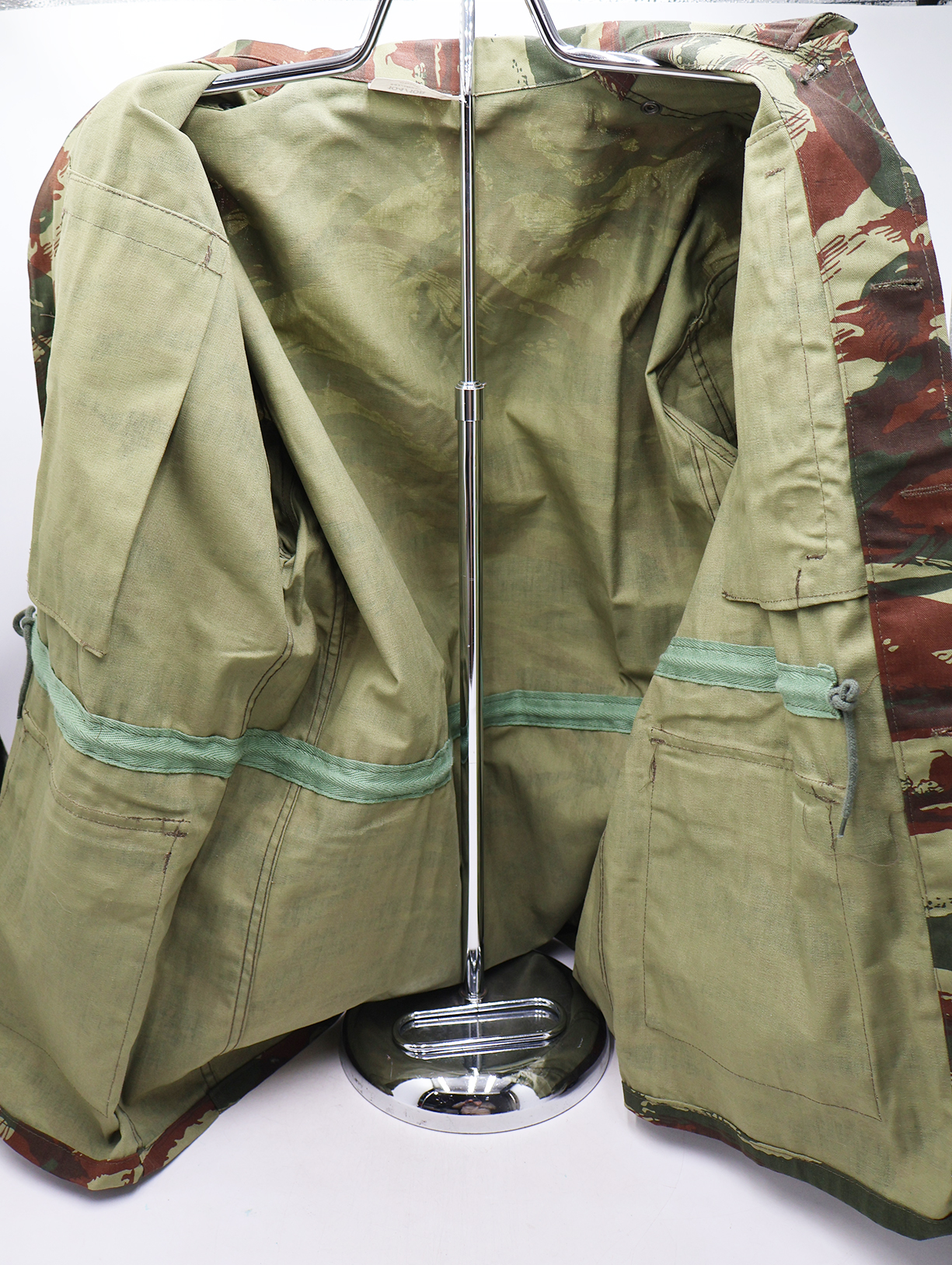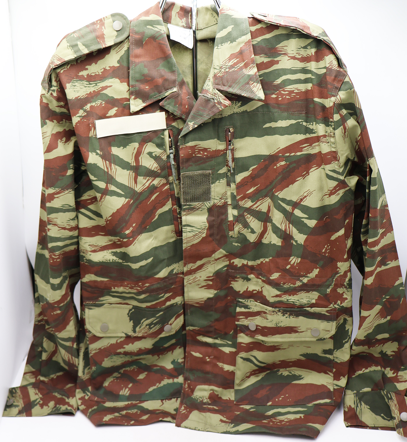 1980's French Lizard Camouflage Jacket and Trousers. Cotton material. Has been issued with some wear from usage. Overall, in good condition. Has French tags. Jacket measures shoulder to shoulder 20 inches, front chest size 22 inches, sleeve length from shoulder to cuff is 26 inches and top of the neck to the base of the shirt is 31 inches. Trousers measure 36 inches at the waist and 30 inches at the inseam.