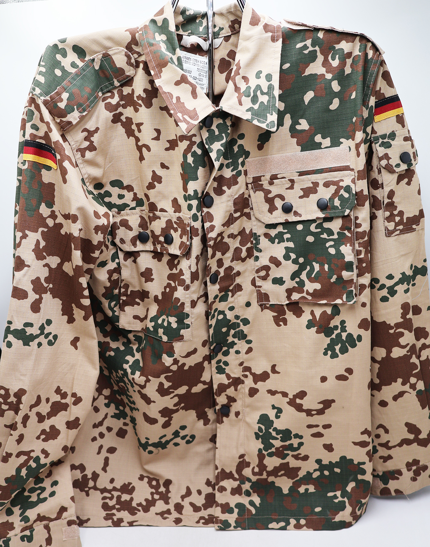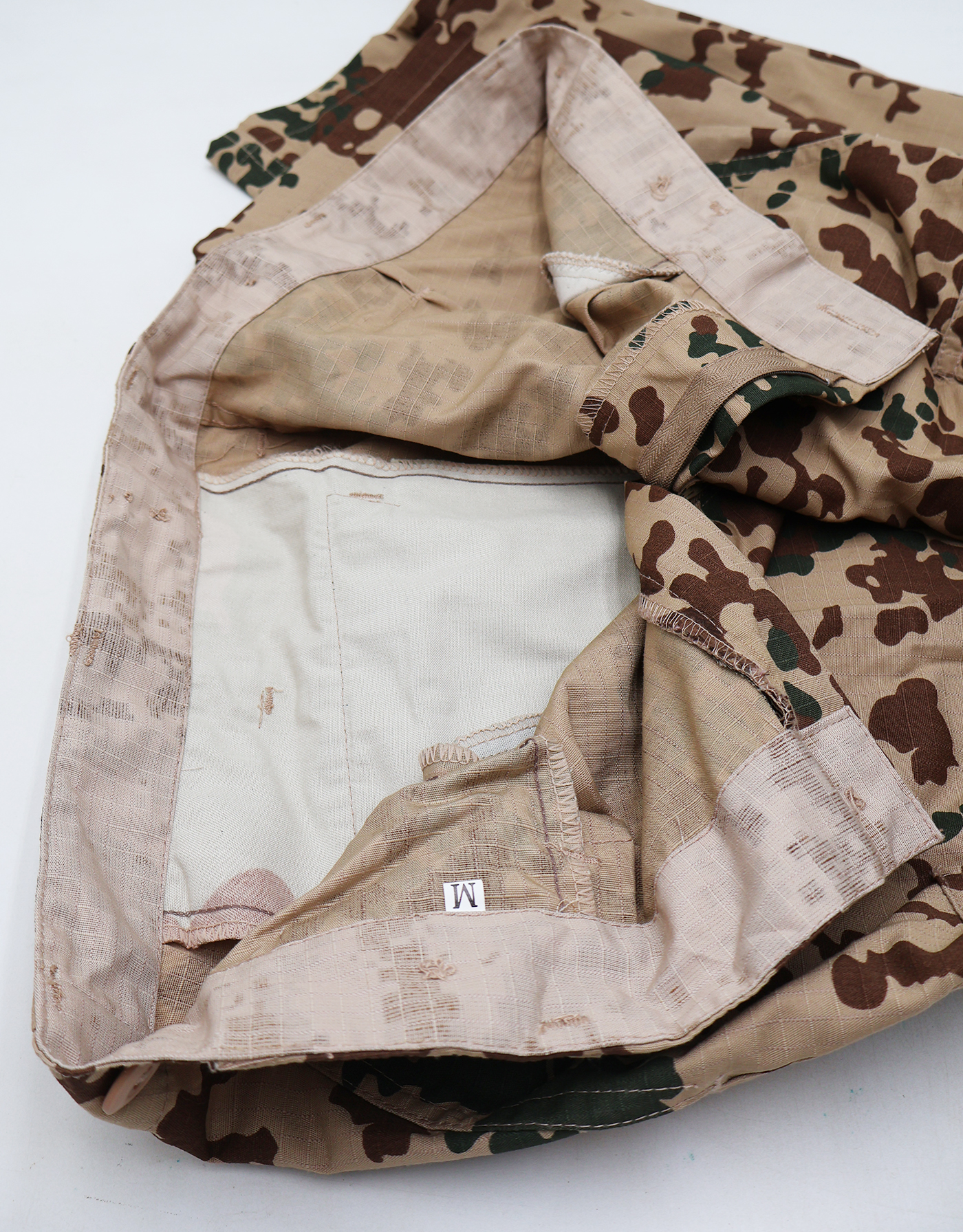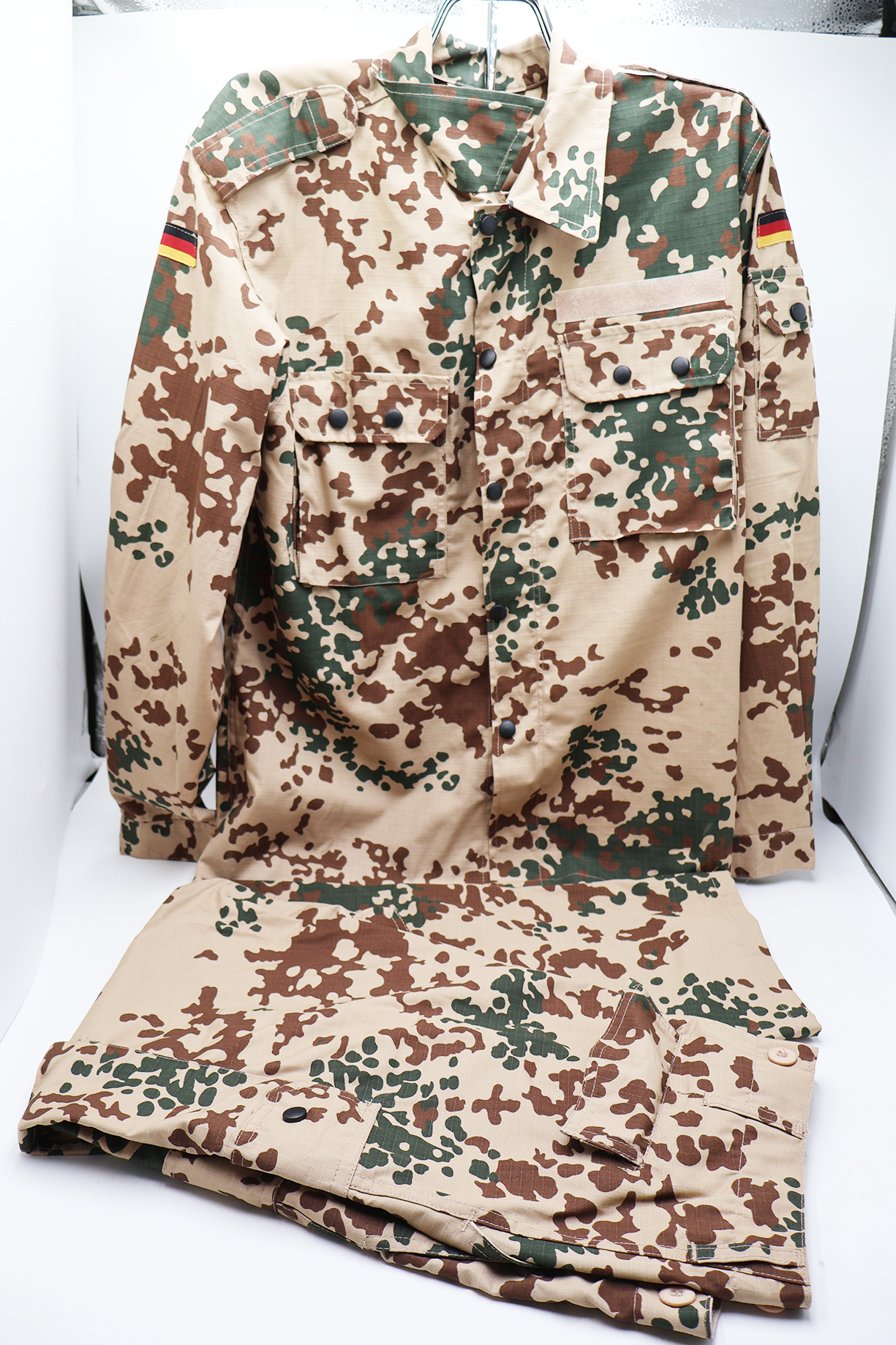 1990's German Desert Camouflage Shirt (with Velcro) and Trousers. Cotton material. Has been issued with some wear from usage. Zipper pull is broken. Overall, in good condition. Insignia is in good condition. Shirt measures shoulder to shoulder 18 inches, front chest size 21 inches, sleeve length from shoulder to cuff is 25 inches and top of the neck to the base of the shirt is 31 inches. Trousers measure 38 inches at the waist and 27 inches at the inseam.