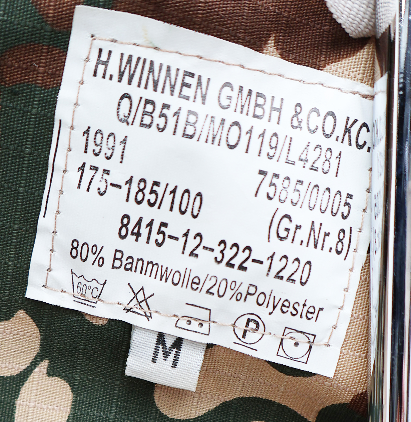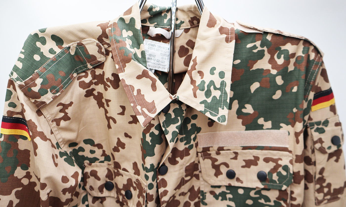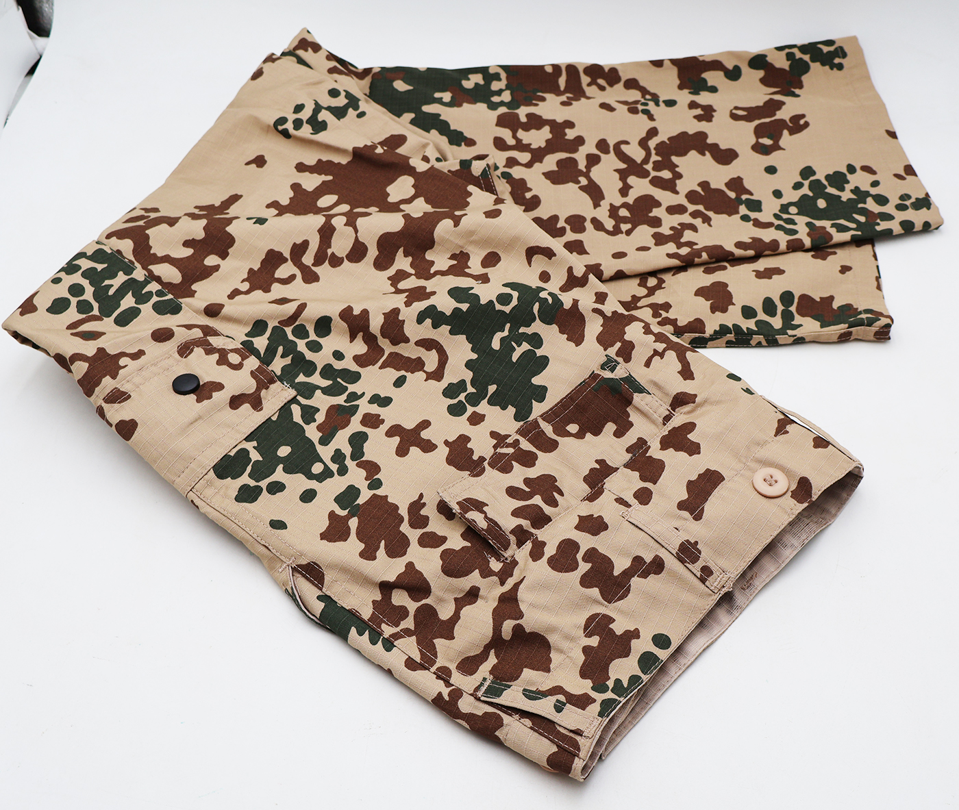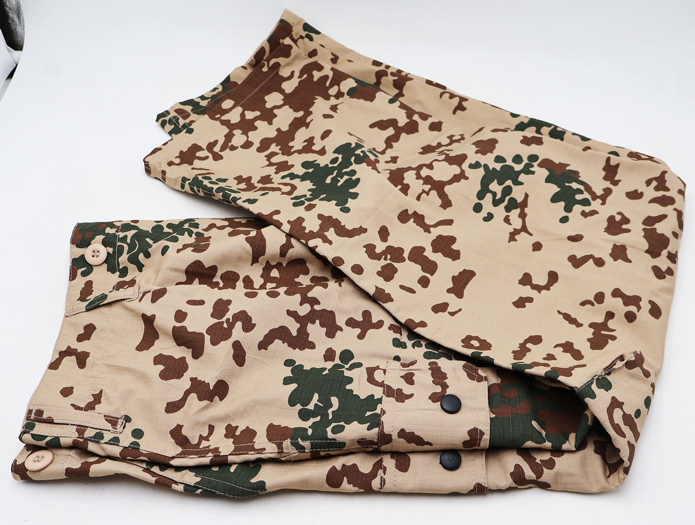 1990's German Desert Camouflage Shirt (with Velcro) and Trousers. Cotton material. Has been issued with some wear from usage. Zipper pull is broken. Overall, in good condition. Insignia is in good condition. Shirt measures shoulder to shoulder 18 inches, front chest size 21 inches, sleeve length from shoulder to cuff is 25 inches and top of the neck to the base of the shirt is 31 inches. Trousers measure 38 inches at the waist and 27 inches at the inseam.