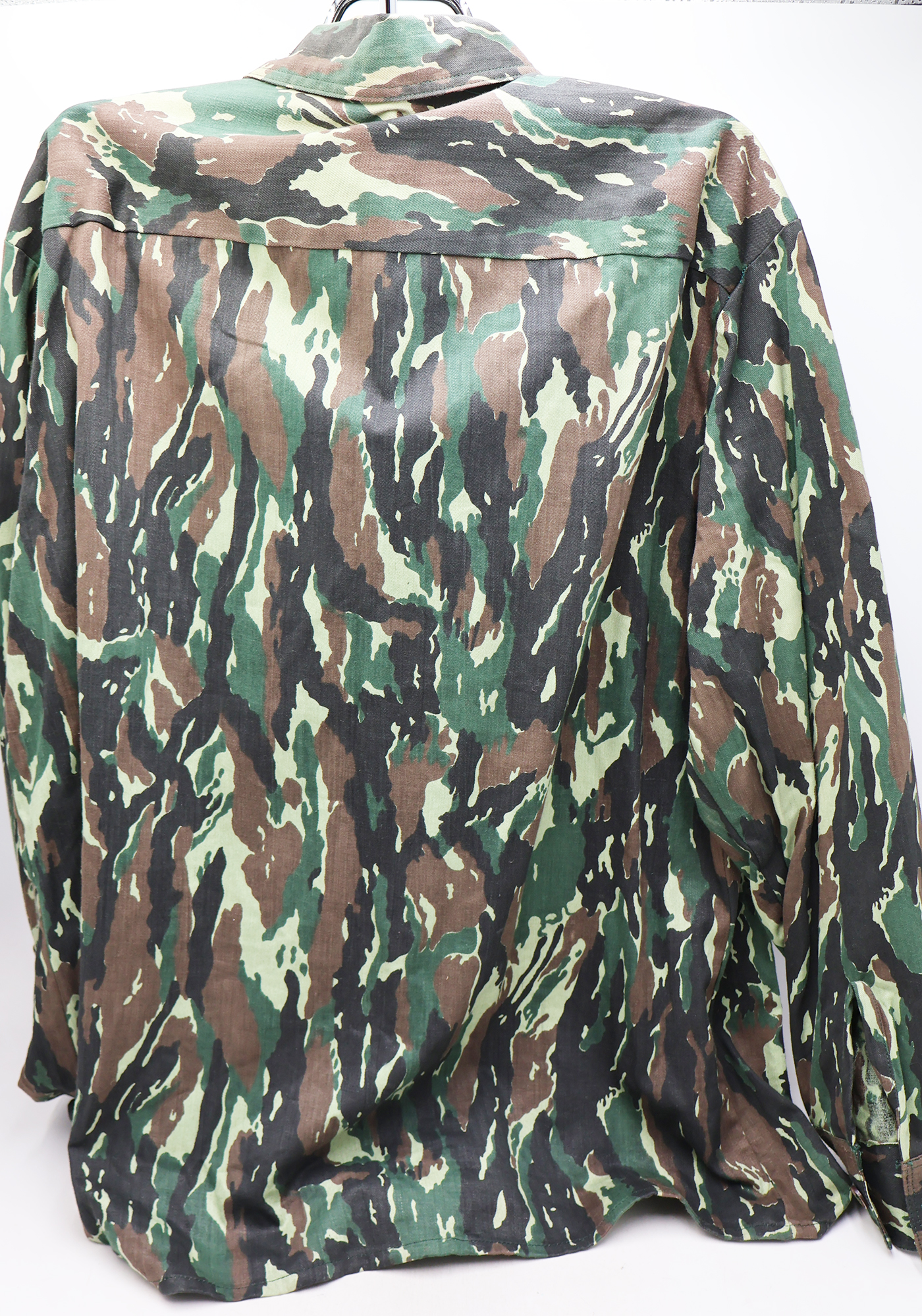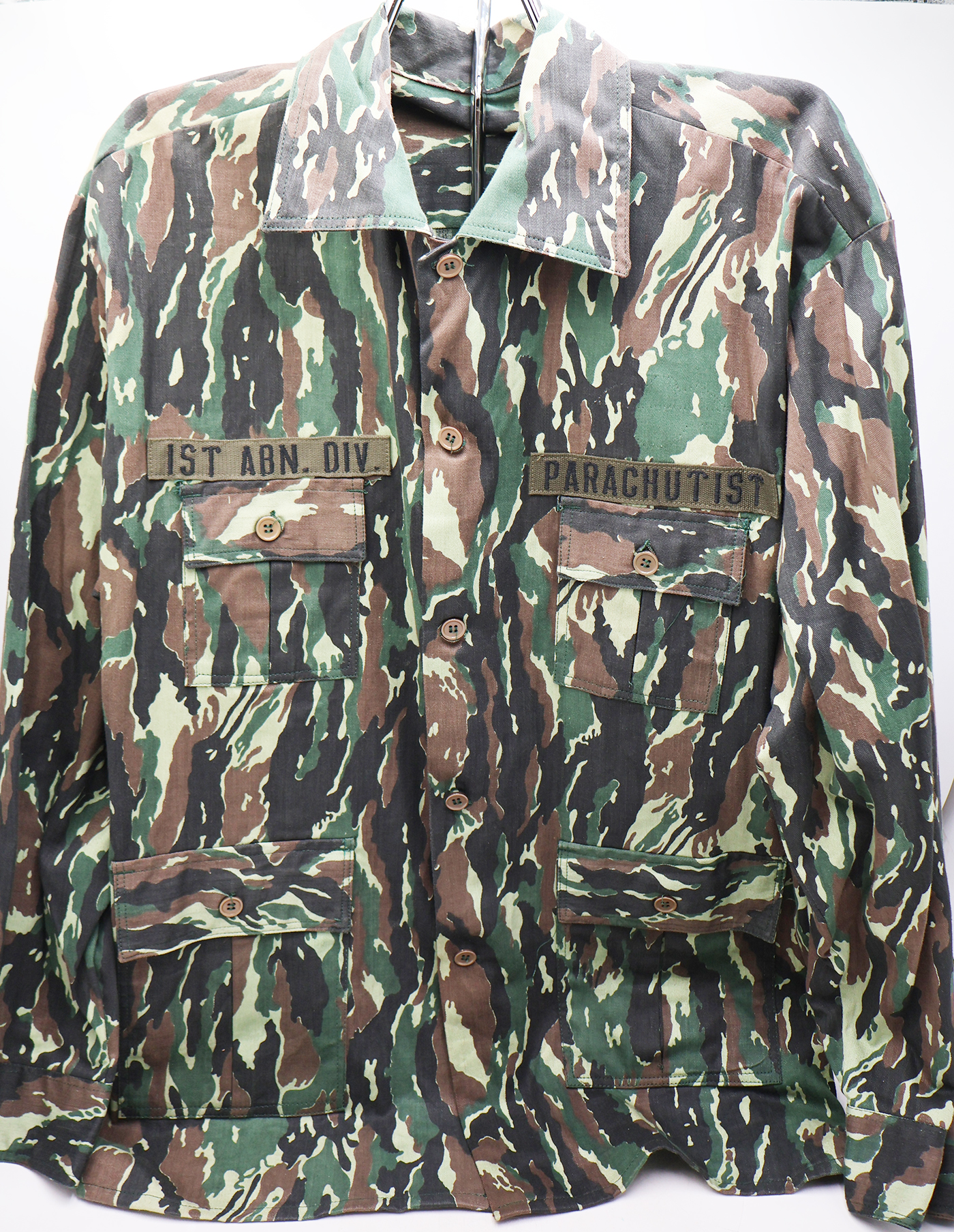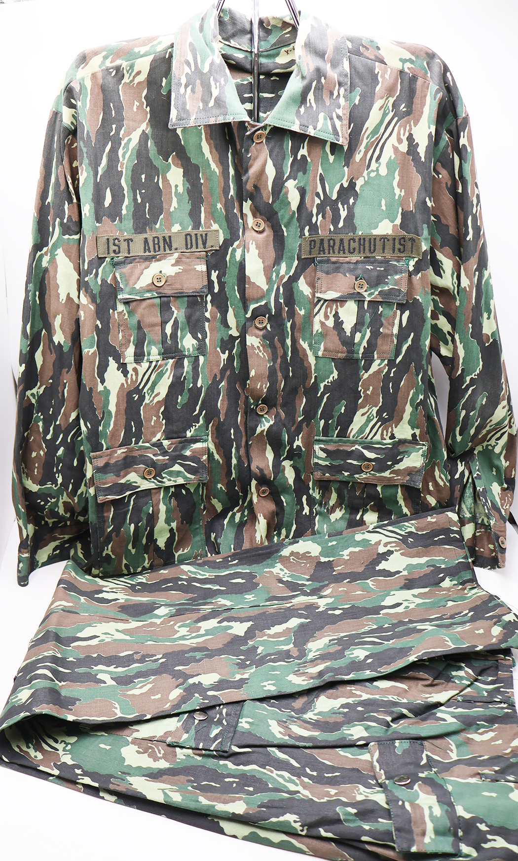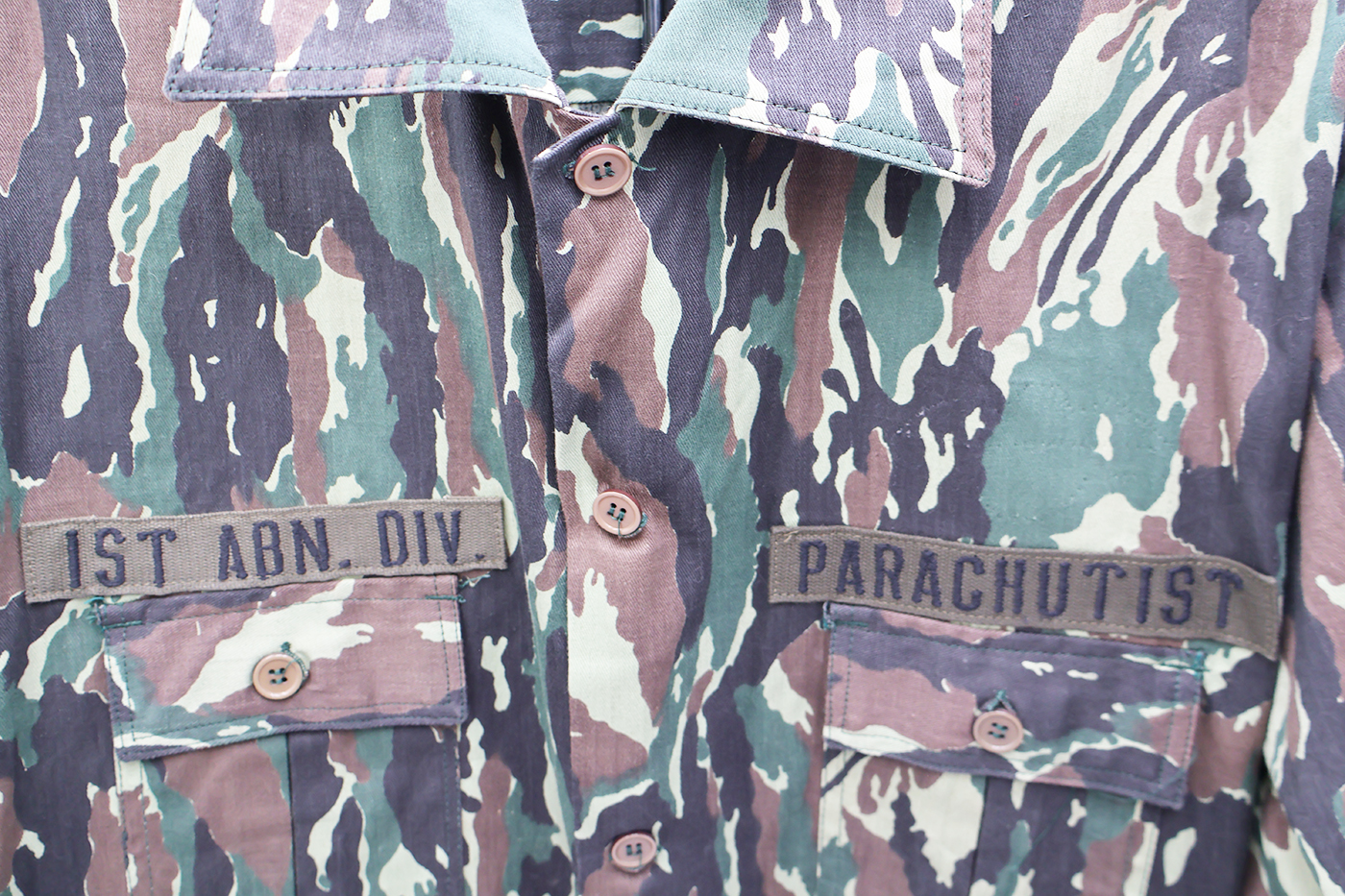 1980's Indonesian Airborne Camouflage Shirt and Trousers. Cotton material. Has been issued with some wear from usage. Overall, in good condition. Insignia is in good condition. Shirt measures shoulder to shoulder 22 inches, front chest size 24 inches, sleeve length from shoulder to cuff is 24 inches and top of the neck to the base of the shirt is 32 inches. Trousers measure 38 inches at the waist and 33 inches at the inseam.