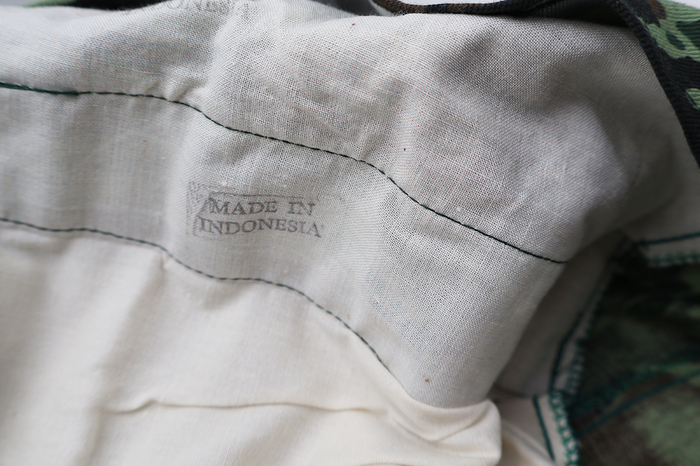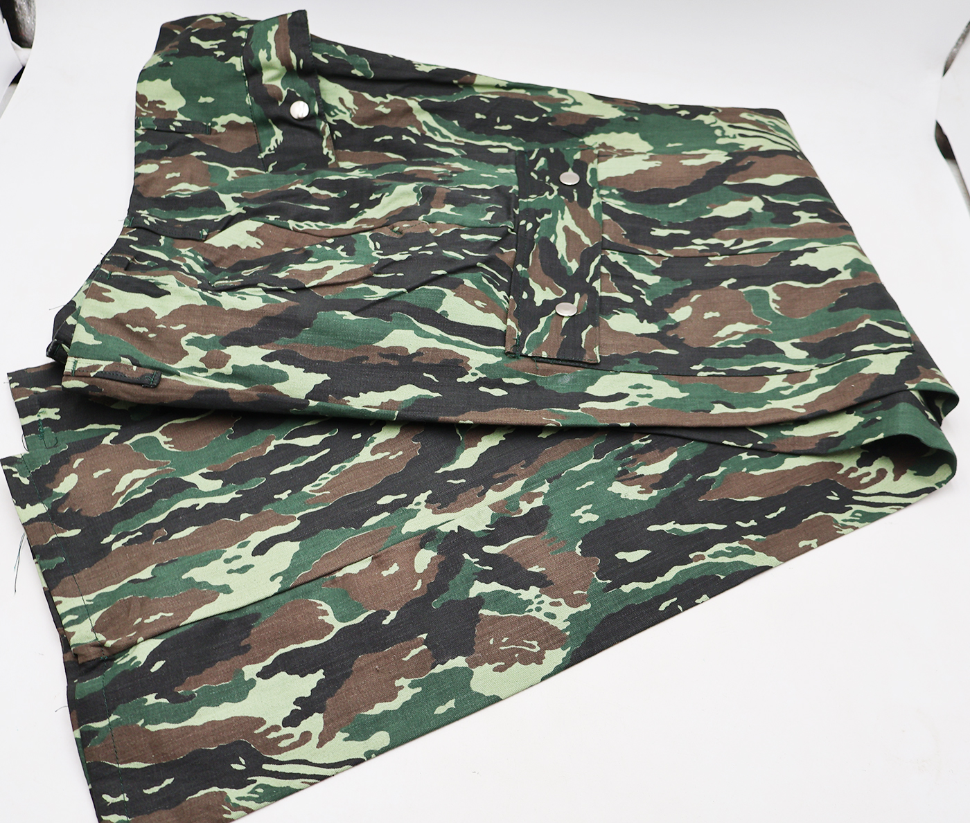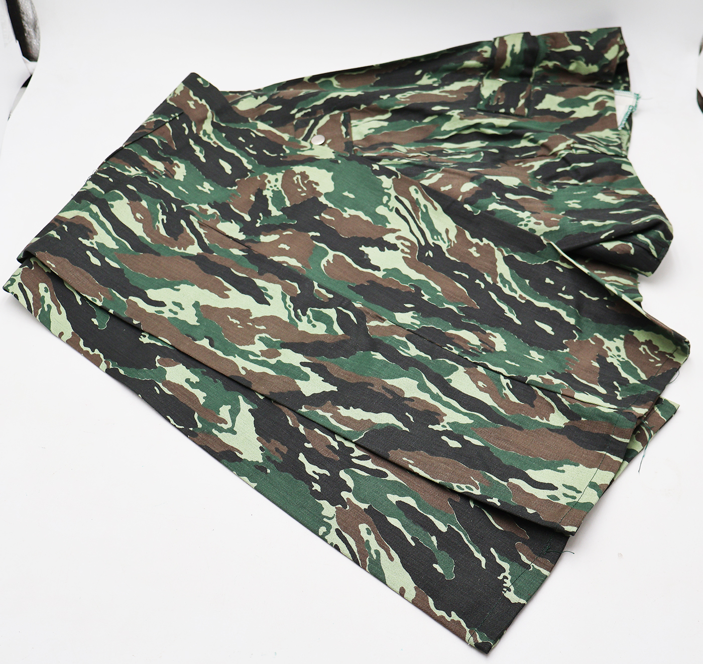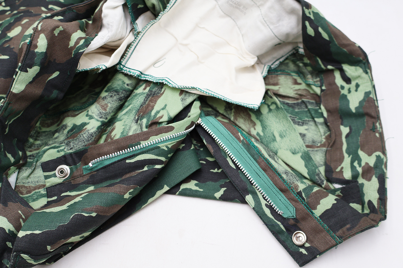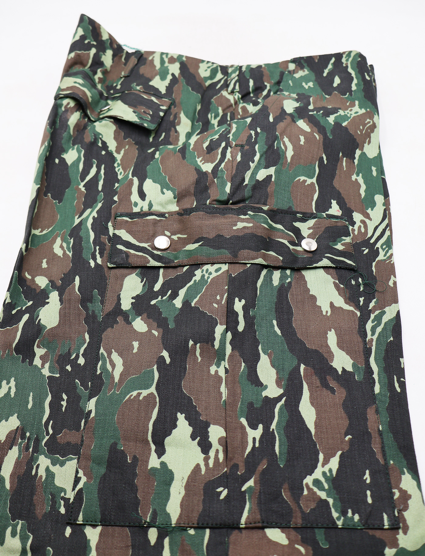 1980's Indonesian Airborne Camouflage Shirt and Trousers. Cotton material. Has been issued with some wear from usage. Overall, in good condition. Insignia is in good condition. Shirt measures shoulder to shoulder 22 inches, front chest size 24 inches, sleeve length from shoulder to cuff is 24 inches and top of the neck to the base of the shirt is 32 inches. Trousers measure 38 inches at the waist and 33 inches at the inseam.