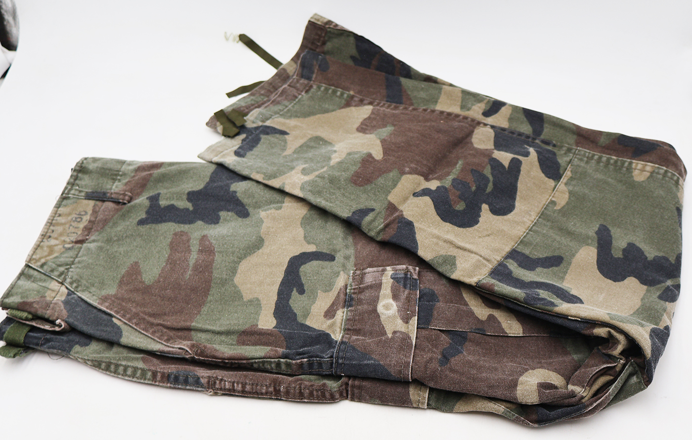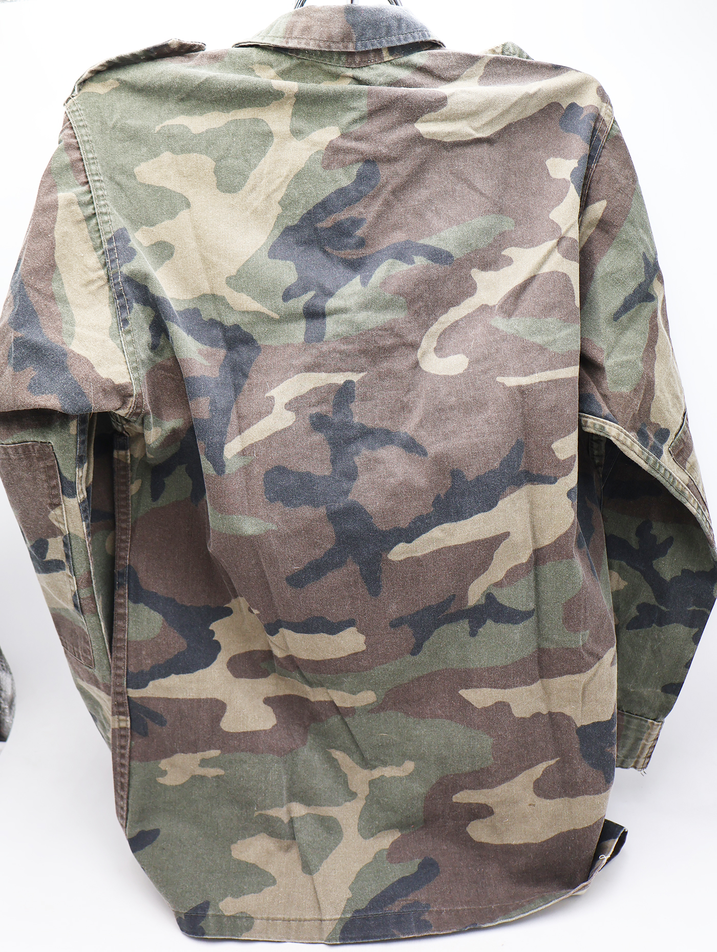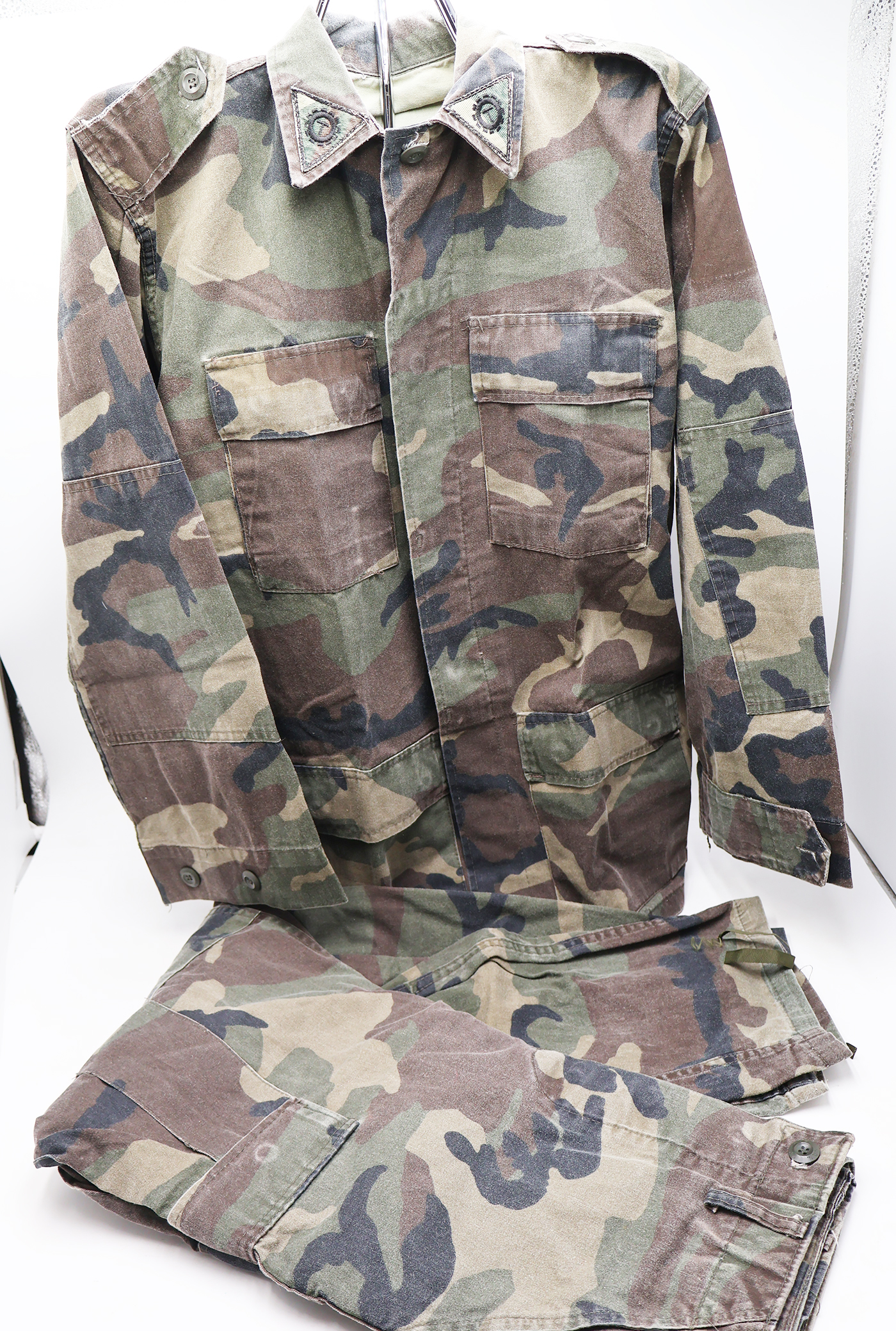 1980's Mexican Army Camouflage Shirt and Trousers. Cotton material. Has been issued with some wear from usage. Overall, in good condition. Insignia is in good condition. Shirt measures shoulder to shoulder 16 inches, front chest size 28 inches, sleeve length from shoulder to cuff is 23 inches and top of the neck to the base of the shirt is 32 inches. Trousers measure 32 inches at the waist and 30 inches at the inseam.