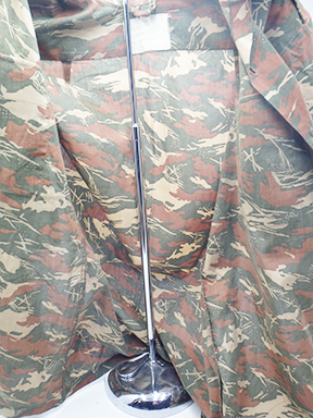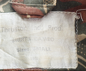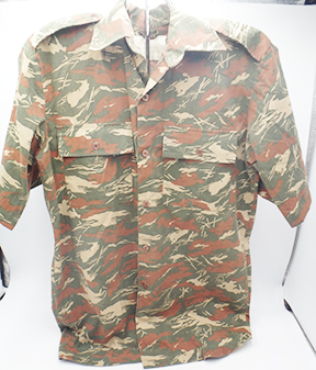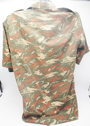 Namibian Bush War Camouflage Shirt. Cotton material. Has been issued with some wear from usage. Missing the collar button. Overall, in good condition. Shirt measures shoulder to shoulder 16 inches, front chest size 18 inches, sleeve length from shoulder to cuff is 24 inches and top of the neck to the base of the shirt is 33 inches.