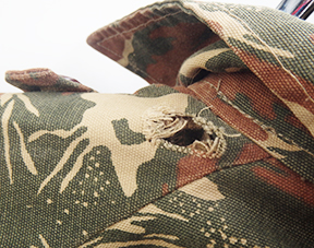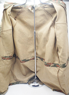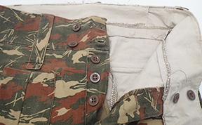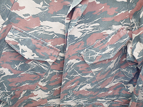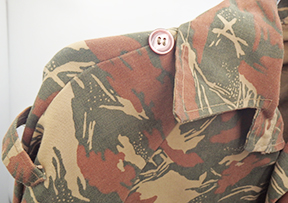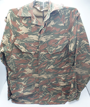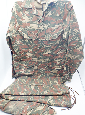 1970's Namibian Camouflage Shirt and Trousers. Cotton material. Has been issued with some wear from usage. Small hole on the left shoulder. Overall, in good condition. Insignia is in good condition. Shirt measures shoulder to shoulder 17 inches, front chest size 19 inches, sleeve length from shoulder to cuff is 24 inches and top of the neck to the base of the shirt is 31 inches. Trousers measure 30 inches at the waist and 25 inches at the inseam.