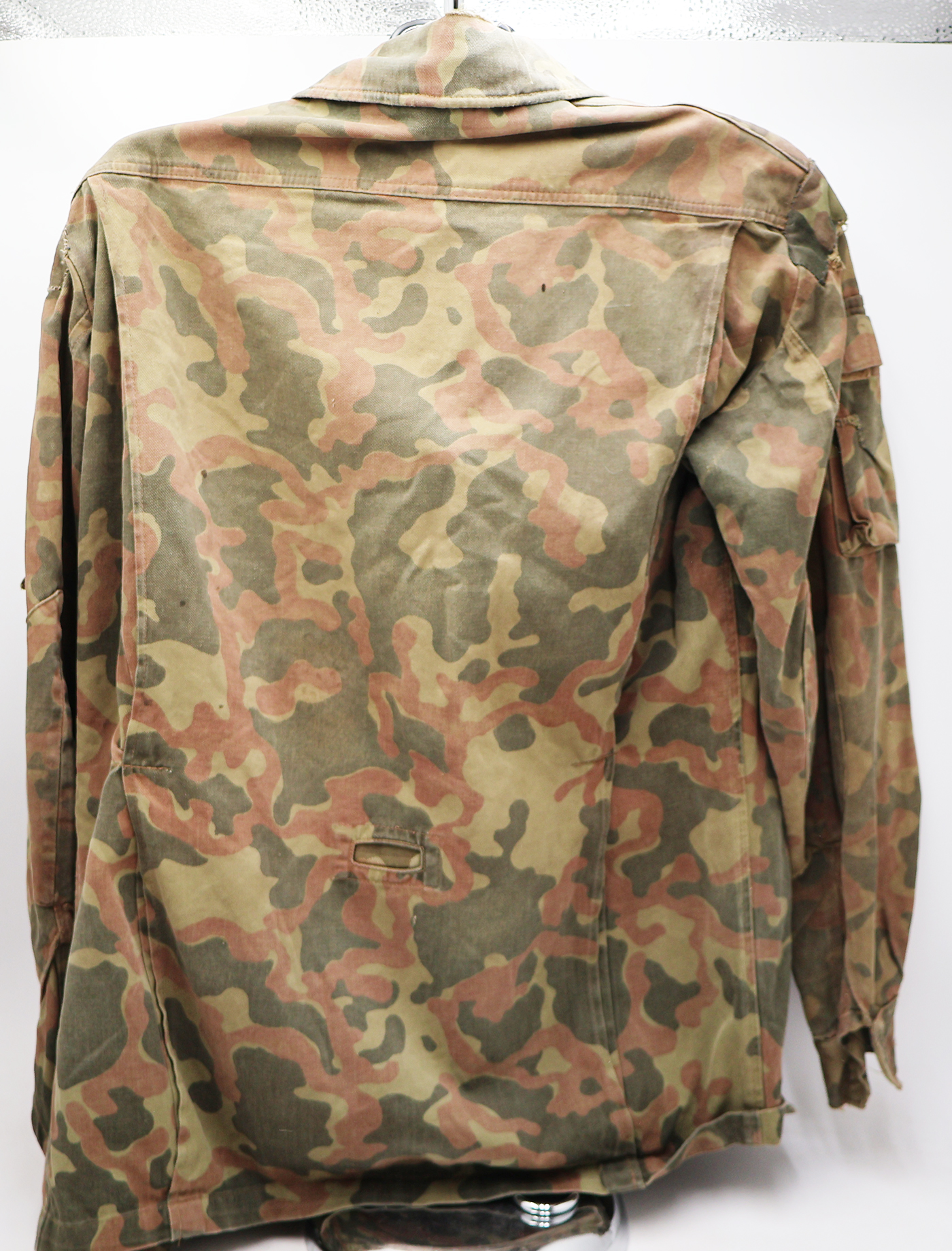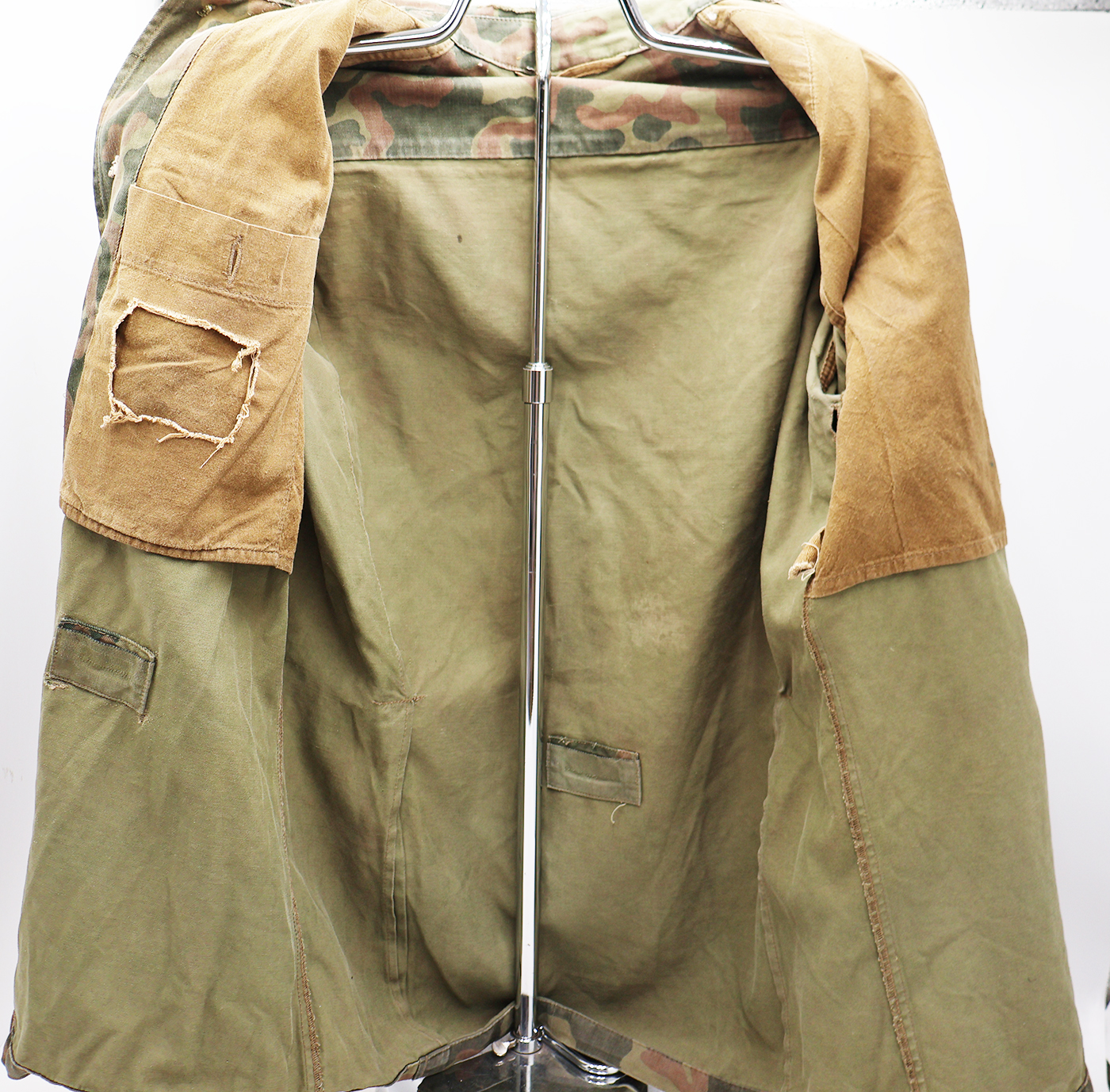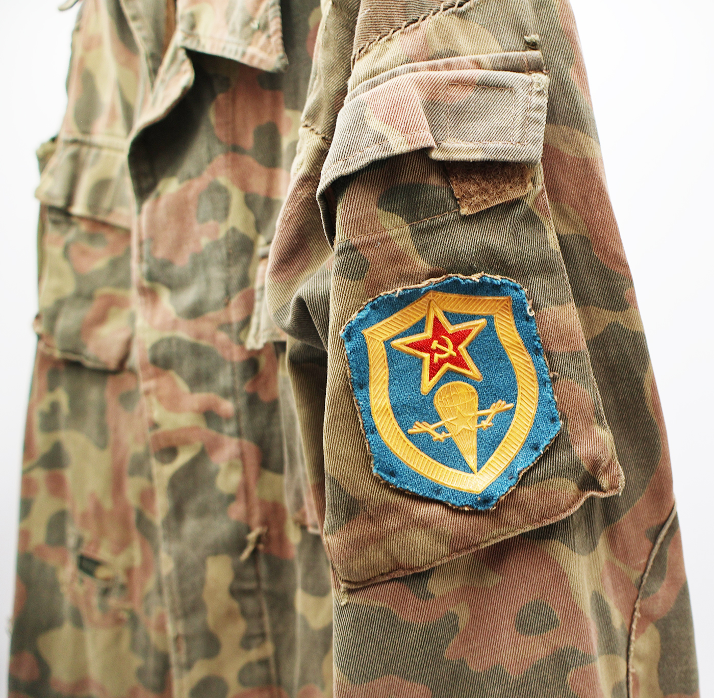 1980's Soviet Russian Airborne Camouflage Jacket. Cotton material. Has been issued with extensive wear from usage including holes, stains and period repairs. Missing buttons. Overall, in solid condition. Jacket measures shoulder to shoulder 17 inches, front chest size 19 inches, sleeve length from shoulder to cuff is 25 inches and top of the neck to the base of the Jacket is 30 inches.