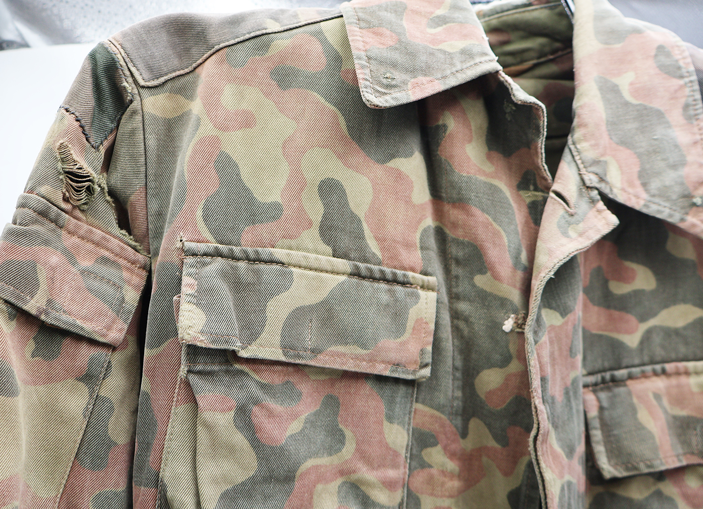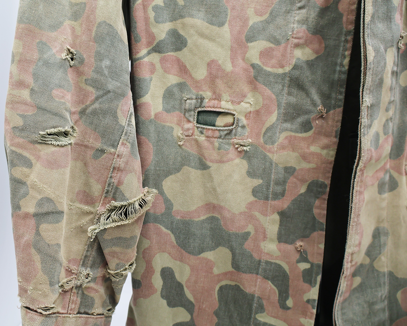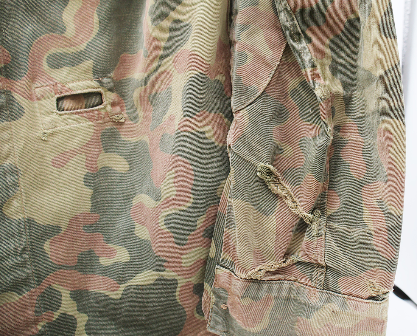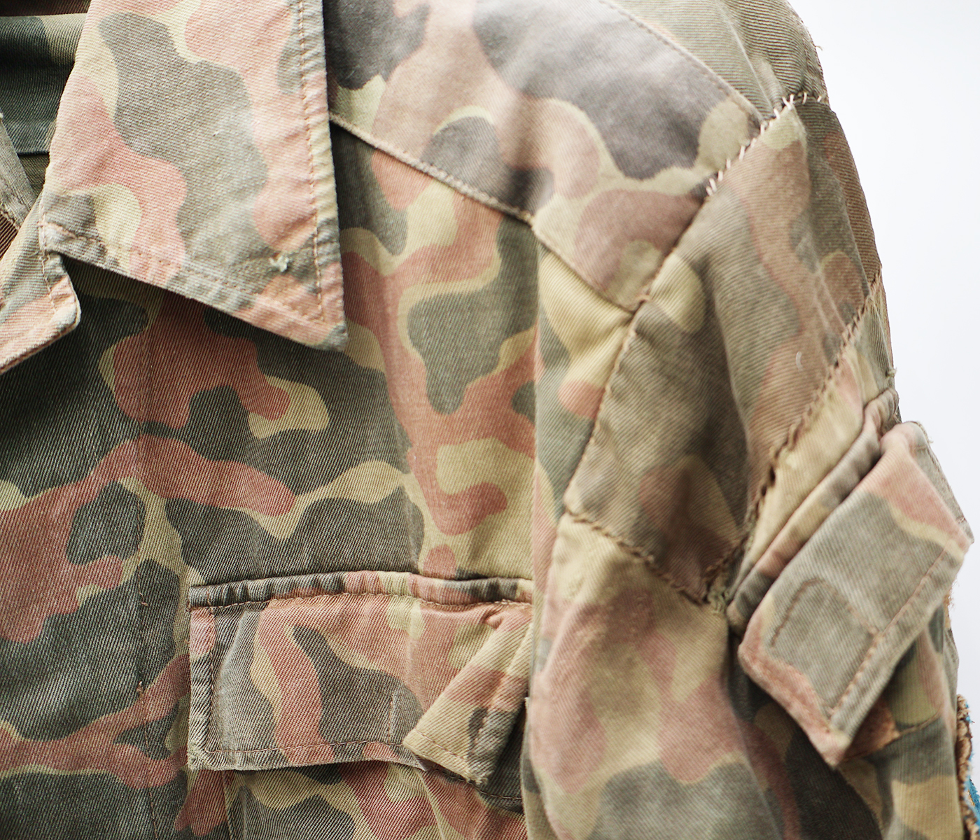 1980's Soviet Russian Airborne Camouflage Jacket. Cotton material. Has been issued with extensive wear from usage including holes, stains and period repairs. Missing buttons. Overall, in solid condition. Jacket measures shoulder to shoulder 17 inches, front chest size 19 inches, sleeve length from shoulder to cuff is 25 inches and top of the neck to the base of the Jacket is 30 inches.