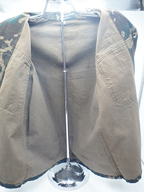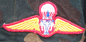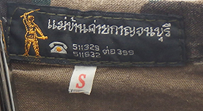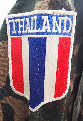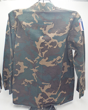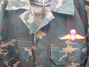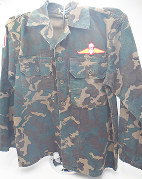 Thailand Airborne Camouflage Shirt. Cotton material. Has been issued with some wear from usage. Insignia is in good condition. Shirt measures shoulder to shoulder 16 inches, front chest size 18 inches, sleeve length from shoulder to cuff is 21 inches and top of the neck to the base of the shirt is 25 inches.