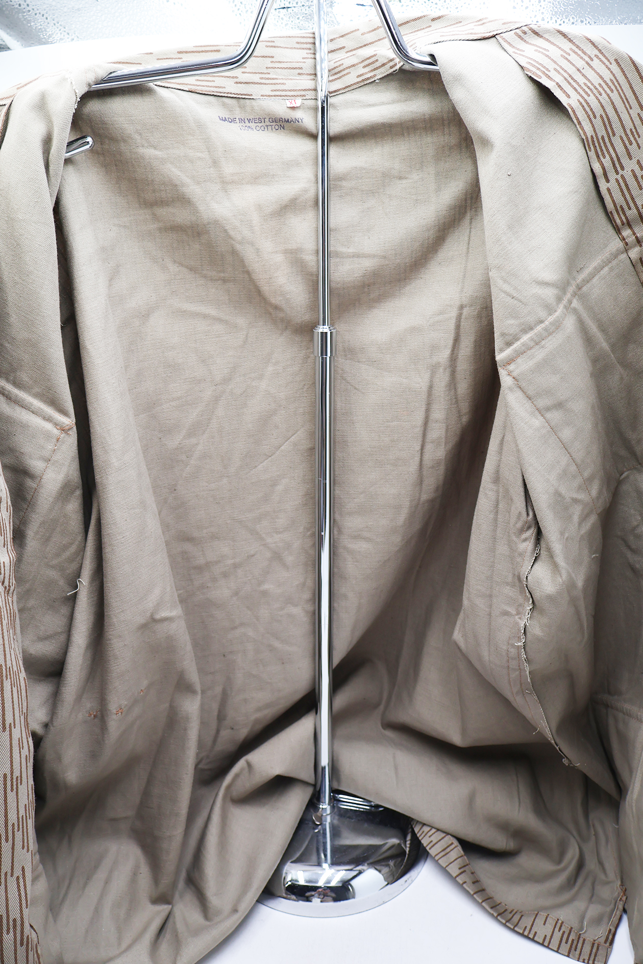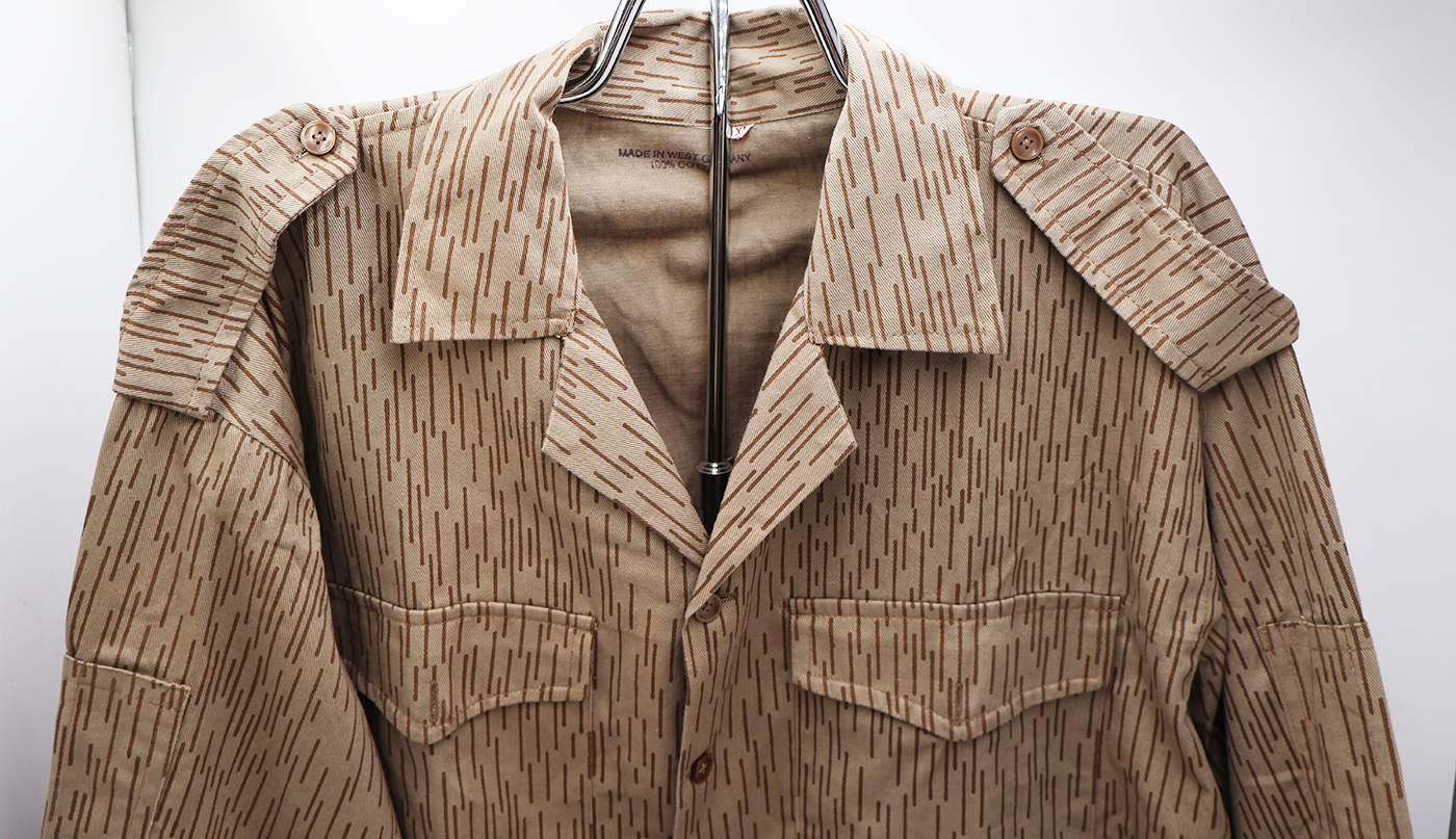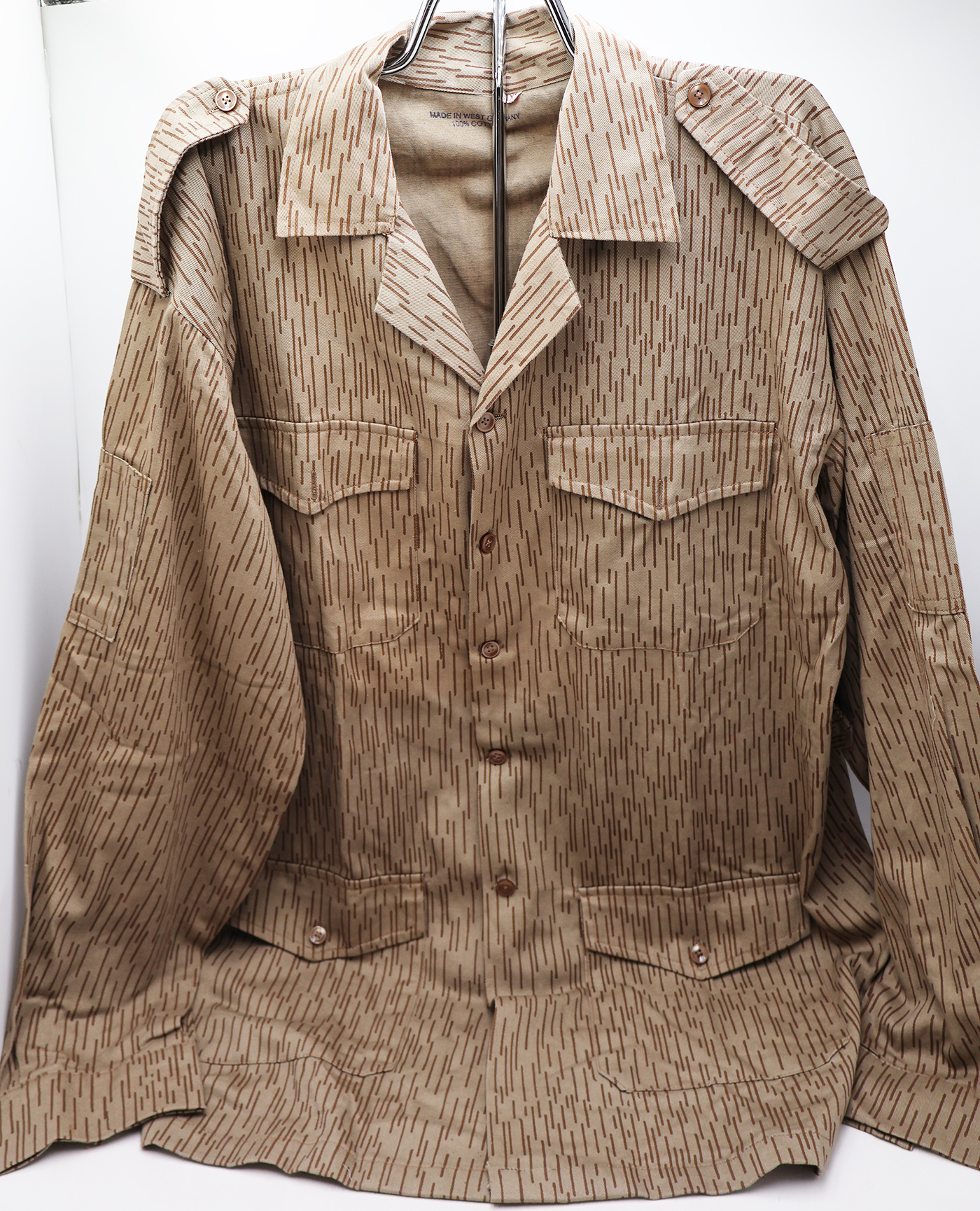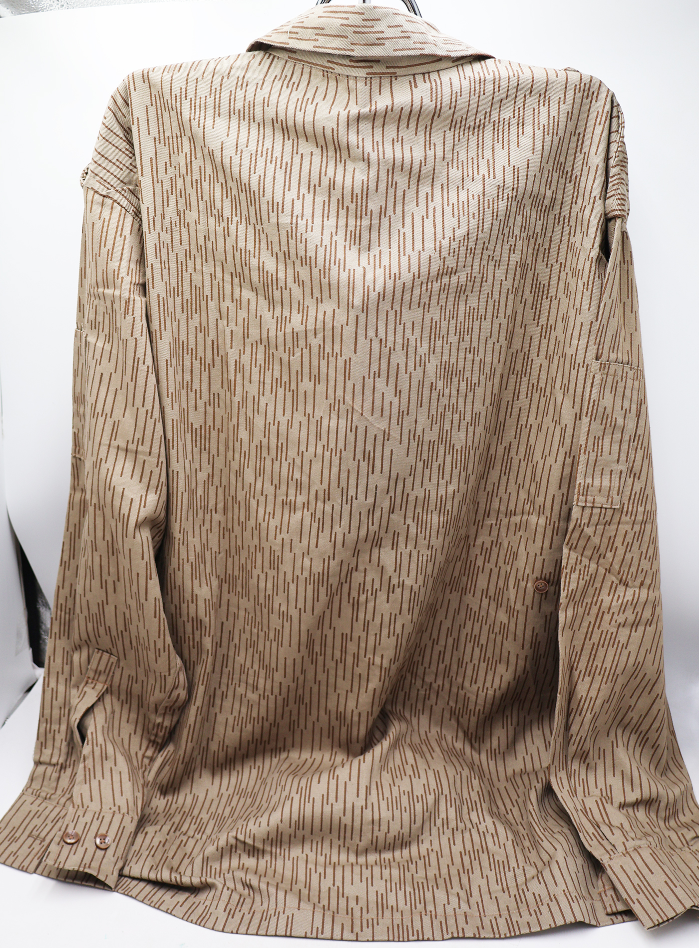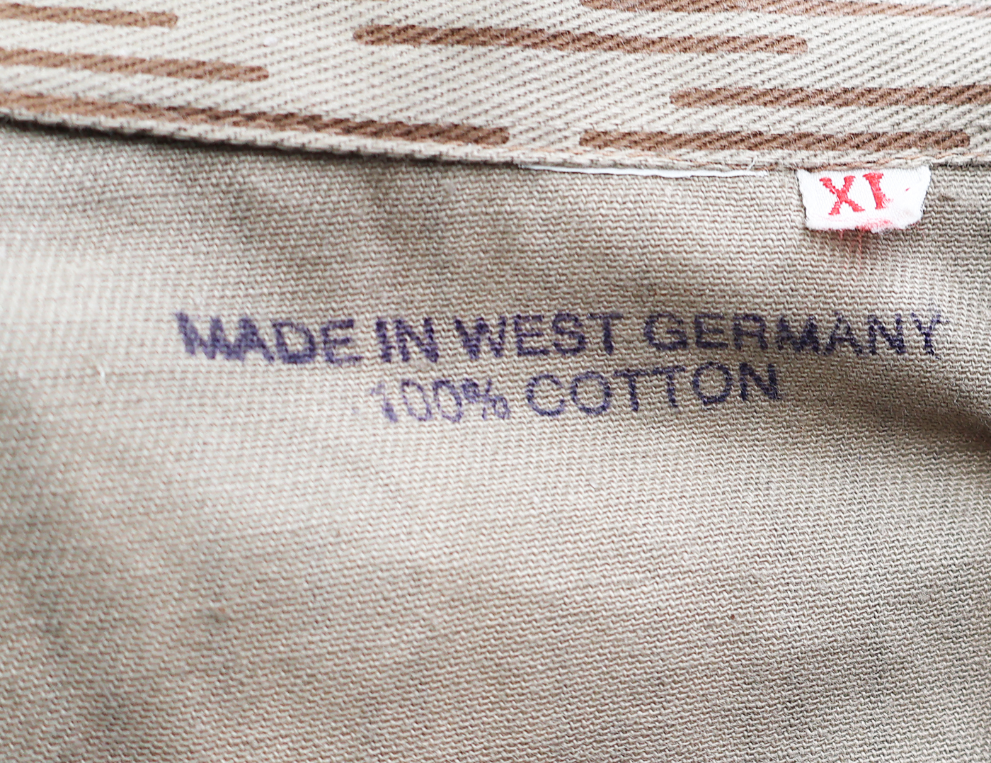 Cold War era West German Camouflage Shirt. Cotton material. Has been issued, but looks hardly worn. The shirt is in very good condition. Shirt measures shoulder to shoulder 24 inches, front chest size 26 inches, sleeve length from shoulder to cuff is 26 inches and top of the neck to the base of the shirt is 37 inches.
