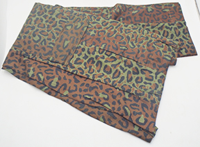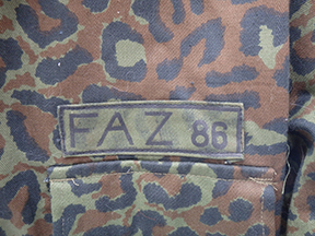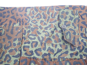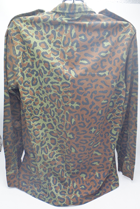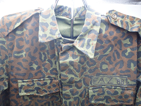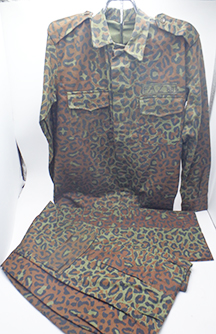 1970's Zairean Camouflage Shirt and Trousers. Cotton material. Has been issued with some wear from usage. Overall, in good condition. Insignia is in good condition. Shirt measures shoulder to shoulder 17 inches, front chest size 19 inches, sleeve length from shoulder to cuff is 24 inches and top of the neck to the base of the shirt is 31 inches. Trousers measure 36 inches at the waist and 34 inches at the inseam. This is one of my favorite patterns.