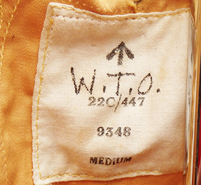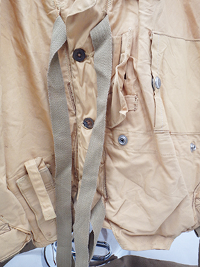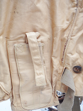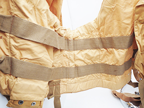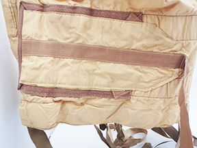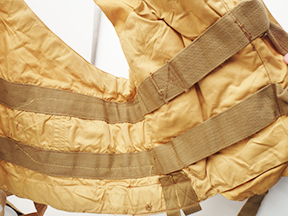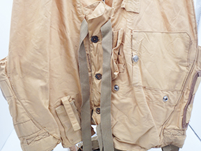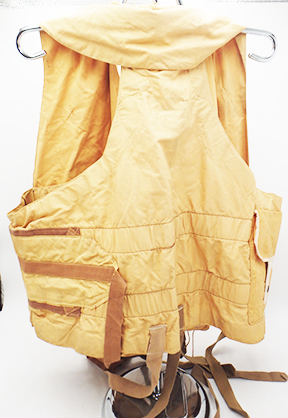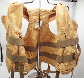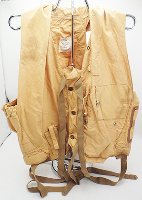 WWII British 41 Pattern RAF Mae West Life Preserver. The body of the life preserver is intact with no notable wear or stains. A size Medium. Missing the CO2 bottle, bladders and dye packs. Zipper on the back is clean, but sticks. Overall in good condition.