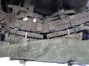 Cold War Era British Pattern 58 Webbing Set. The set comes with yoke, large pack, belt, water bottle cover, left and right ammo pouches, two kidney pouches and poncho roll. All of the pouches are empty. All of the webbing is solid with no damage or missing parts. The gear is worn and has some staining from usage. The webbing system was seen used in conflicts such as the Troubles in Northern Ireland and the Falkland War.
