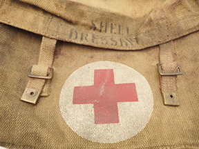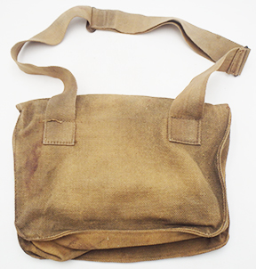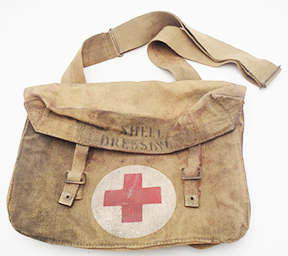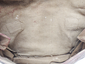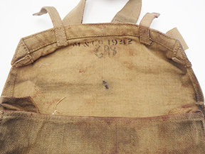 WWI British Shell Dressing Medic bag. The webbing is in good shape with some wear and staining from usage. The brass hardware is in good shape and the straps are strong and intact. The makers mark is M & Co 1942.