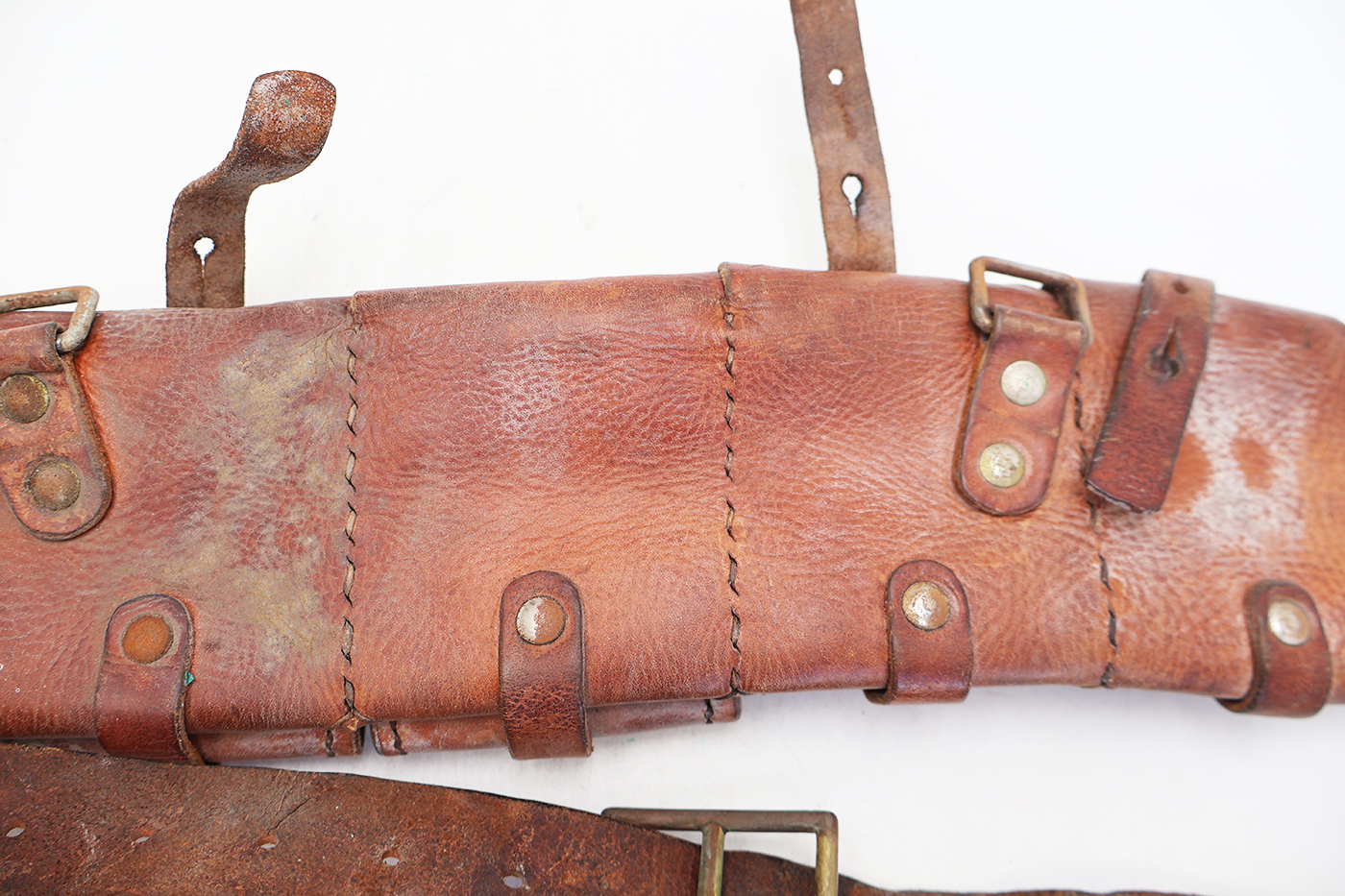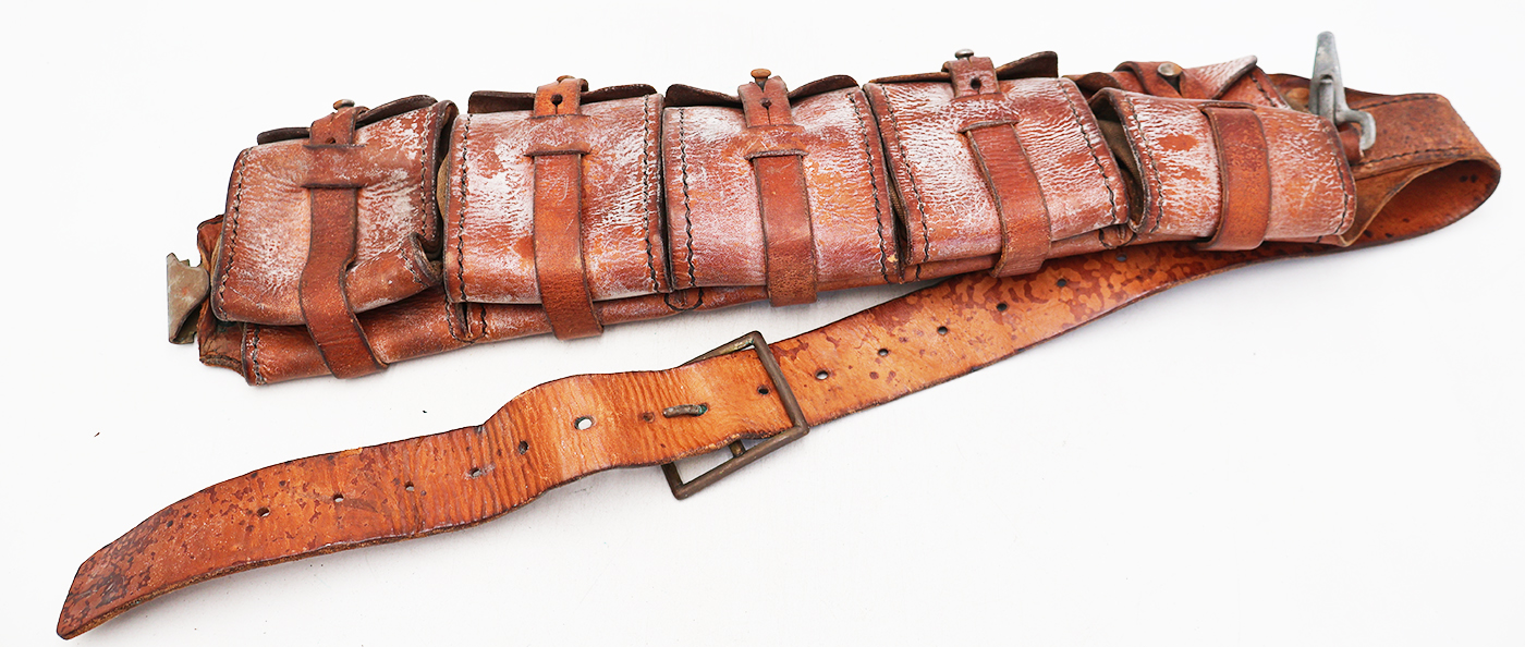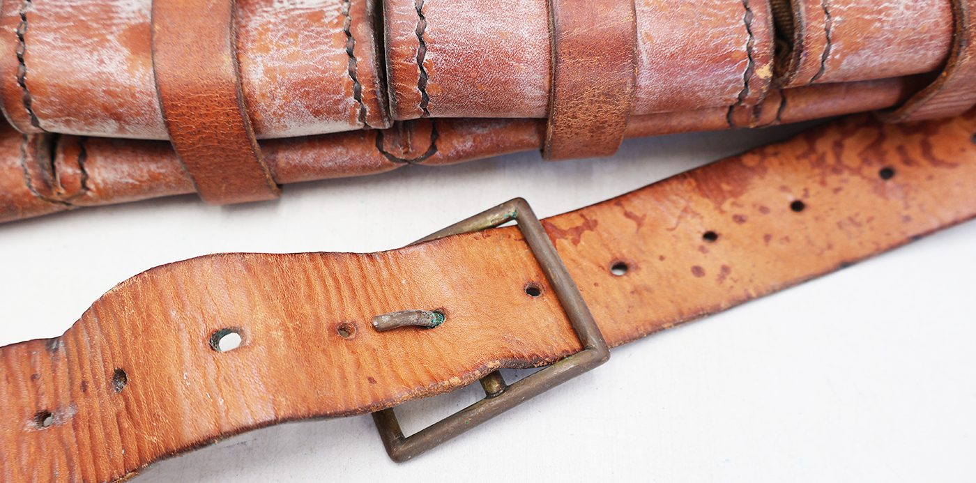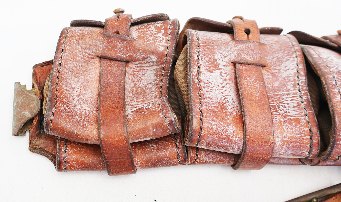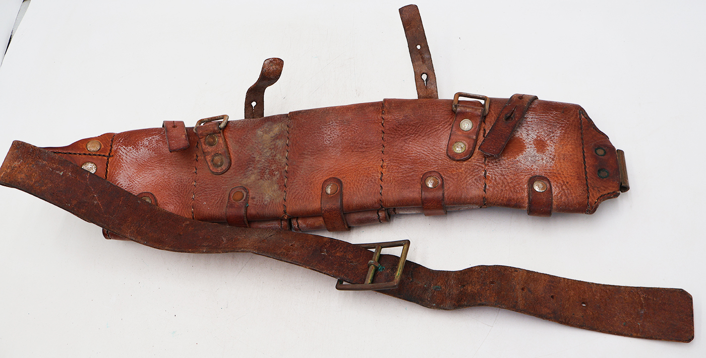 WWI or WWII era Swedish M-10 Mauser 5 Pocket Bandolier. Leather body has some wear and discoloration from usage. But the leather is still supple and intact. Metal hardware has minor corrosion. Bandolier can easier be cleaned up to its original condition.