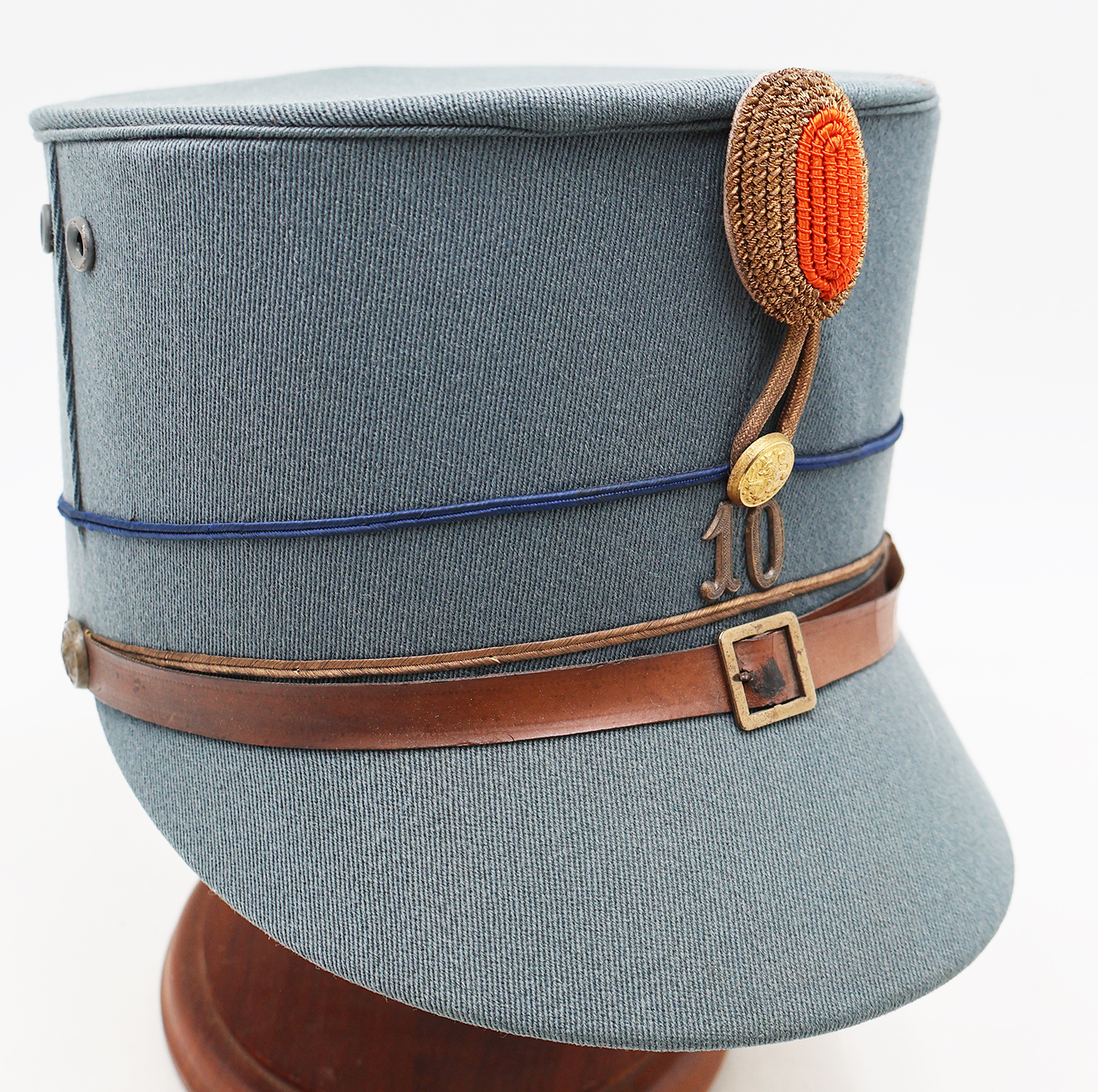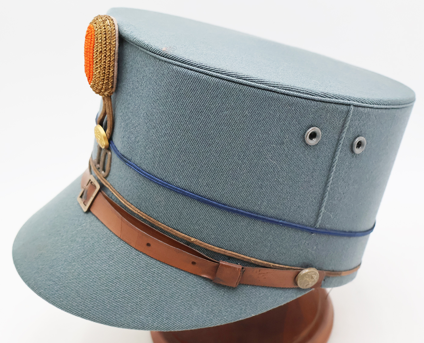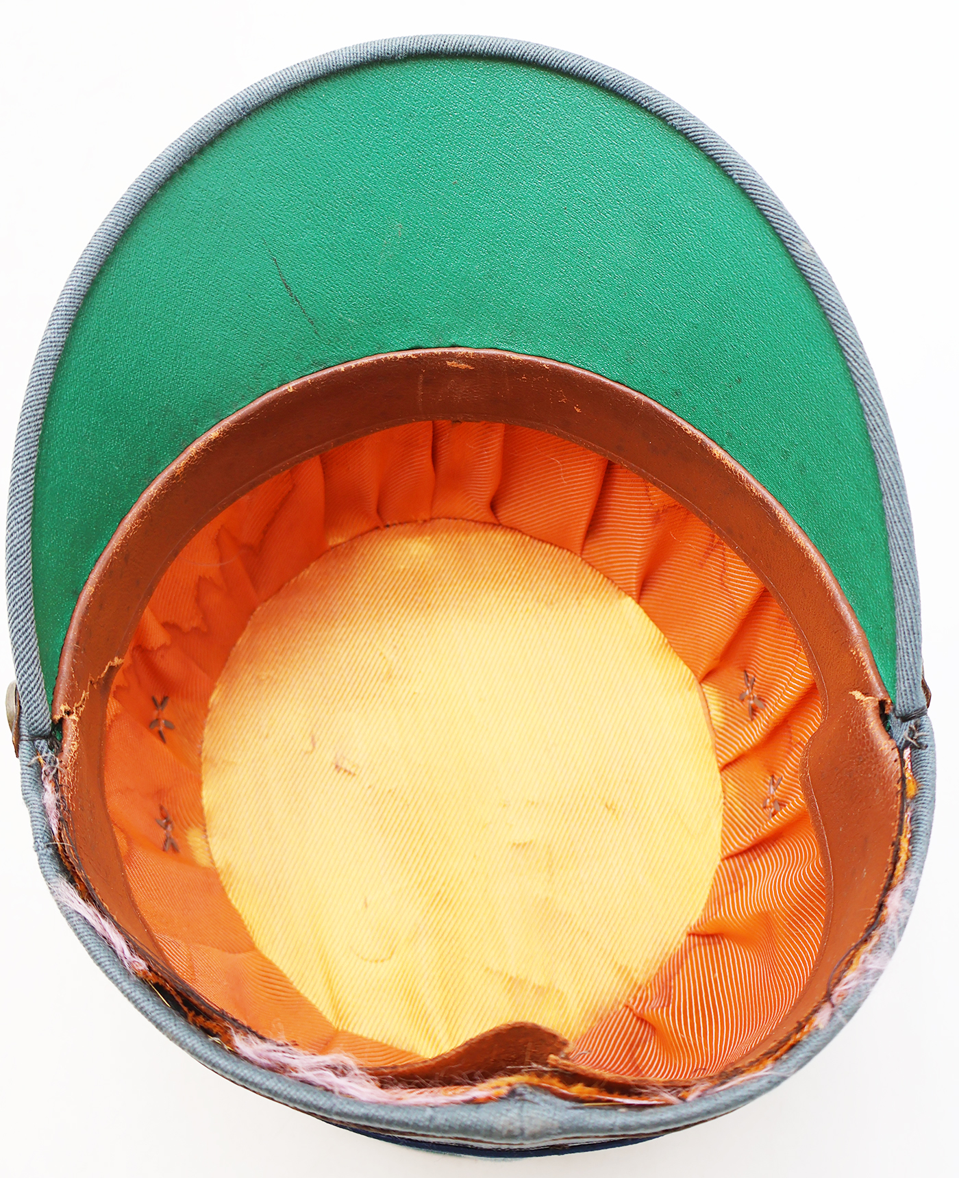 WWII era Dutch Model 1916 Netherlands Infantry Officers Kepi. Has good form and is in good condition. Bullion is clean and wool is in good shape. Leather sweatband and chinstrap is dry and cracked (see photos). The liner is worn but intact.