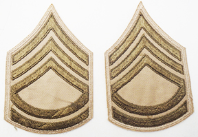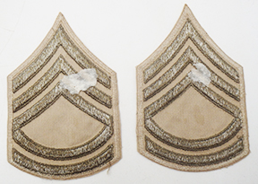 WWII era US Army Khaki Sergeant First Class Rank Chevrons. Khaki/cotton construction. Chevrons are in very good condition and appear unused.