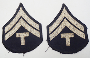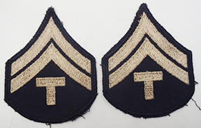 WWII era US Army Twill Tech Corporal Rank Chevrons. Khaki twill construction. Chevrons are in good condition and appear unused.