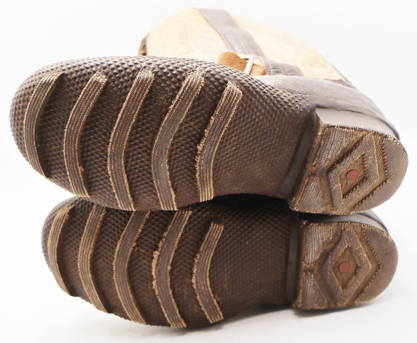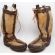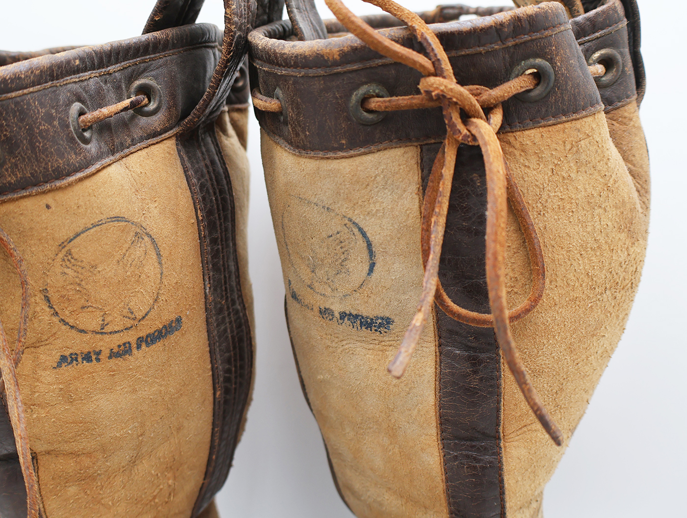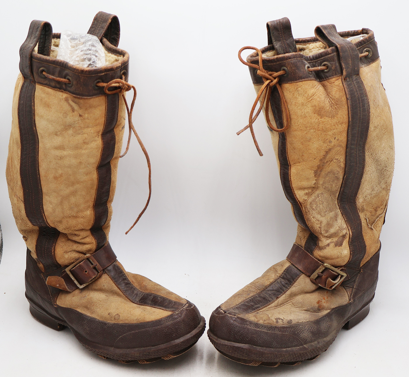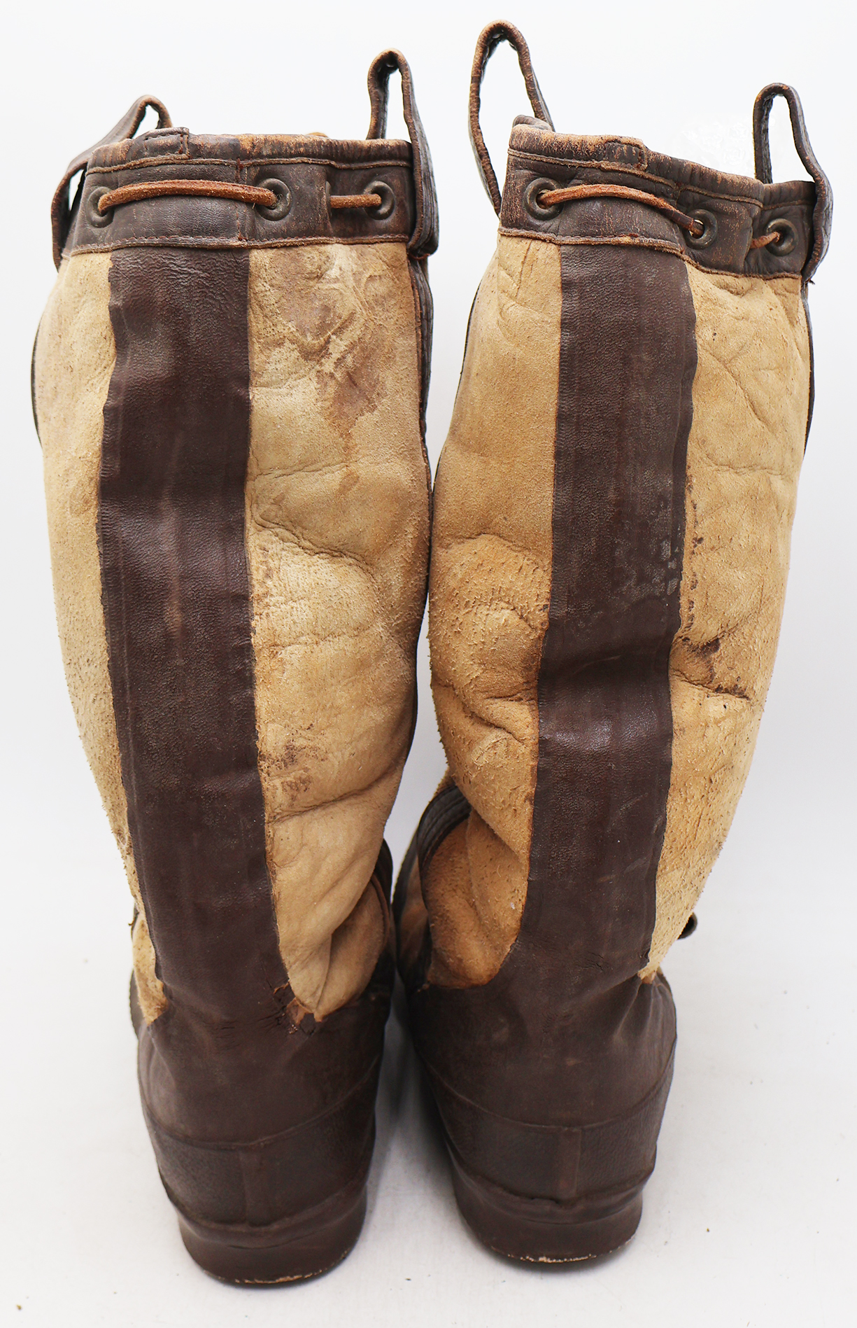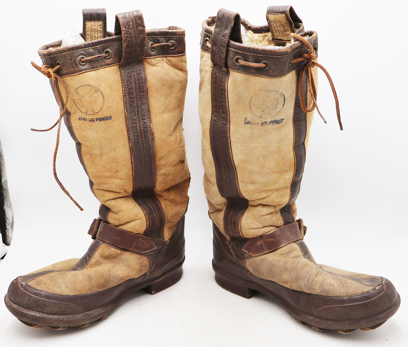 WWII era A-10 Flight Boots. Leather boots are very supple and have no notable damage and just some minor period repairs. Rubber soles are intact and very supple. Wool lining is in good shape. Leather laces are intact, but brittle. The boots are intact, but are still showing age and are good for display and not wear. Labelled a size large and are made by US RUBBER CO. These are the boots that are worn with the B-7 flight jacket.