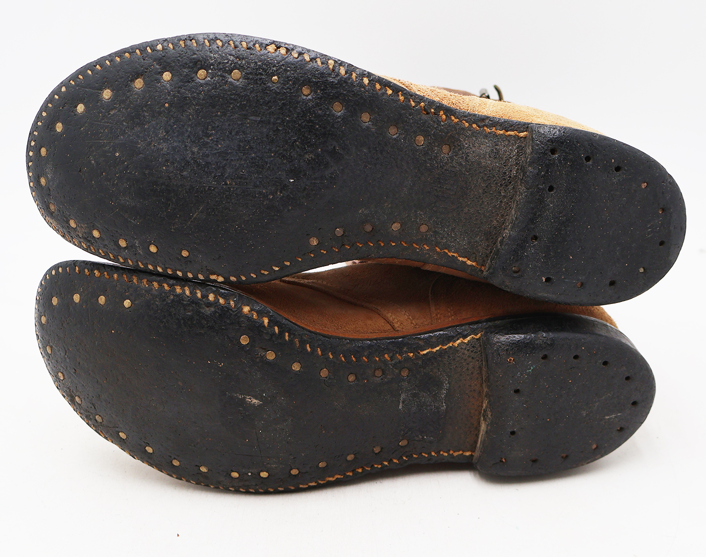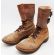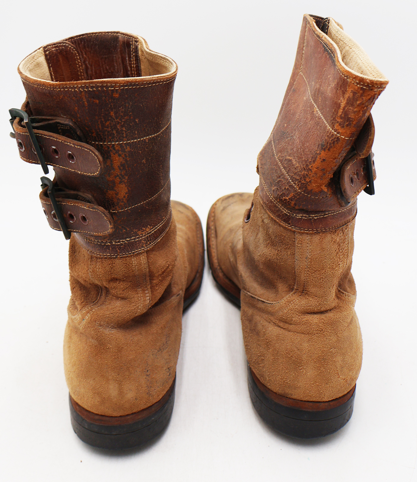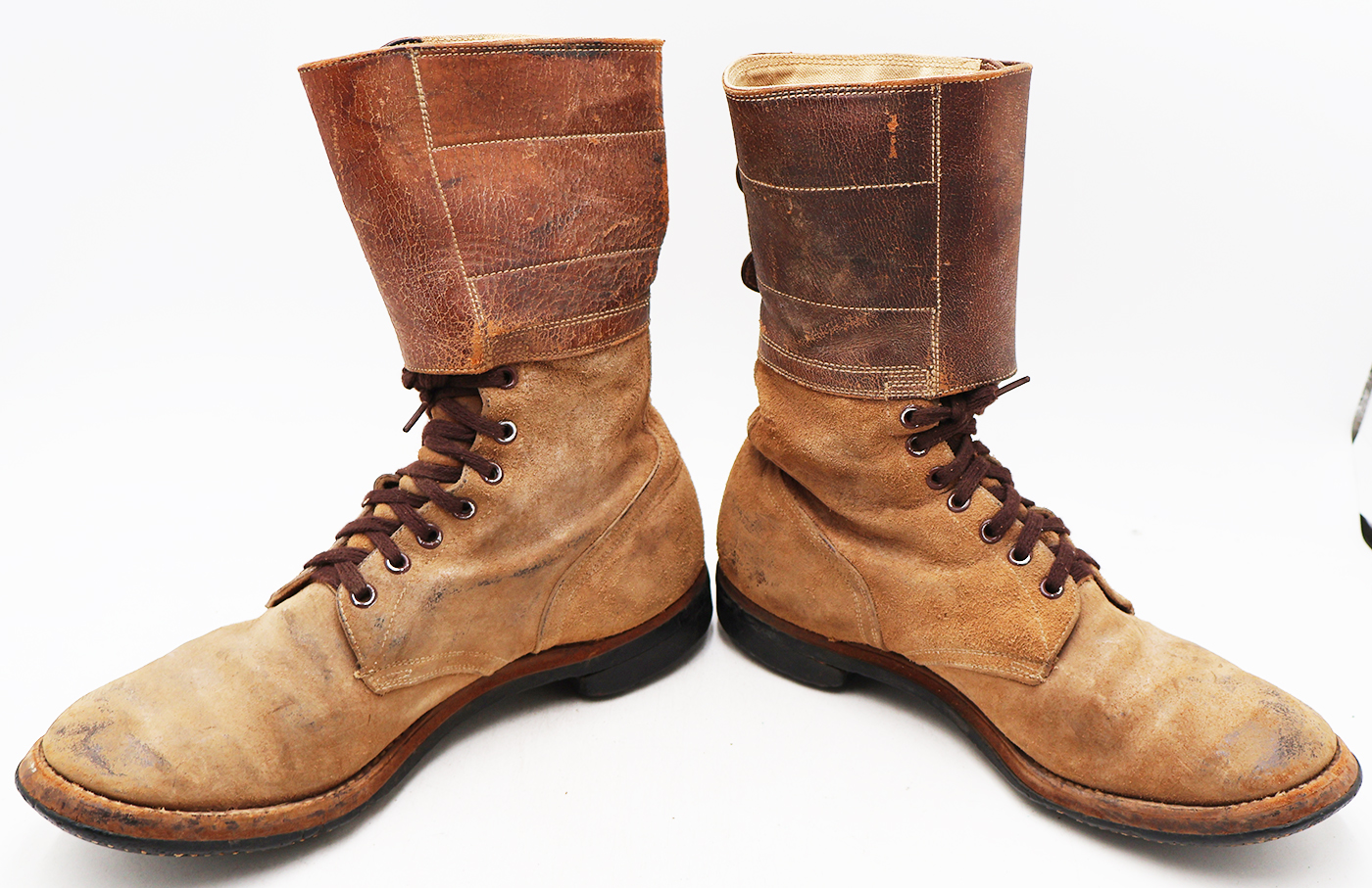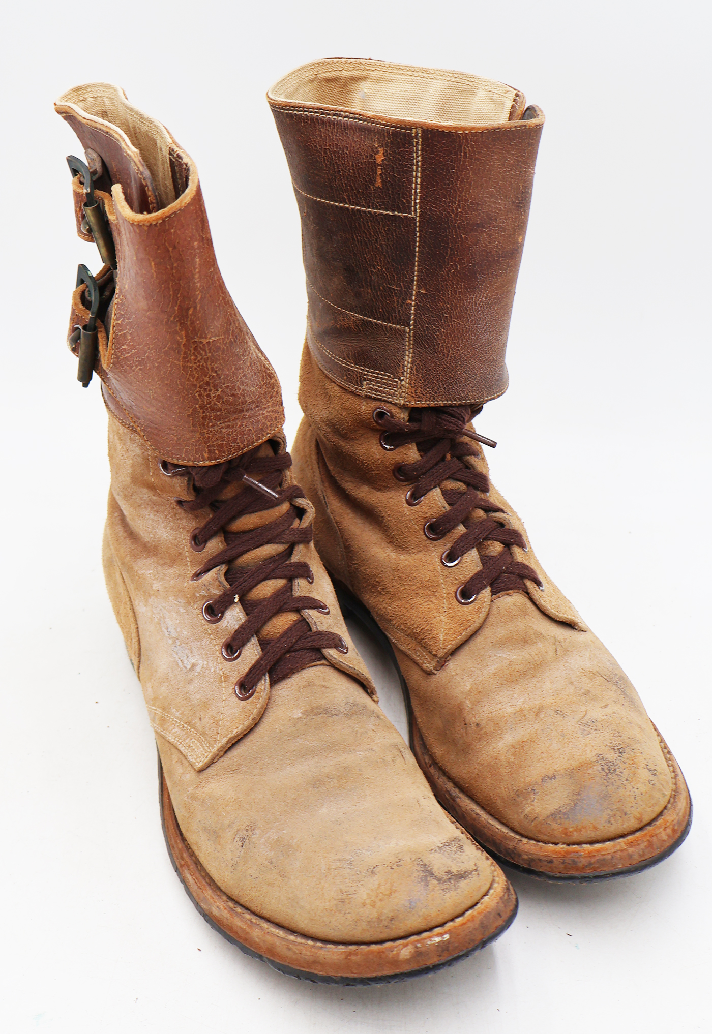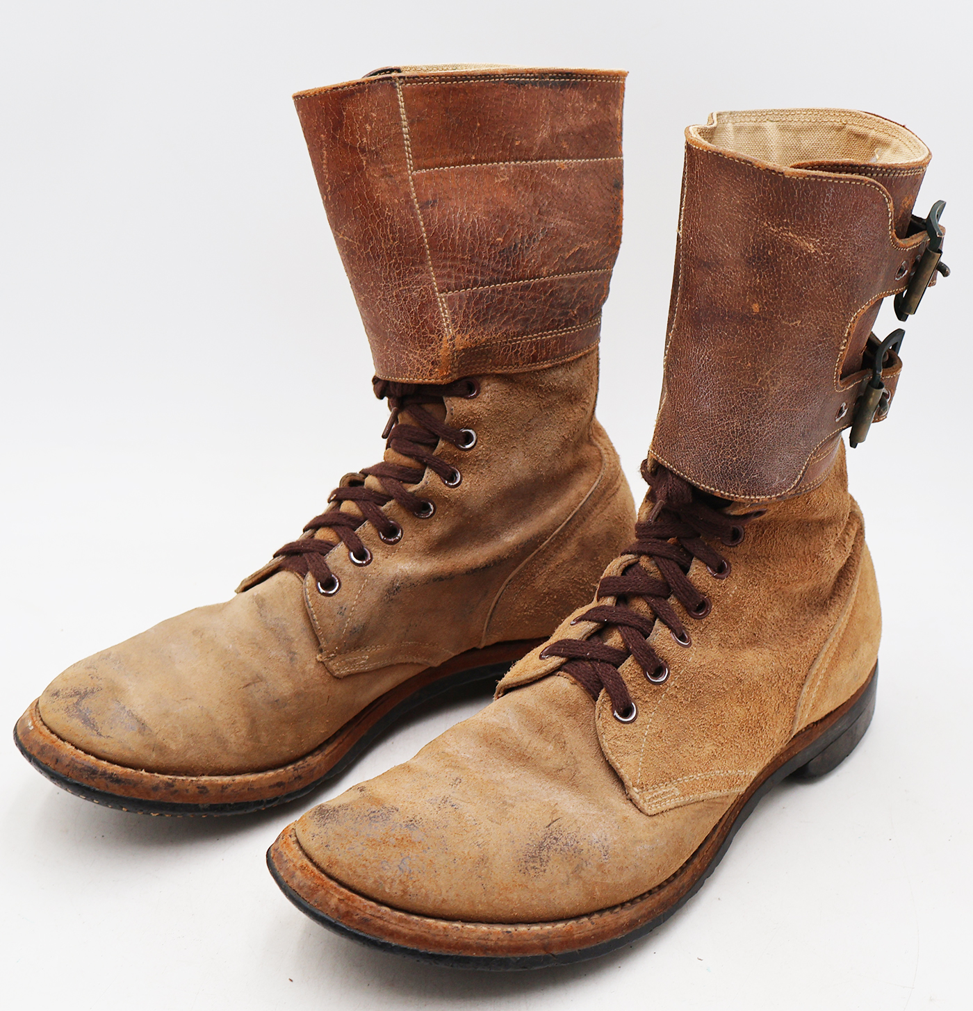 WWII Army Light Shade Double Buckle Boots. The leather is worn from usage, but is still supple. Soles are a bit stiff, but in good condition. They measure to about a size 10. Boots have hardly been worn, hence the light shade. Excellent display boots.