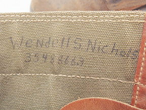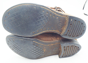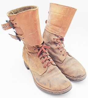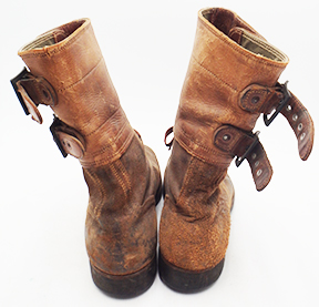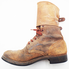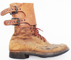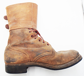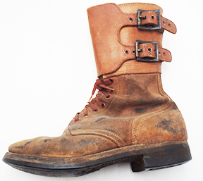 WWII Army Named Double Buckle Boots. The leather is worn, but is still very supple. Laces are in great shape. They are size 8 1/2 EE and the soles are marked HTS. Soles are worn but in good condition. Great display condition.