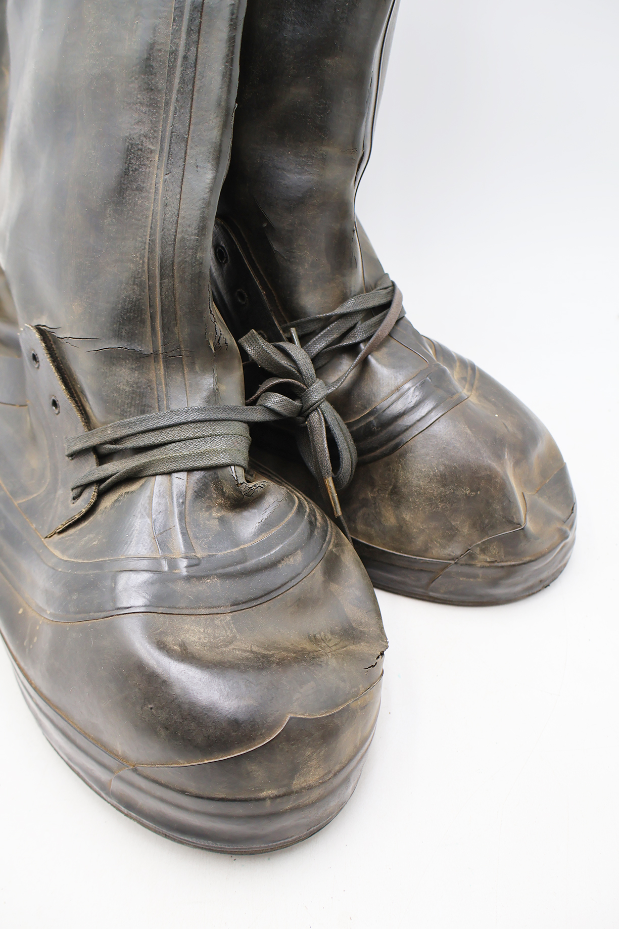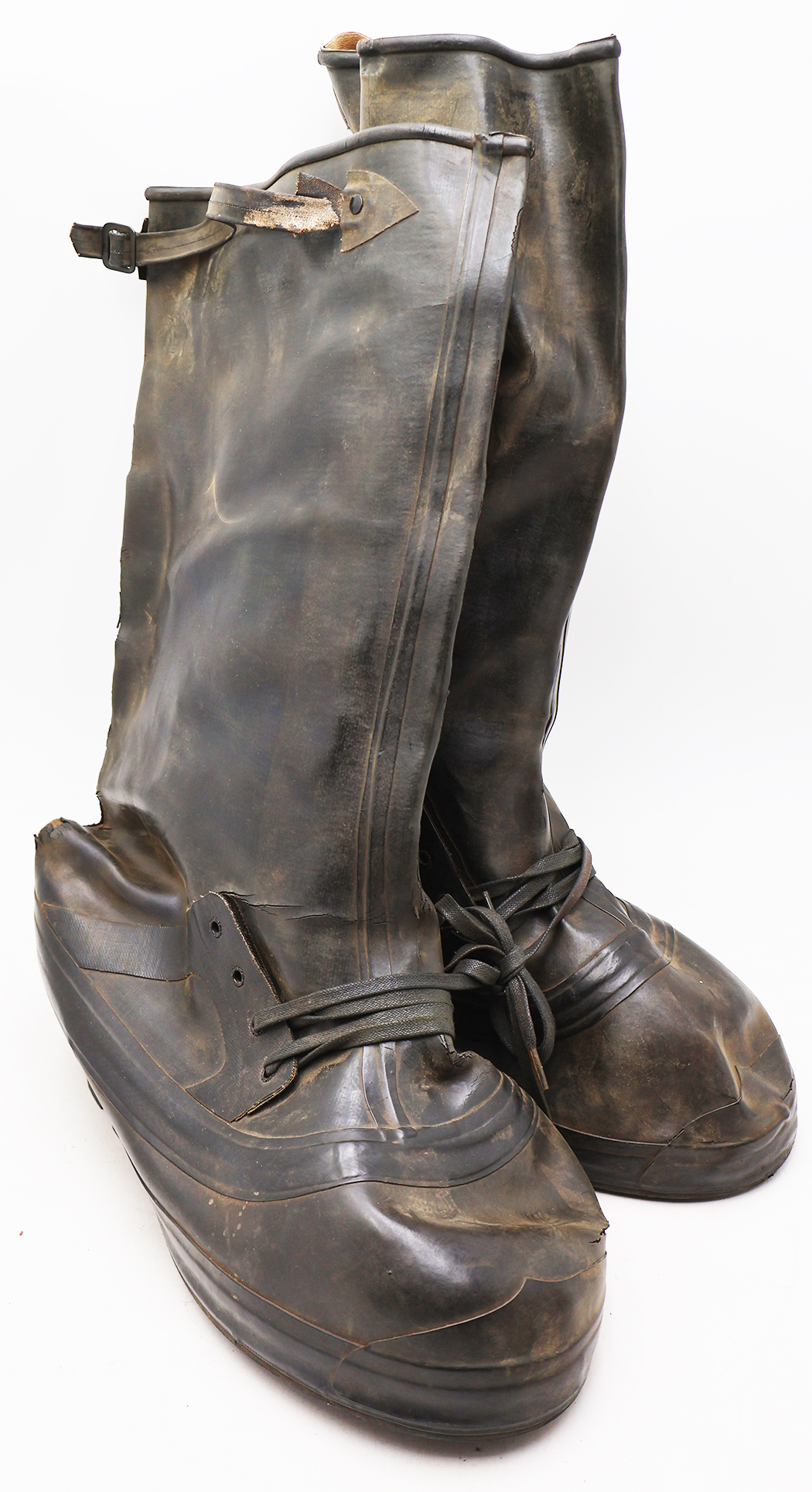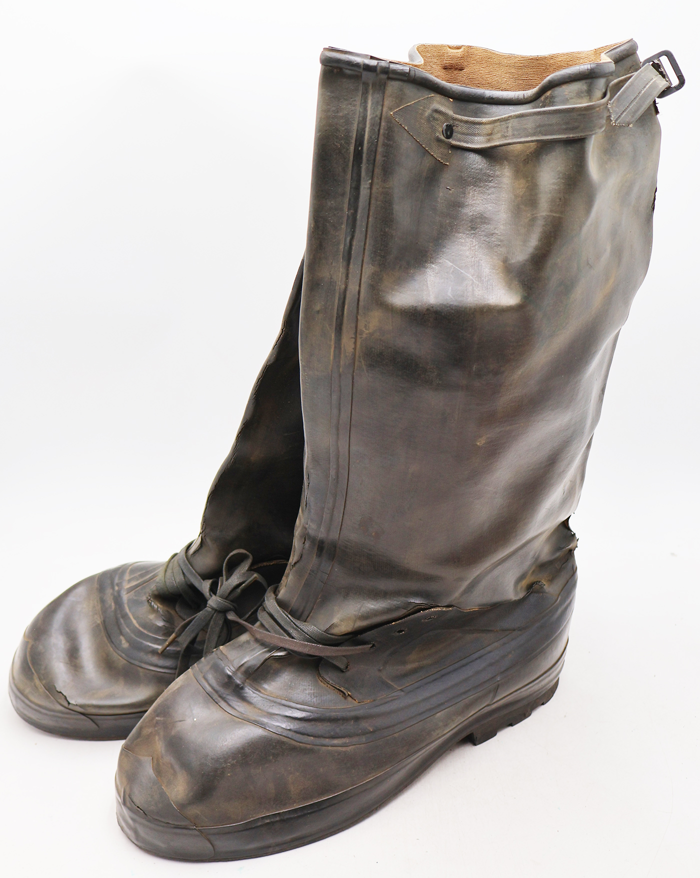 WWII era US Navy N-1 Sea Boots worn with the foul weather uniform. Rubber overshoes are in solid condition with wear from usage. Rubber body is still very supple, but the soles are stiff and parts of the boots are cracking. Labelled a size Large.