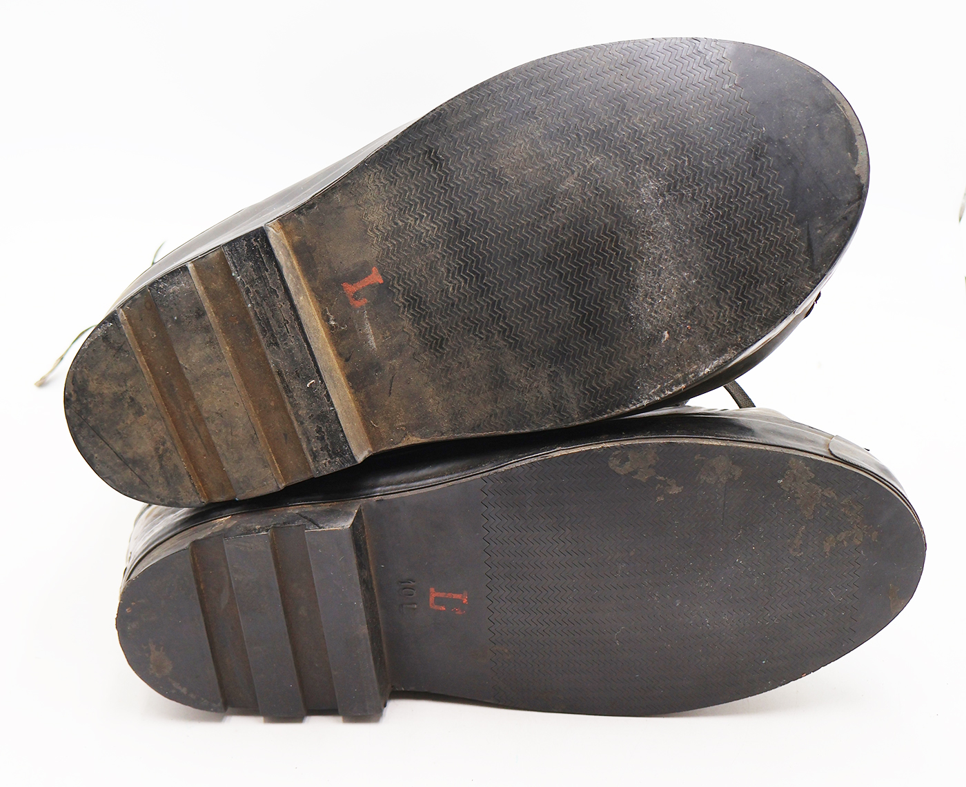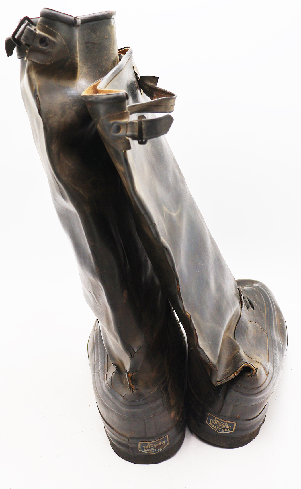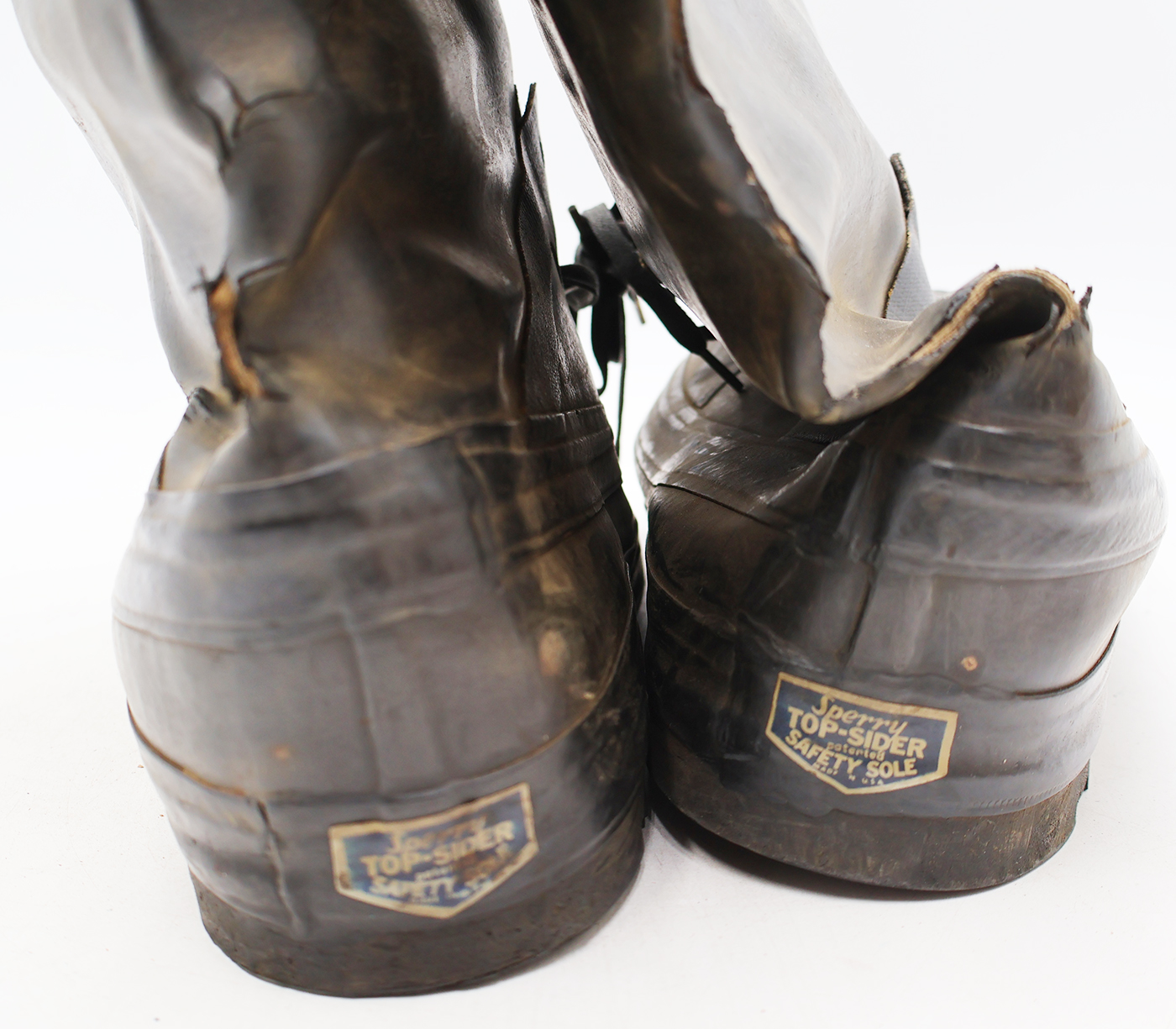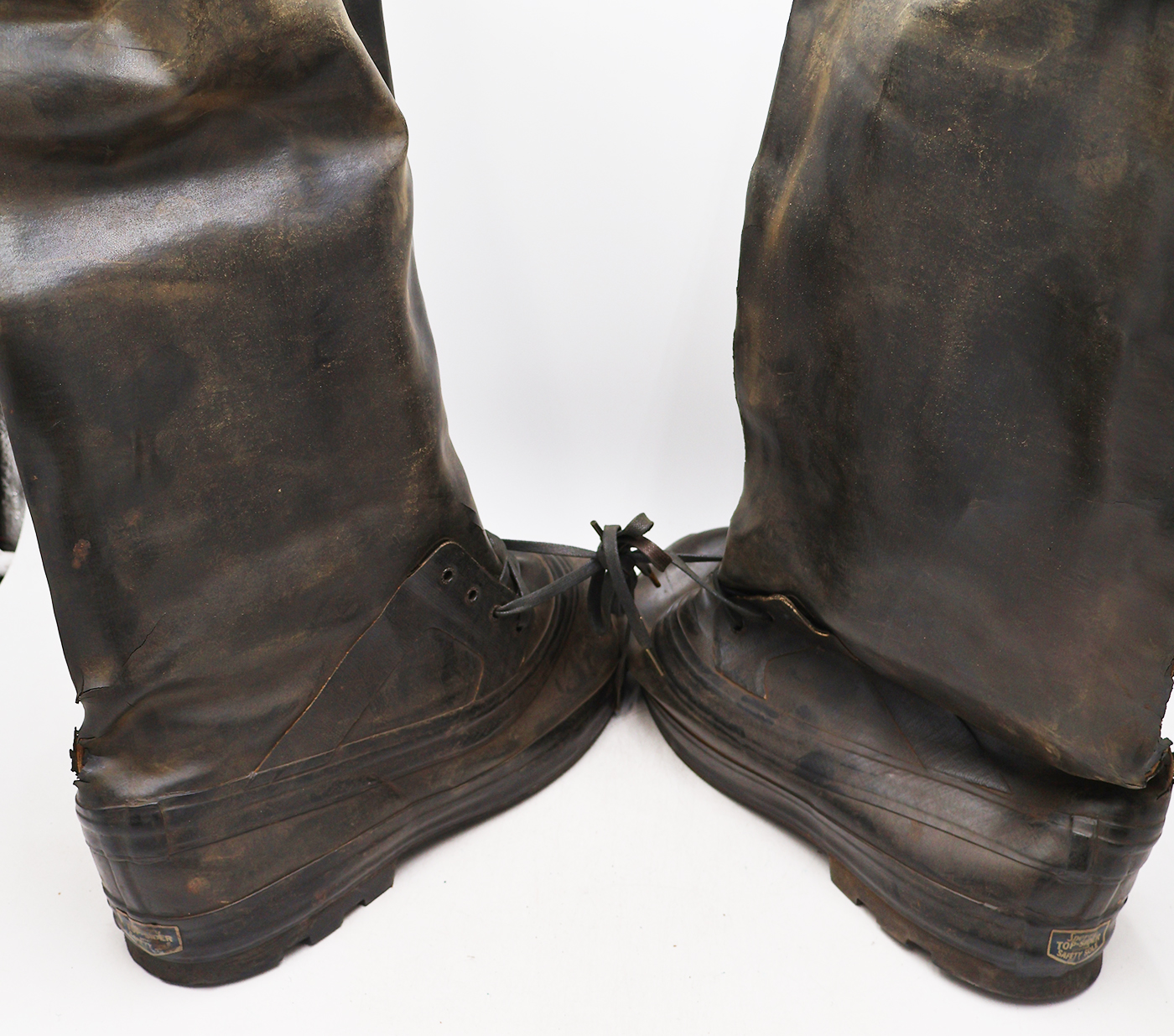 WWII era US Navy N-1 Sea Boots worn with the foul weather uniform. Rubber overshoes are in solid condition with wear from usage. Rubber body is still very supple, but the soles are stiff and parts of the boots are cracking. Labelled a size Large.
