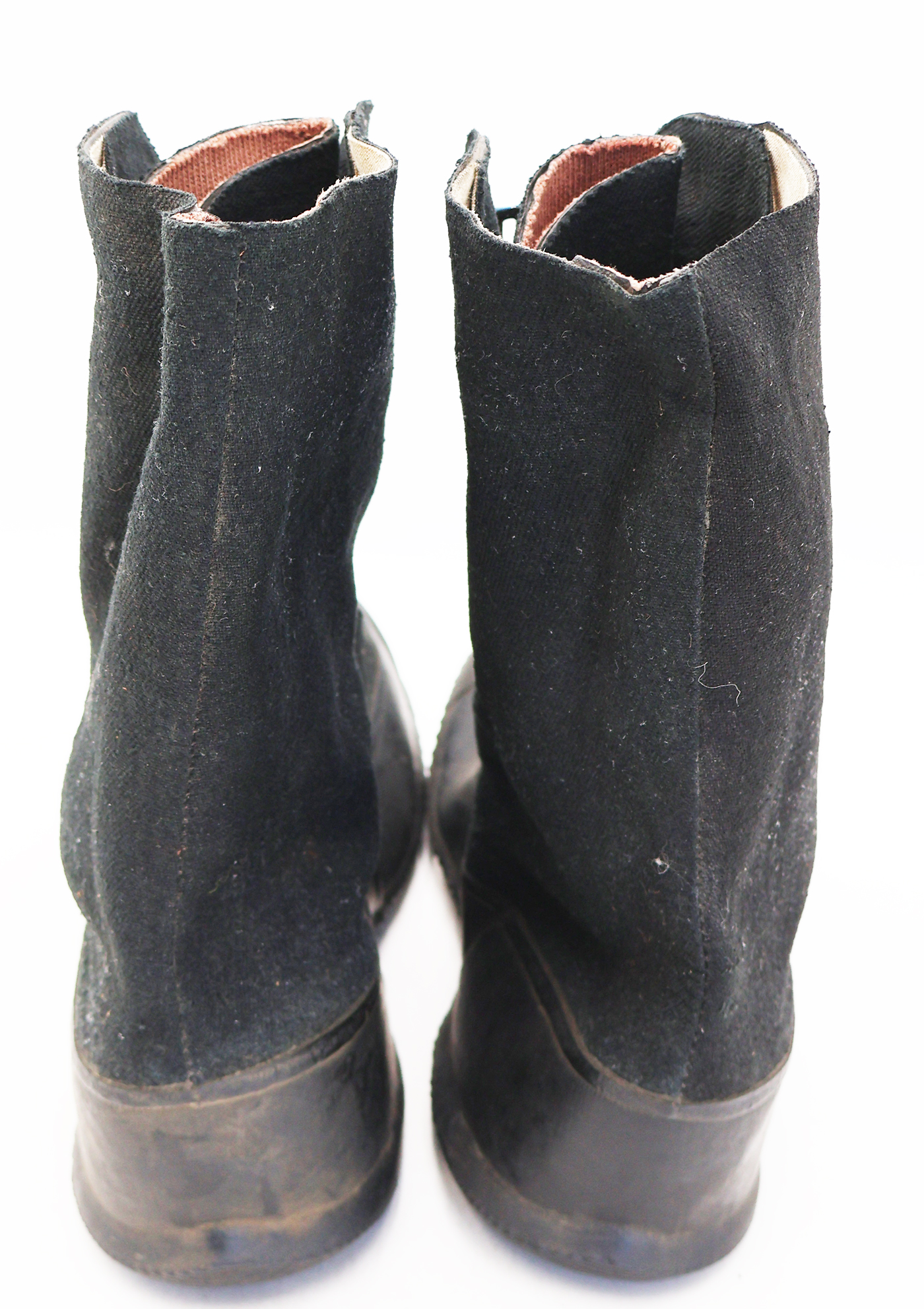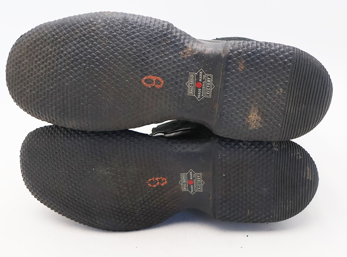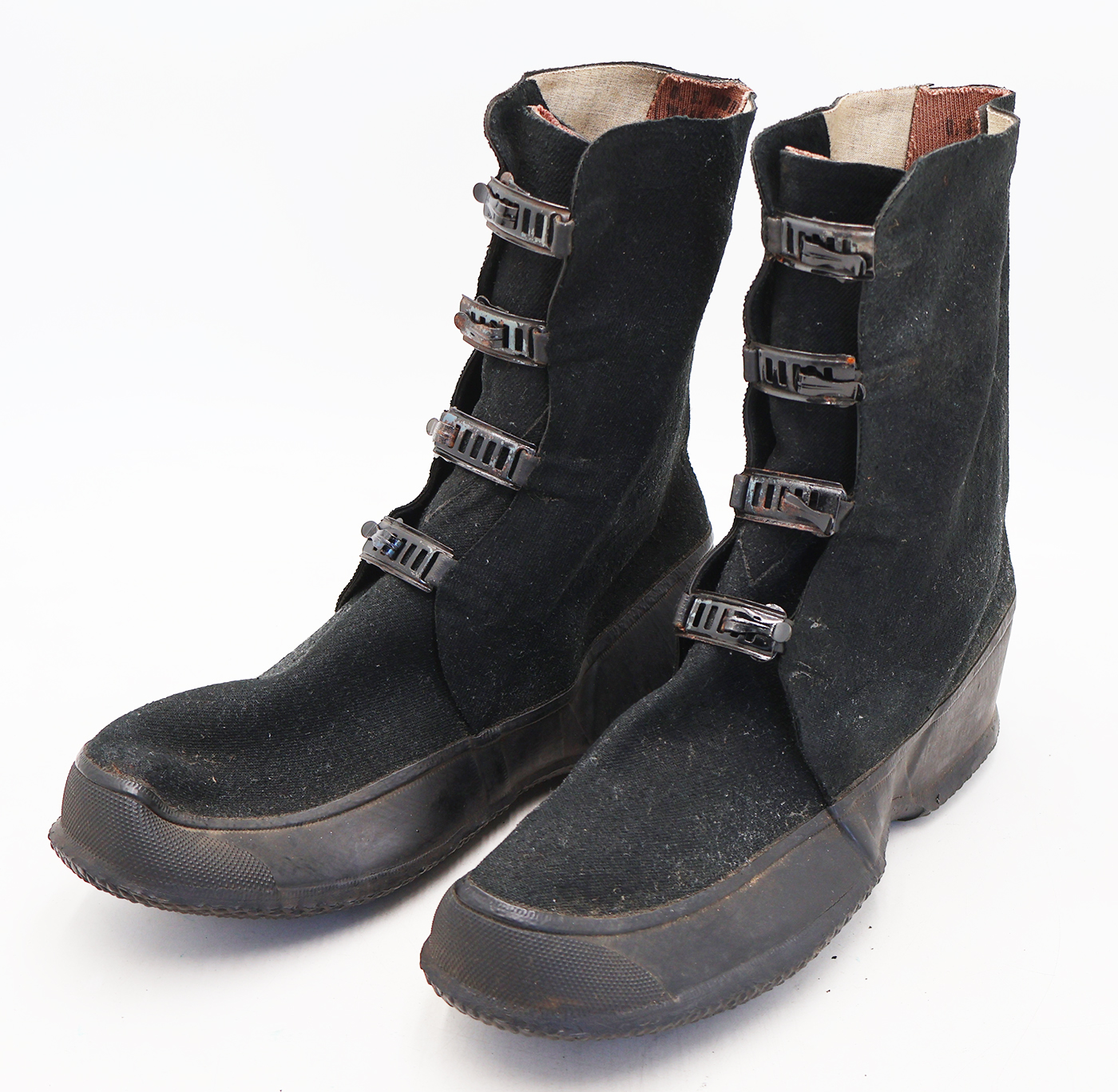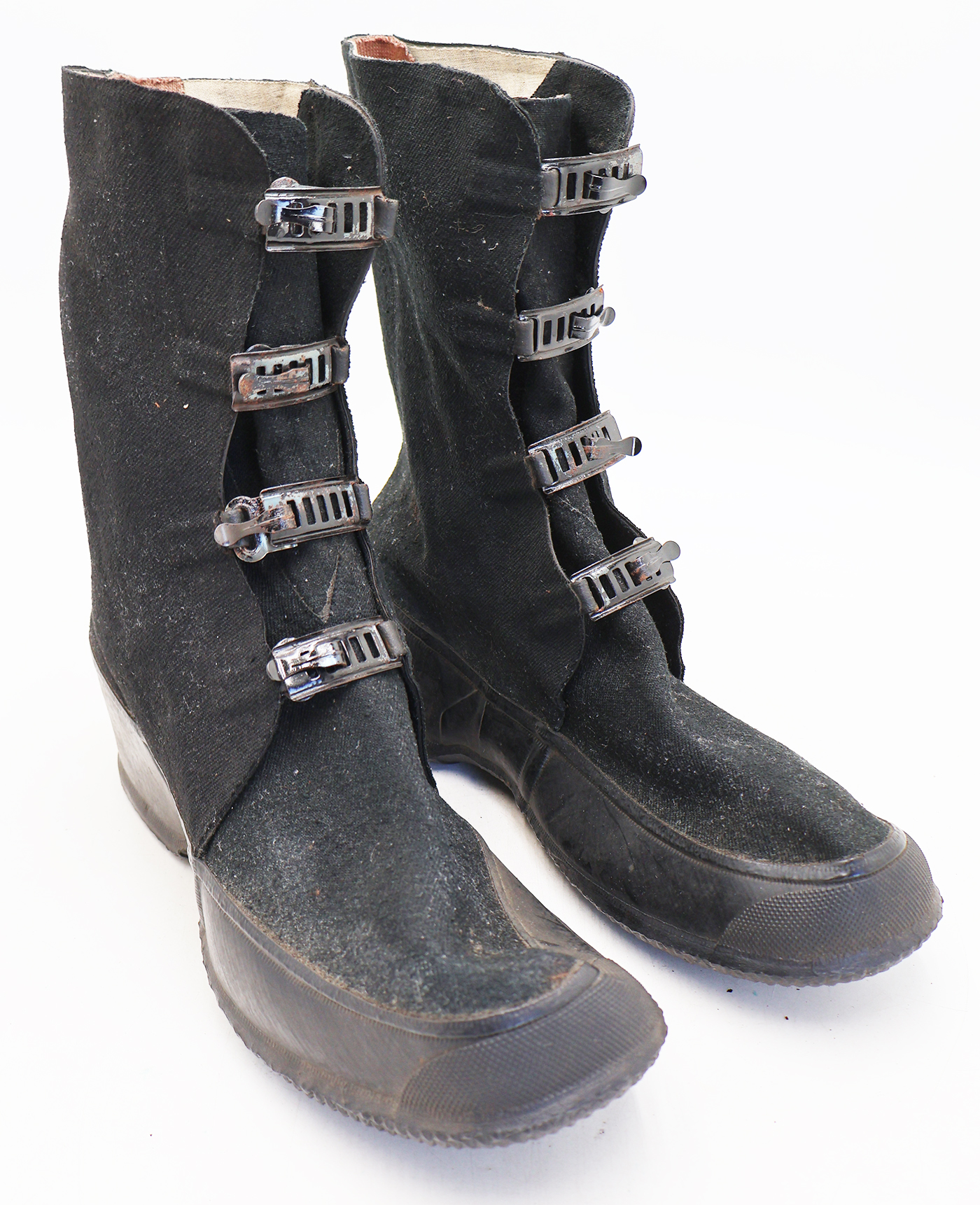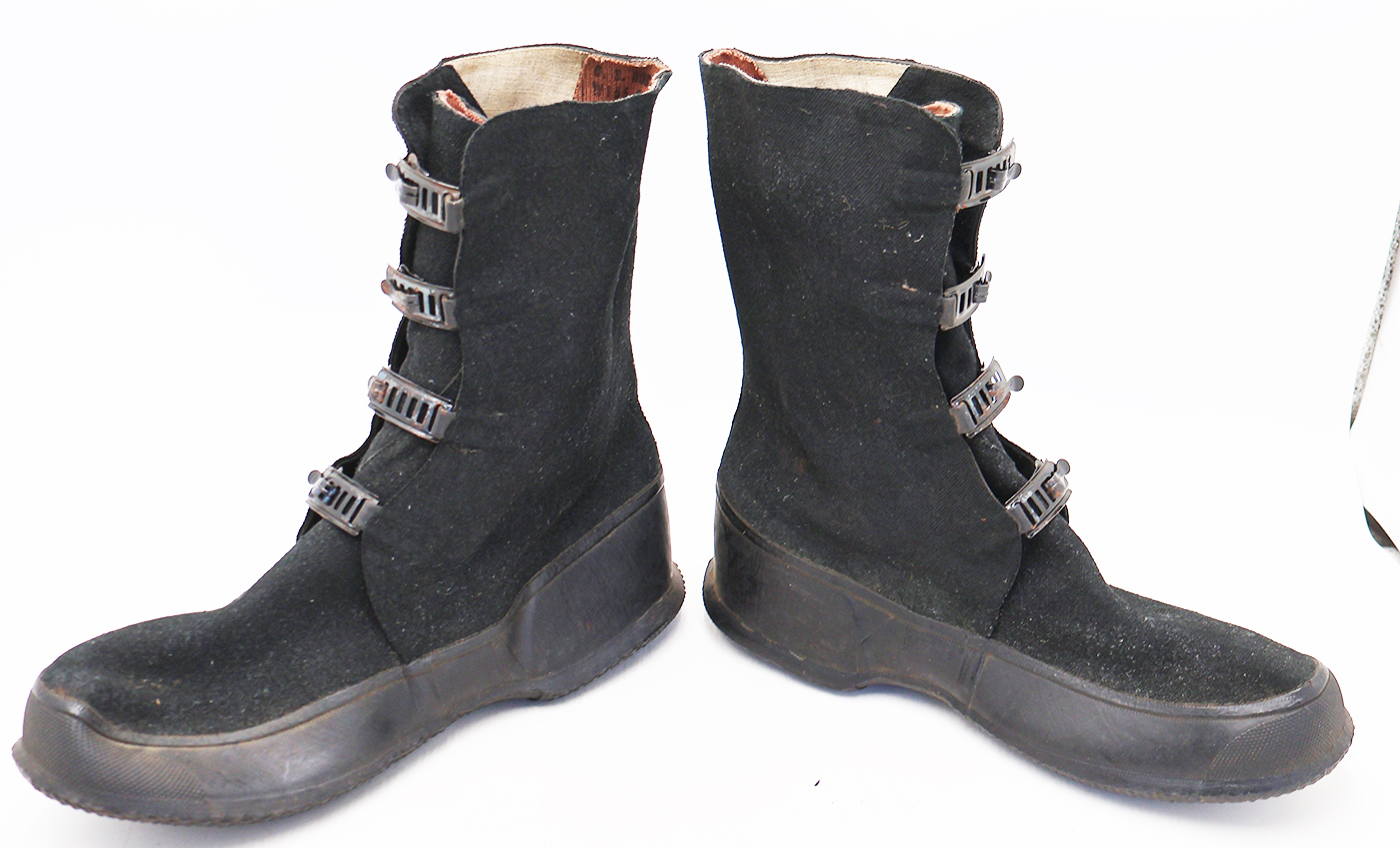 WWII Army Winter Overshoes. The rubberized canvas is in good condition with no notable wear. They are still very supple. They are size 9 and the soles are marked BALL-BAND VICTORY. Metal parts are in good shape with some surface rust. Soles are in very good condition. Dated 1942.