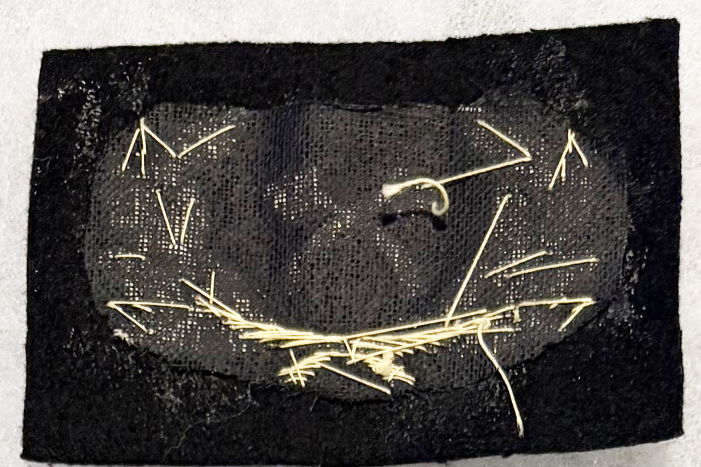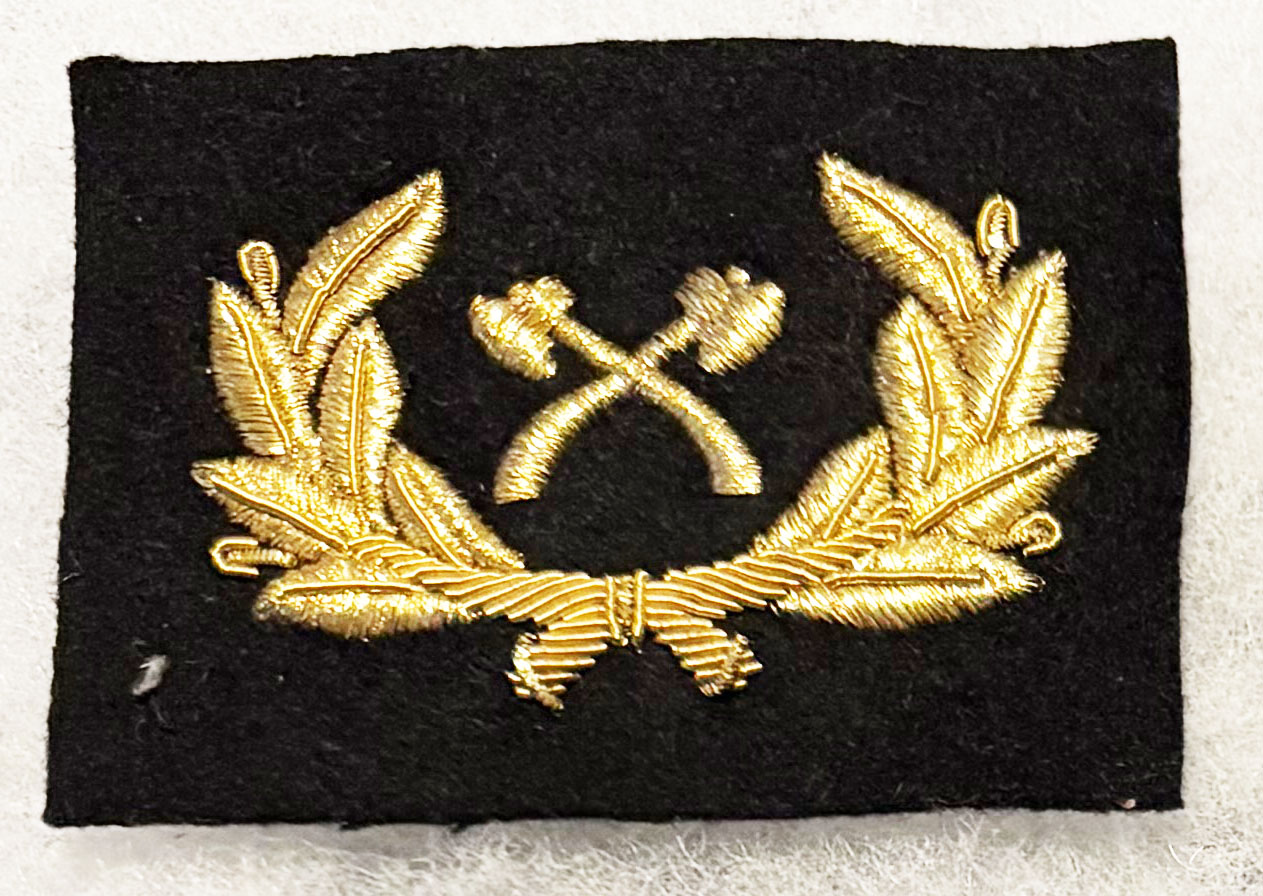 WWII US Army Transport Service / ATS Bullion Officers Carpenter Cap Badge. About two by three inches. Black wool background with gold embroidered details. Unused.